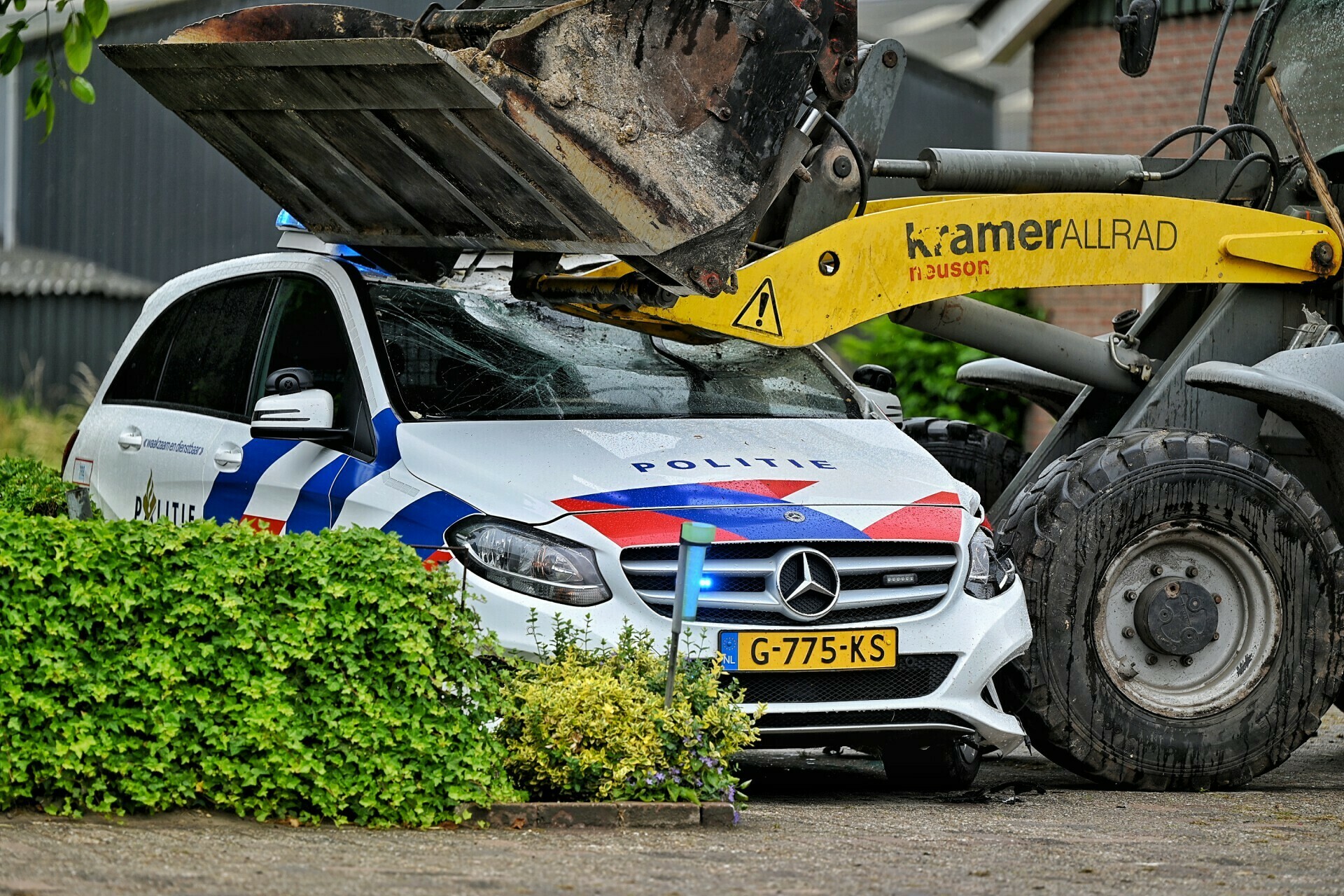 De politieauto mag als verloren worden beschouwd na de charge van de verdachte met een graafmachine. De agenten kwamen er zonder kleerscheuren vanaf.