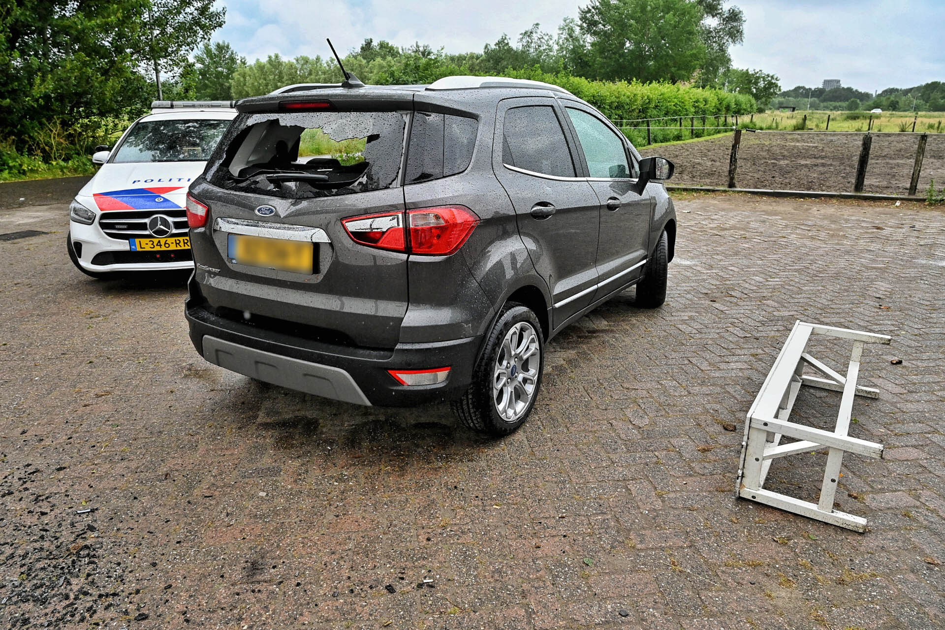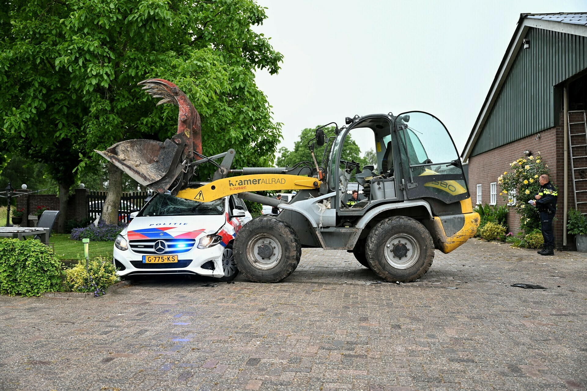 De politieauto mag als verloren worden beschouwd na de charge van de verdachte met een graafmachine. De agenten kwamen er zonder kleerscheuren vanaf.