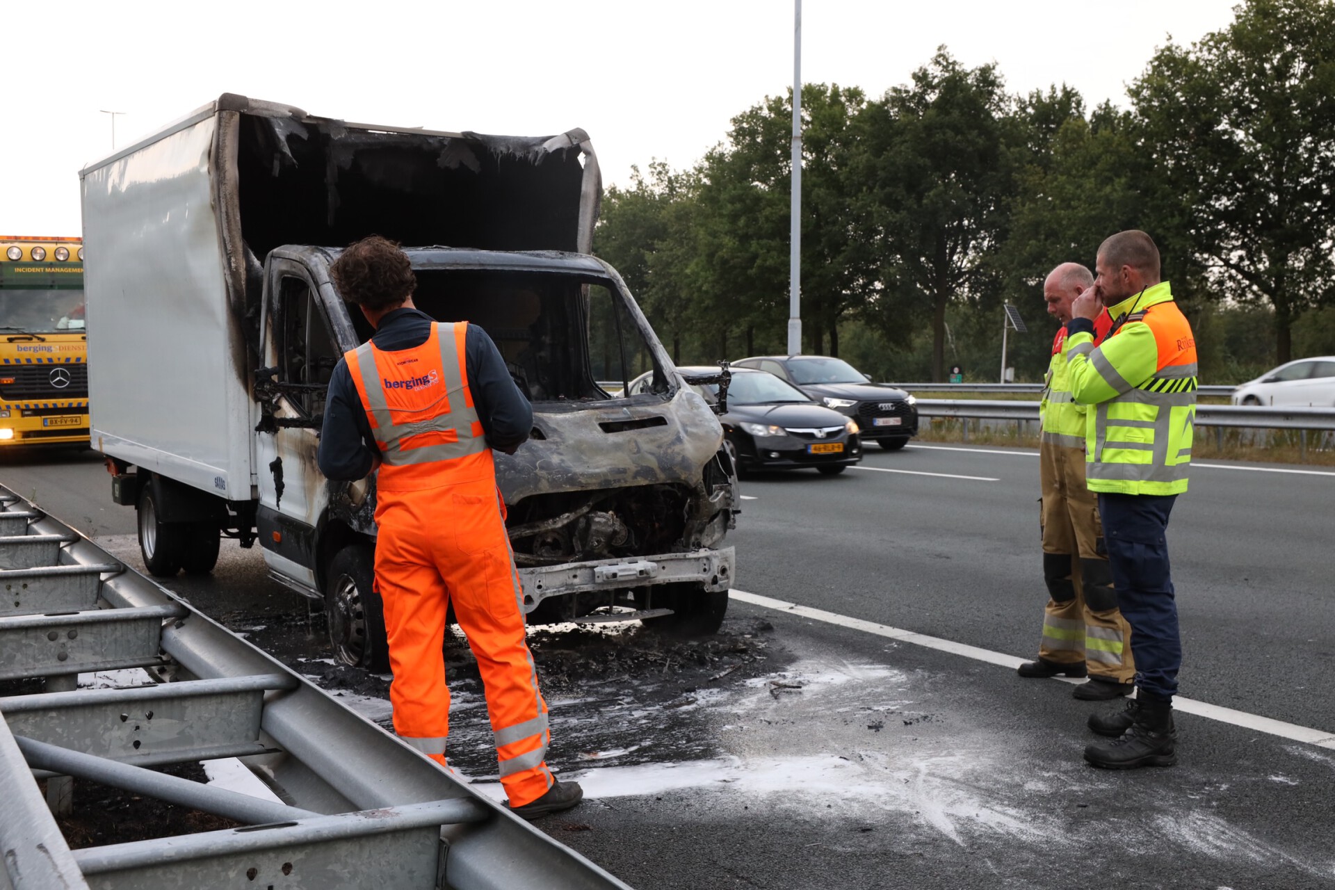 Van de bakwagen bleef niets over, beide inzittende bleven ongedeerd. Een bergingsbedrijf is ter plaatse en zal het volledig afgebrande voertuig afvoeren. De rechterrijstrook is door de brand dicht.