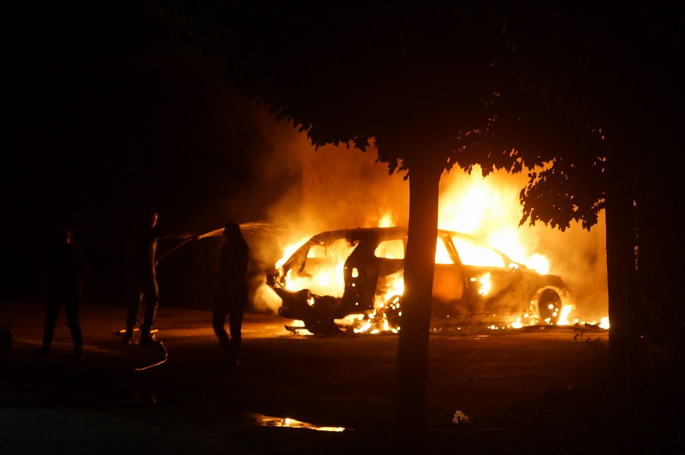 Bewoners halen met een mobiele kraan brandende auto uit schuur