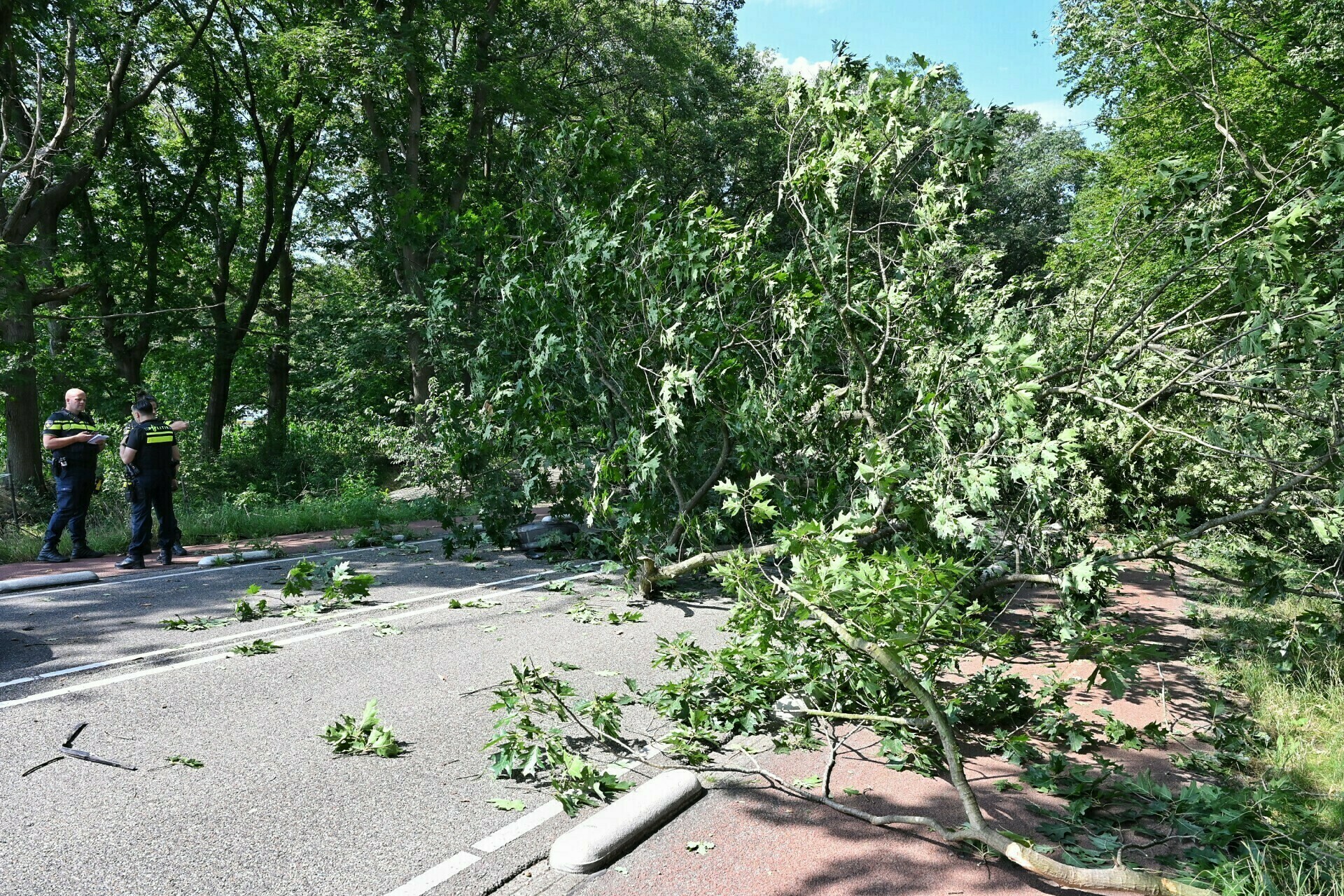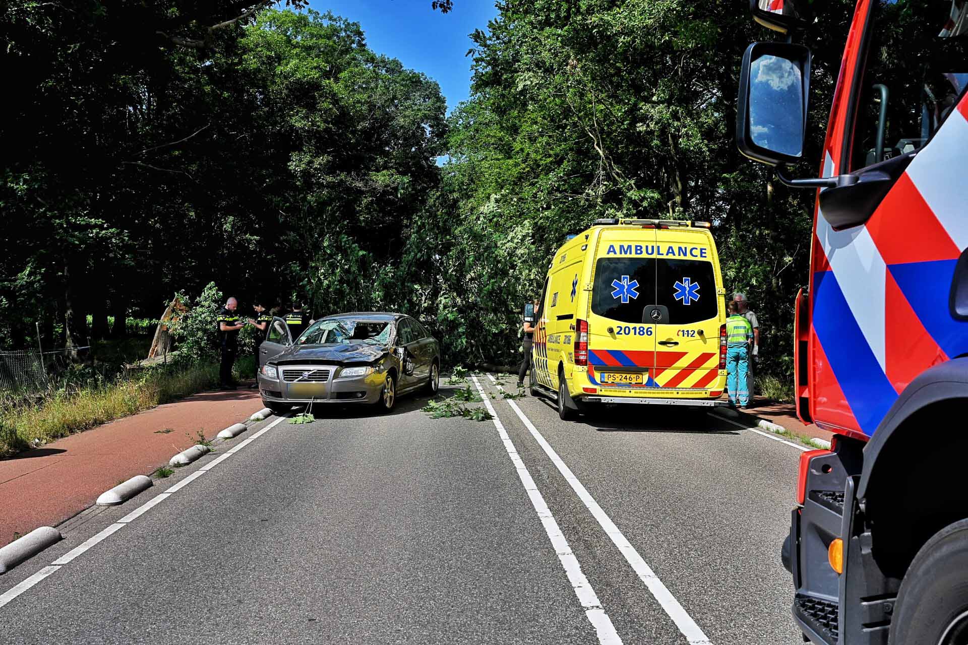 Een dikke tak belandde op de rijdende auto. „Wonder boven wonder bleef het letsel van de moeder en zoon bij wat schrammen”, aldus de agenten via Facebook.