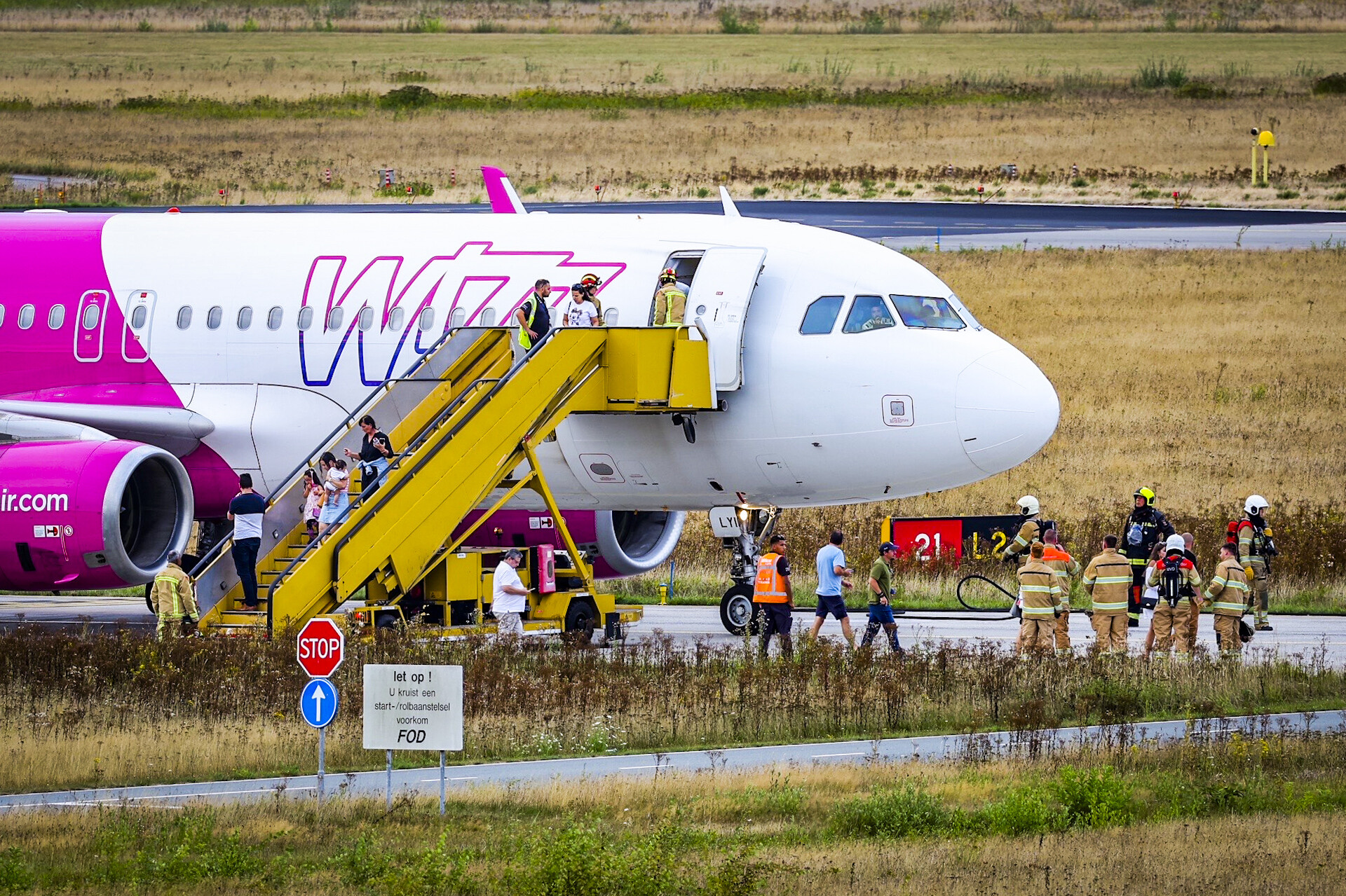 De ongeveer 180 inzittenden zijn uit het vliegtuig gehaald, dat stil kwam te staan tussen de startbaan en het platform. Het incident heeft volgens de woordvoerder geen invloed op andere vluchten. Of het vliegtuig van Wizz Air zondagavond nog zal vertrekken richting Boedapest is onbekend.