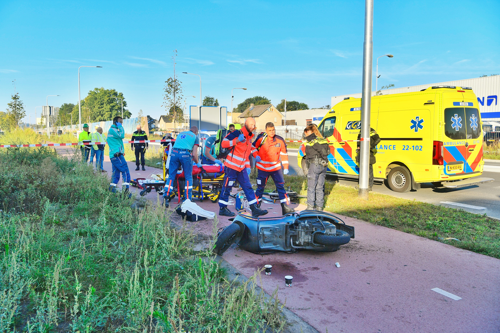 De hulpdiensten werden gealarmeerd voor een ongeval tussen een fietser en een scooterrijder. Er kwam een traumahelikopter naar de plek van het ongeluk om hulp te verlenen.Β Onbekend is hoe het ongeval heeft kunnen gebeuren.