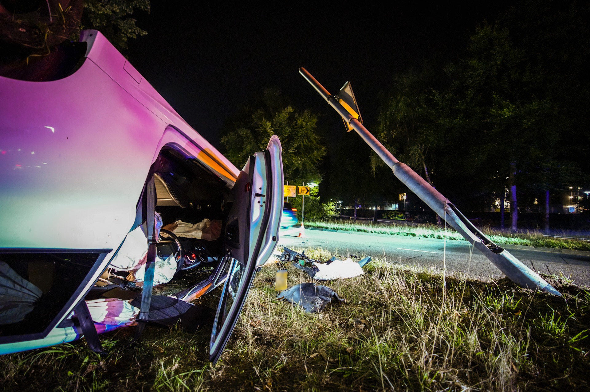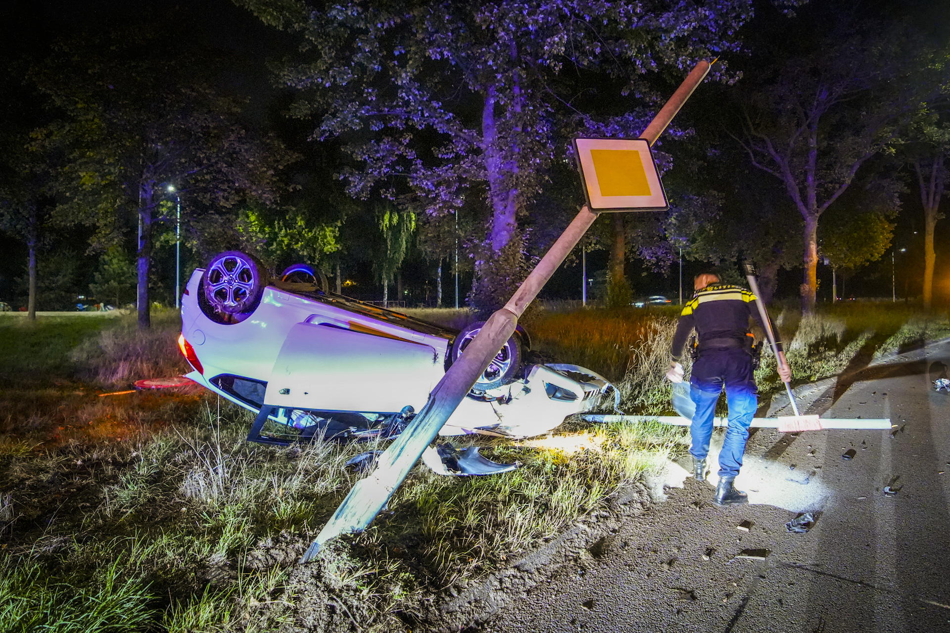 De auto wordt geborgen. Ook moet de lantaarnpaal die half over de weg hangt, worden weggehaald.