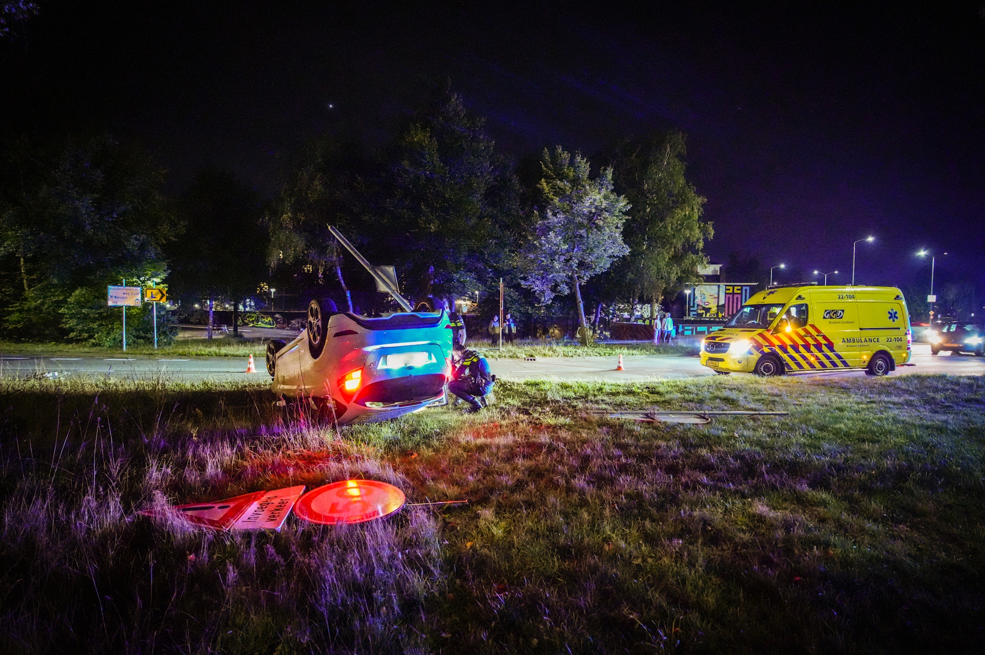 De bestuurder reed vanaf de Berenkuil de Eisenhowerlaan op en verloor de macht over het stuur. Hij raakte met zijn auto van de weg, reed een paar verkeersborden uit de grond en vloog daarna met zijn auto over de kop. De hulpdiensten waaronder de politie, een ambulance en de brandweer kwamen naar het ongeluk. Wonderbaarlijk genoeg wist de jonge bestuurder zelf uit de auto te kruipen. Hij is nagekeken in de ambulance, maar kwam met de schrik vrij.