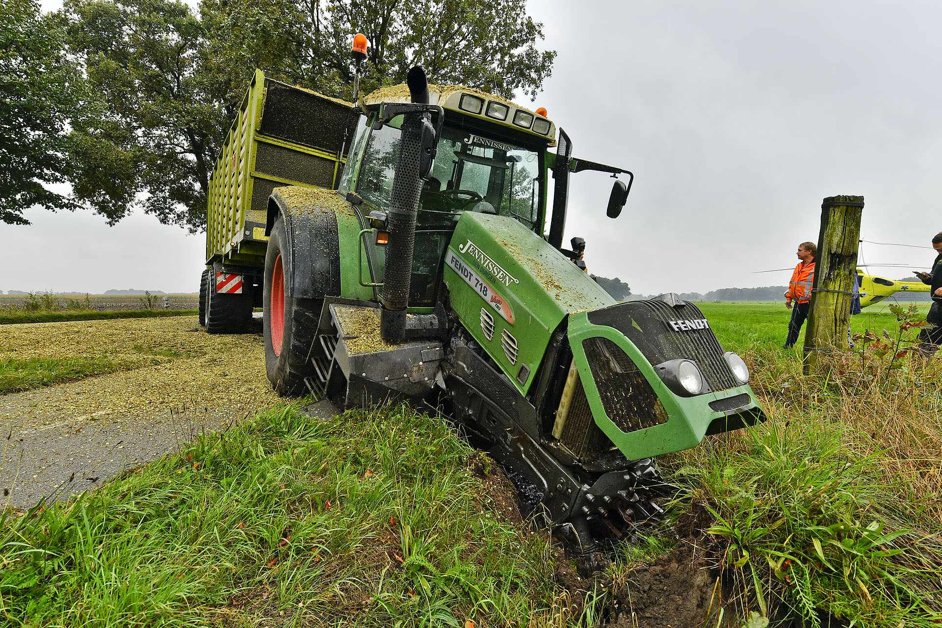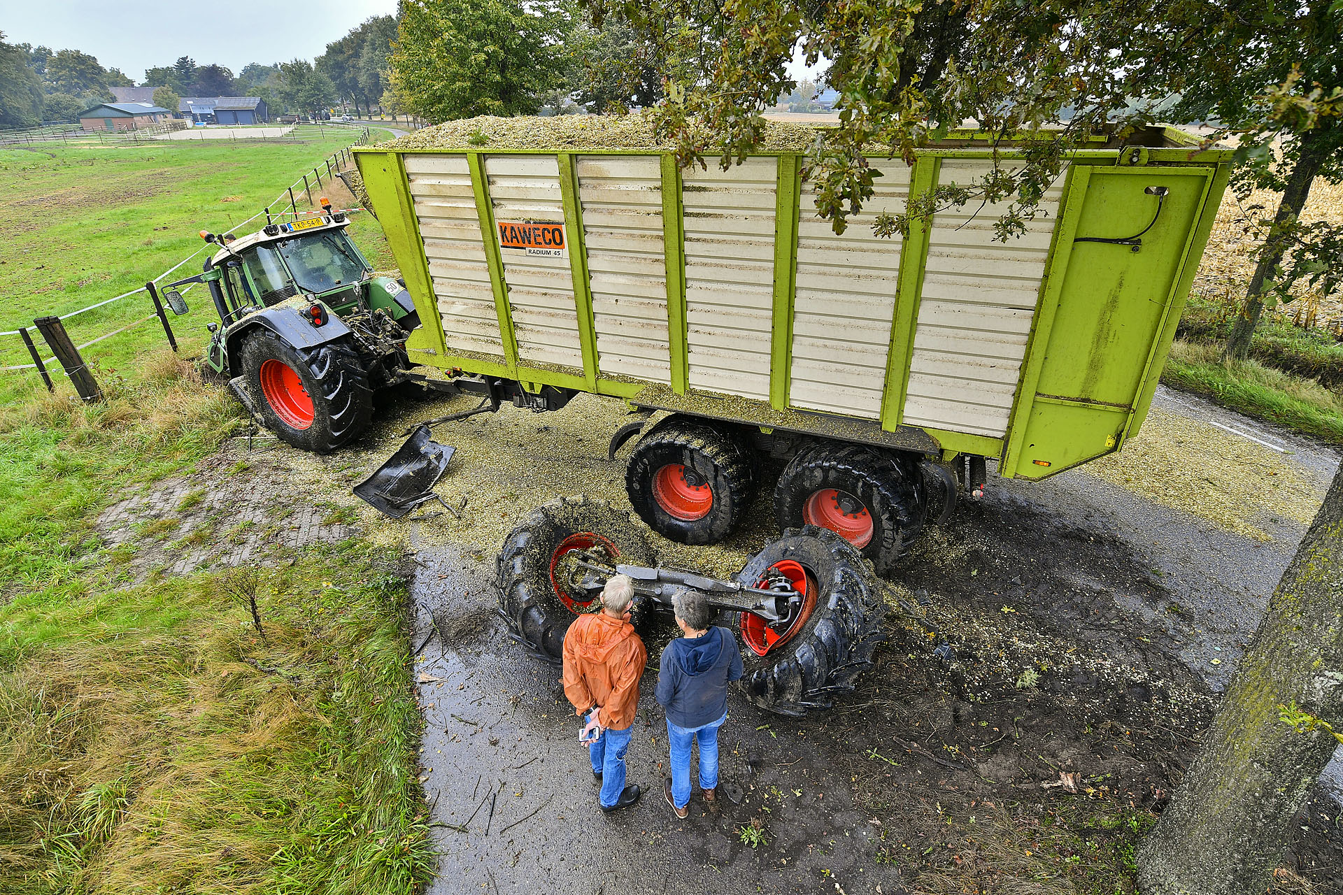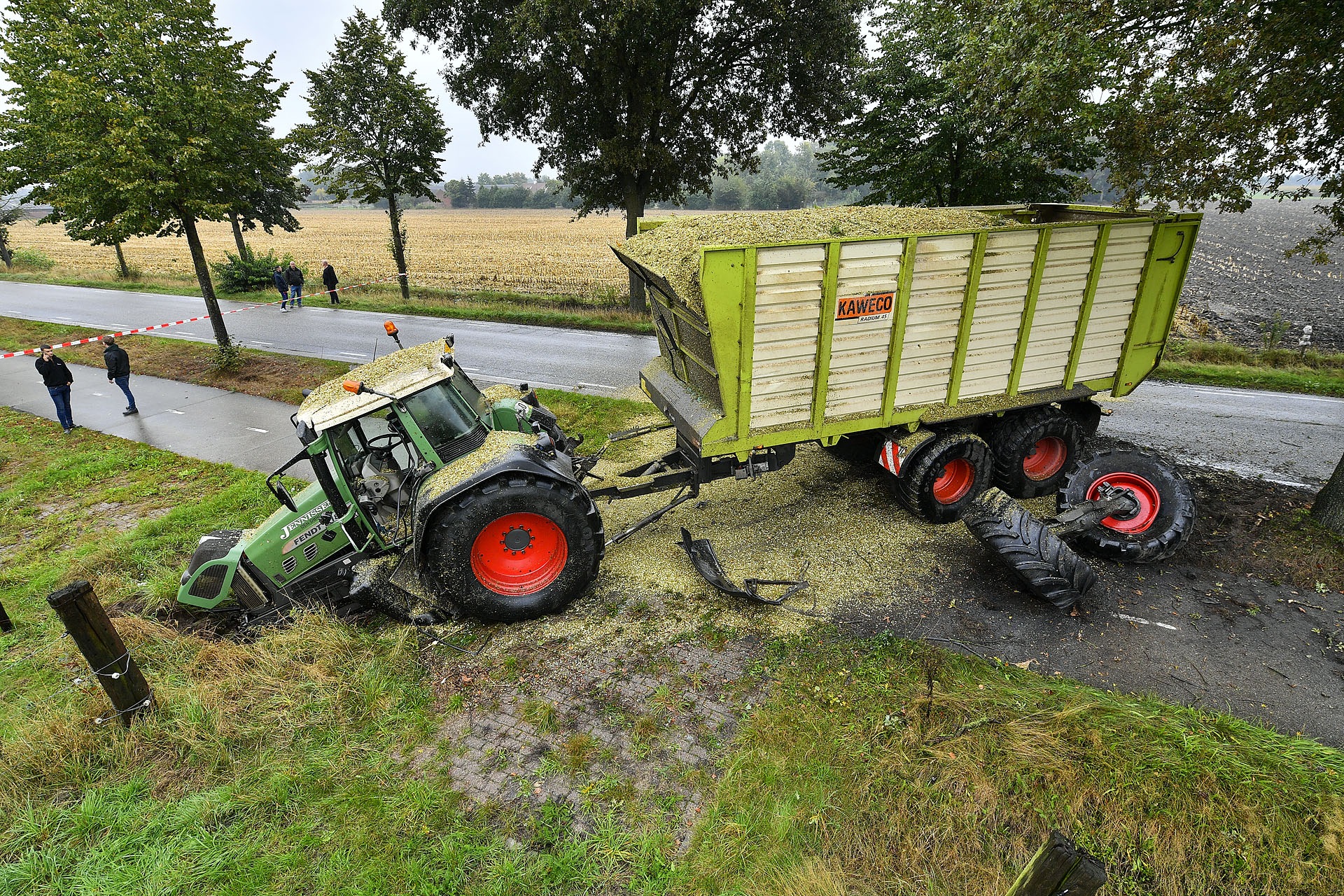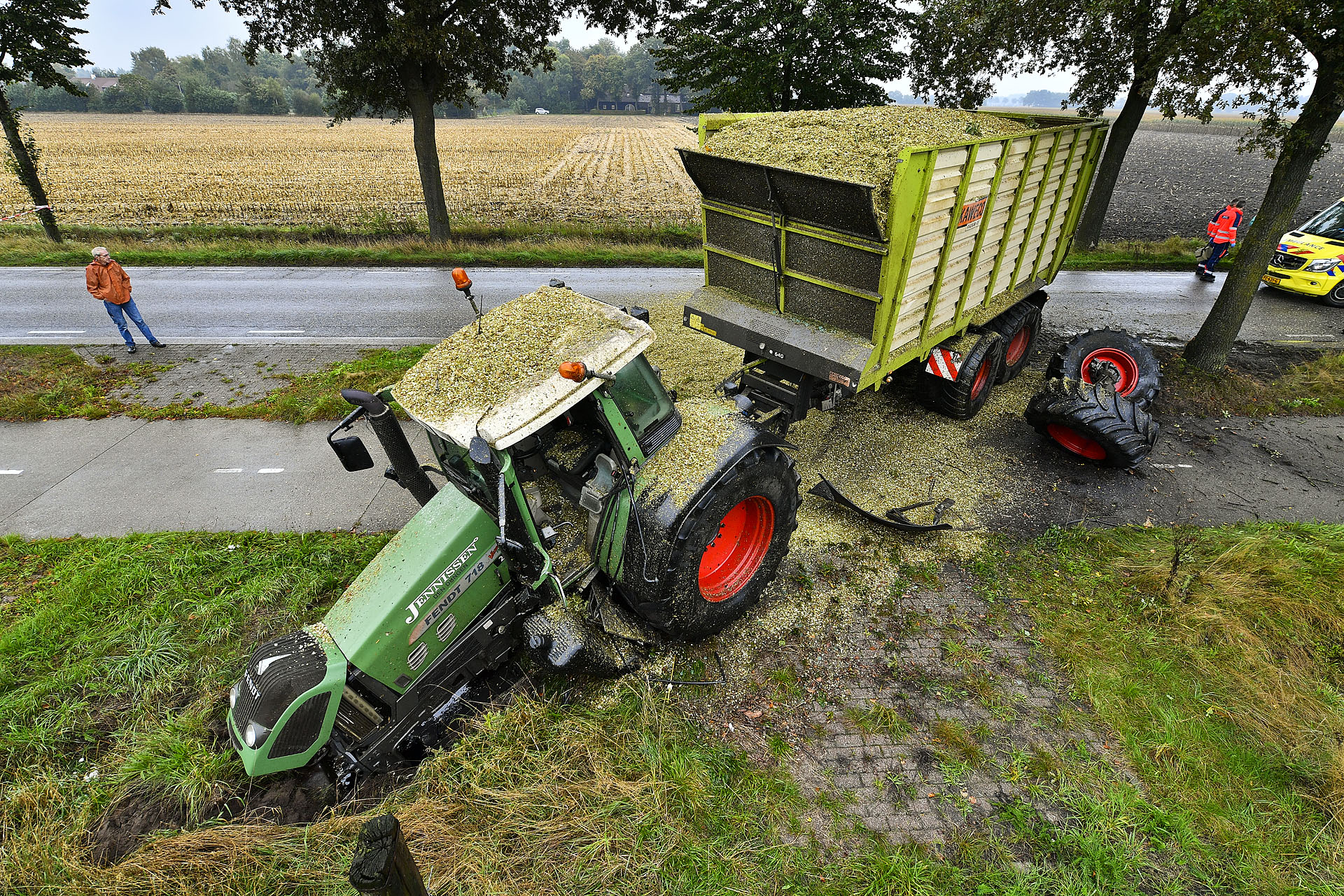 De weg zal geruime tijd afgesloten zijn voor alle verkeer. De tractor vervoerde gekneusde mais. De politie doet onderzoek.