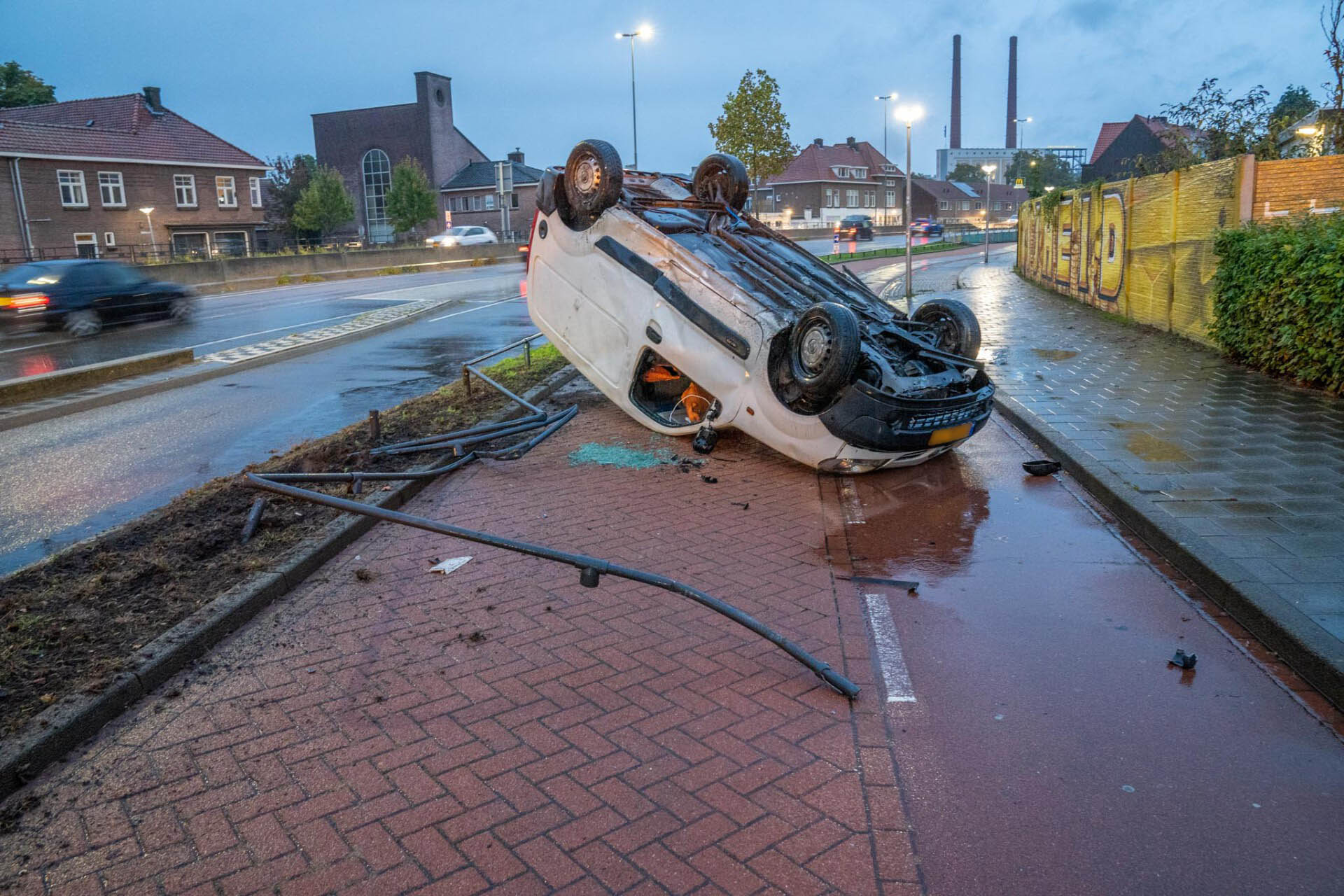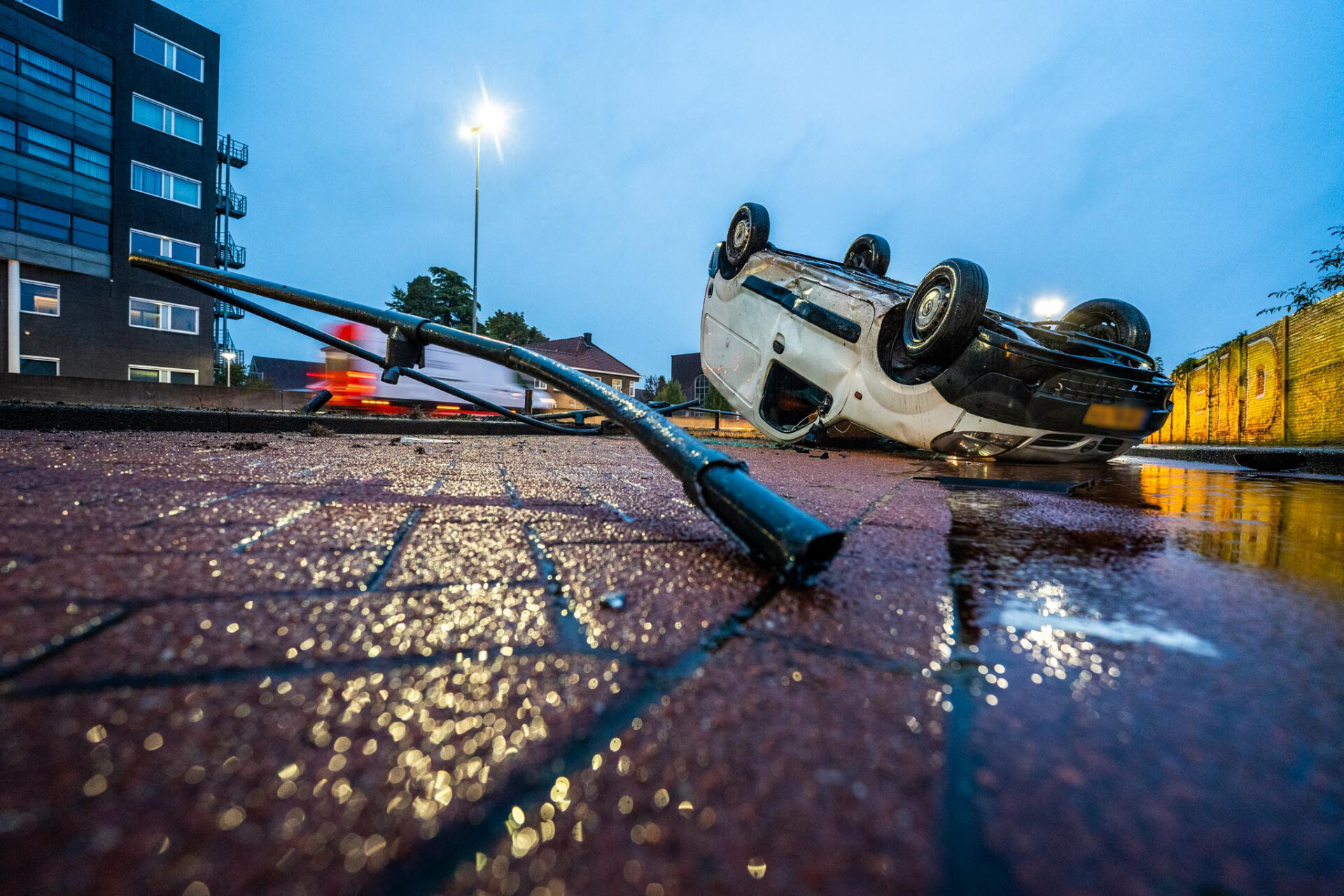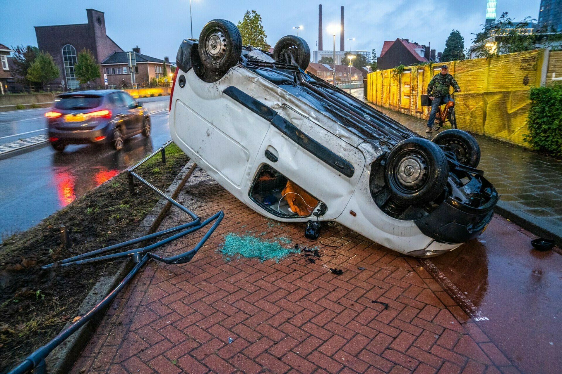 De bestuurder raakte de macht over het stuur kwijt en raakte een lading paaltjes. Vervolgens slaat het voertuig over de kop en komt op zijn dak tot stilstand.