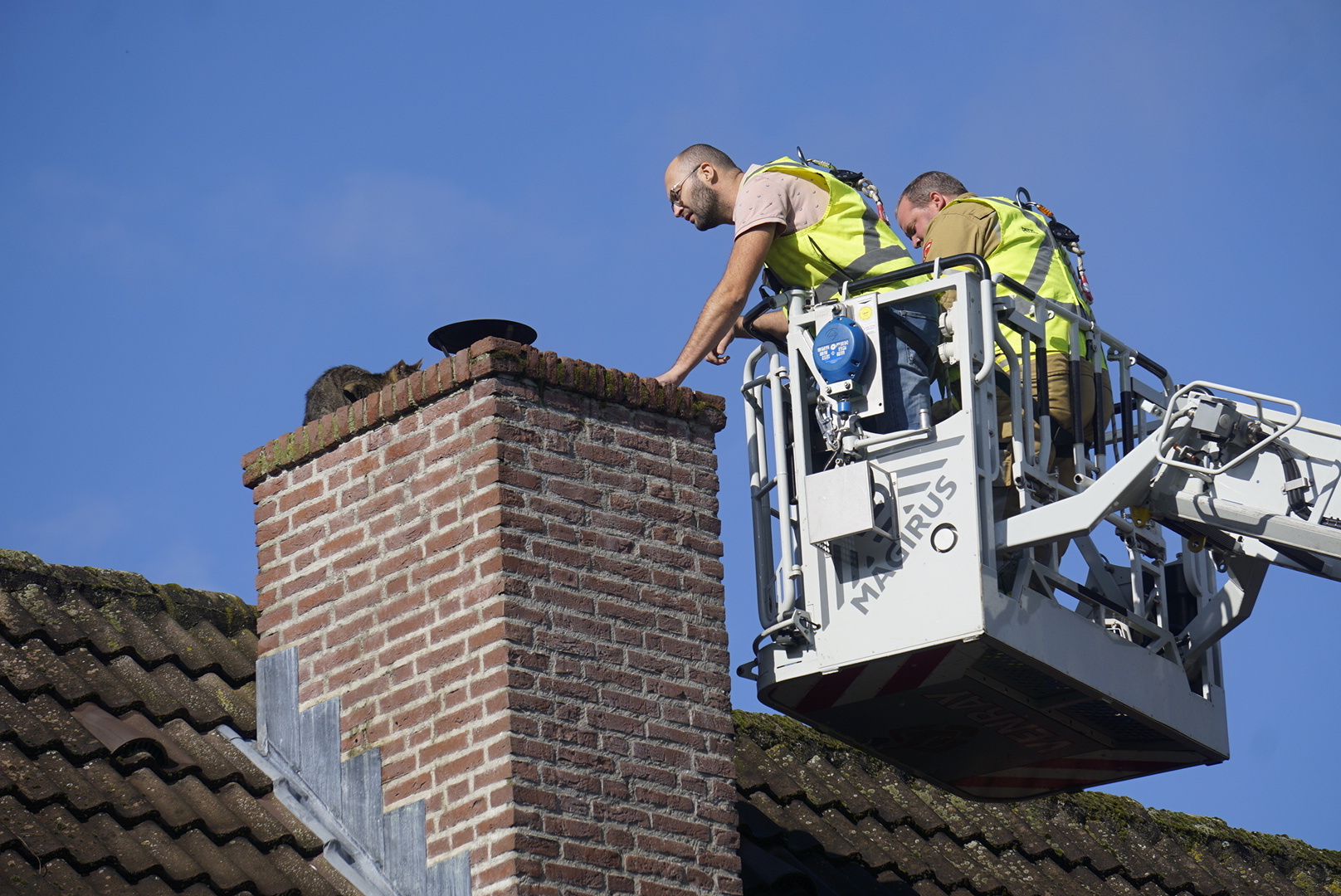 Brandweer haalt kat van schoorsteen