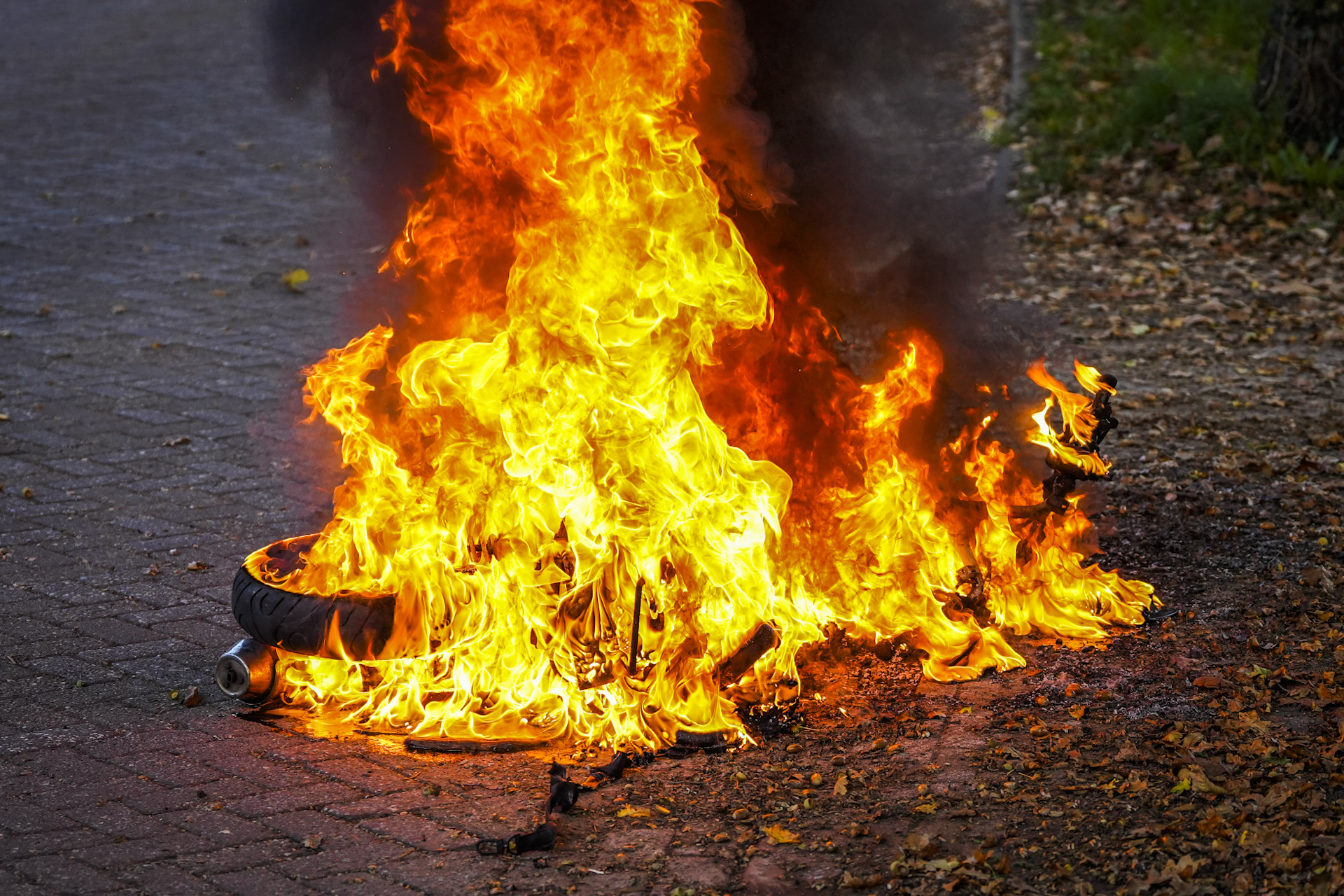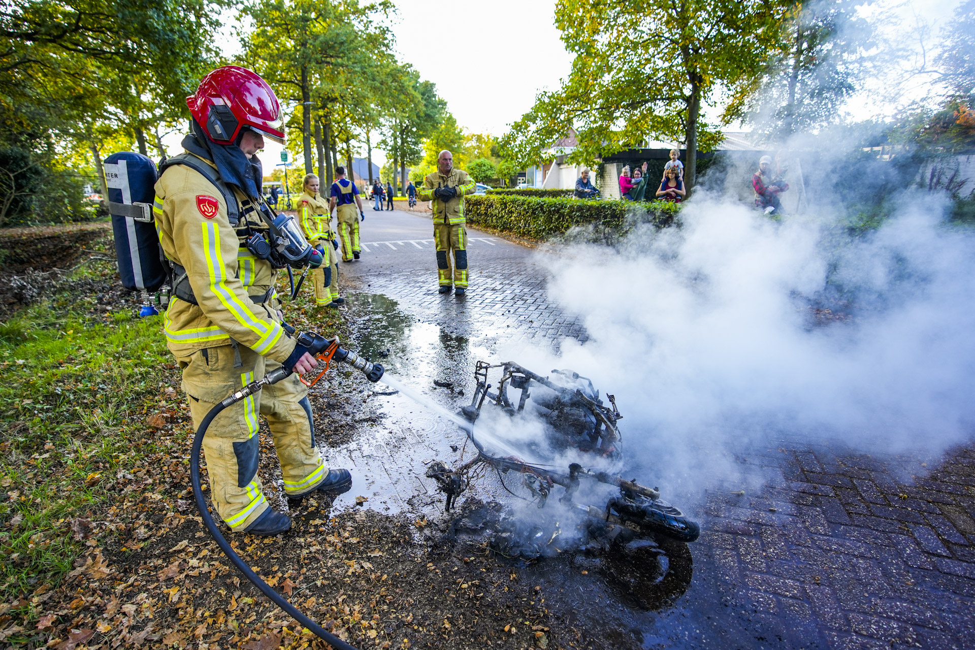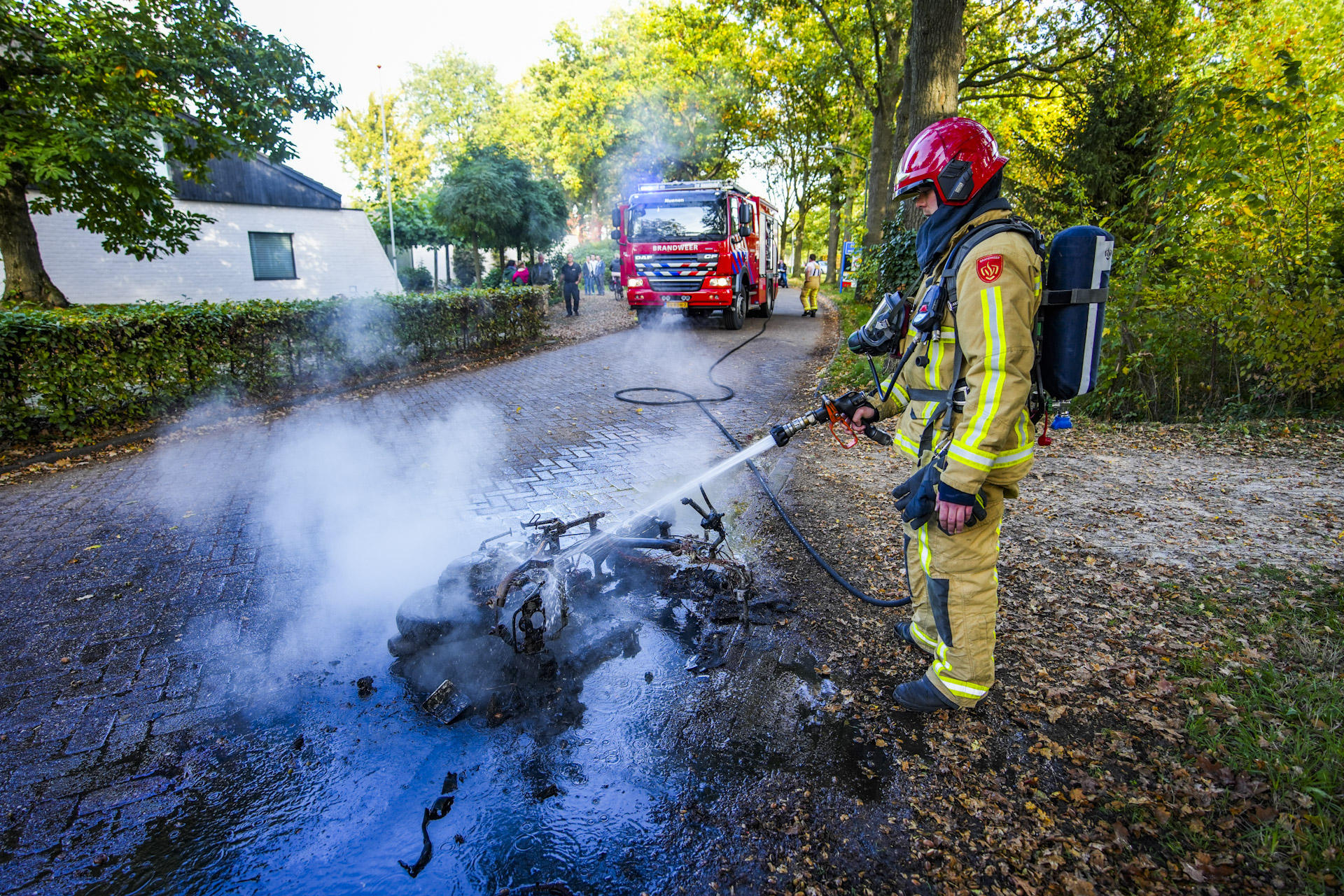 Nog voordat de brandweer ter plaatse was stond de scooter in lichterlaaie. Er is niks meer van overgebleven.