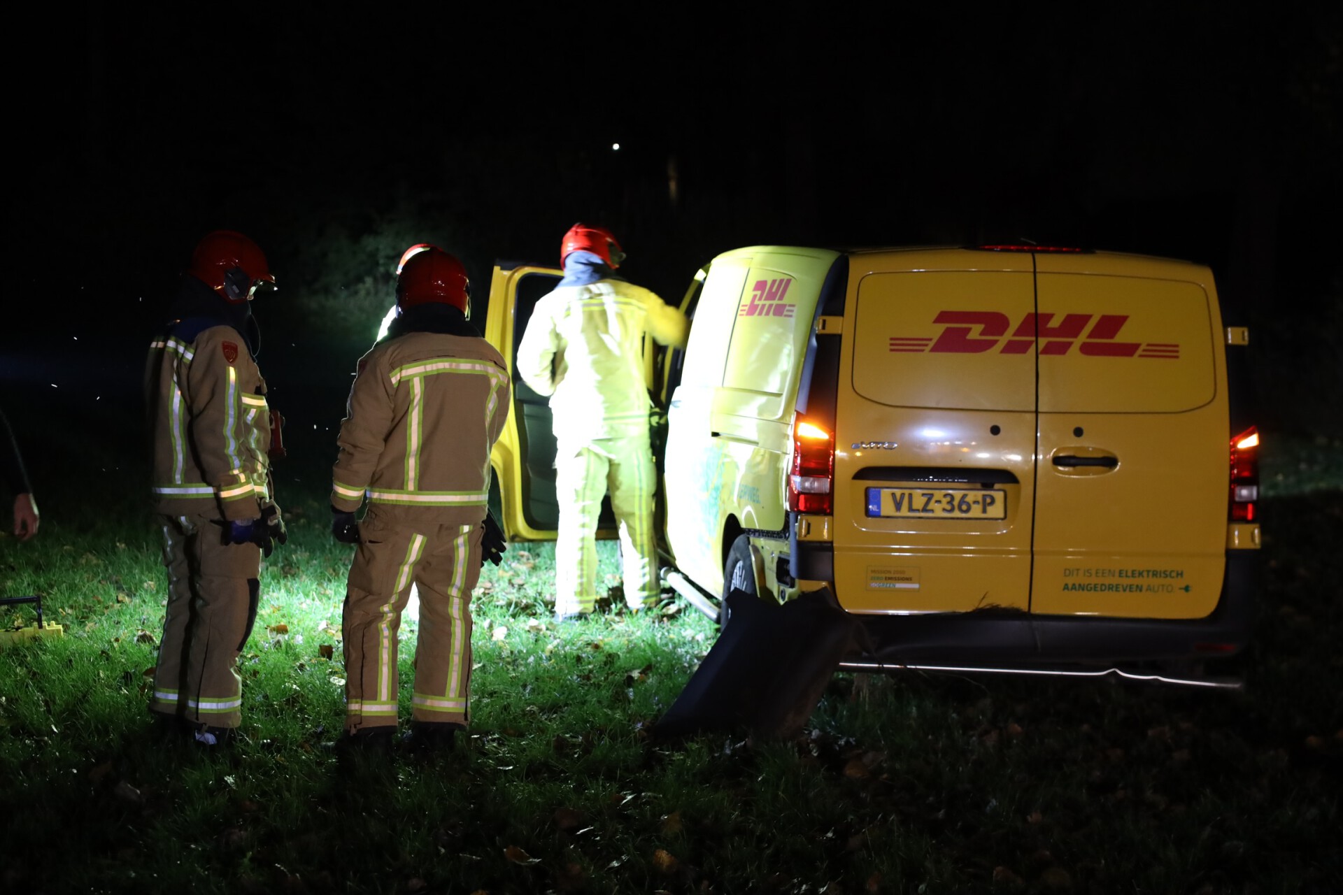 Een pakketbezorger reed in een bocht rechtdoor, werd gelanceerd en belande vele tientallen meters verderop in het weiland. De bestuurder is ter plaatse nagekeken door het ambulancepersoneel.