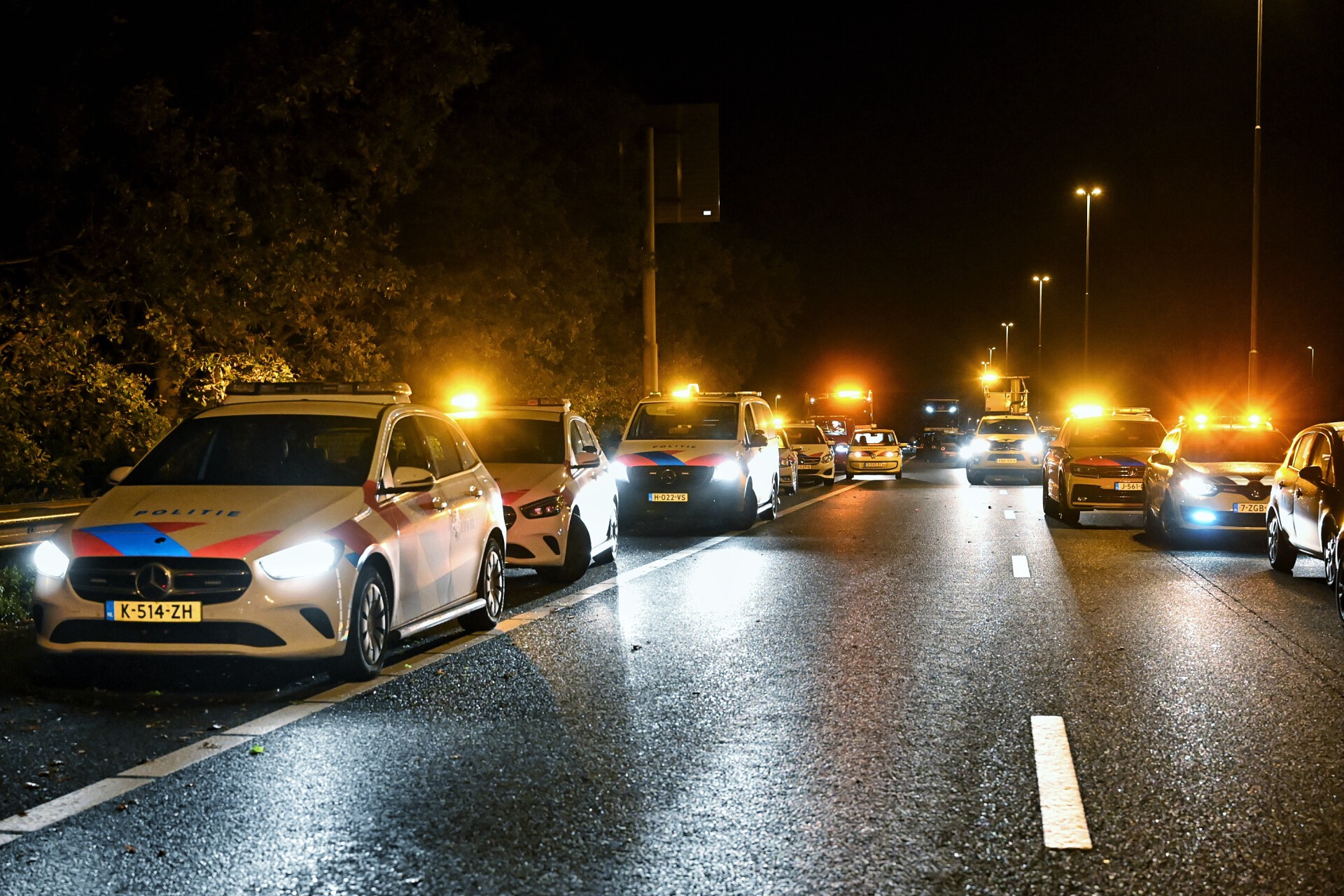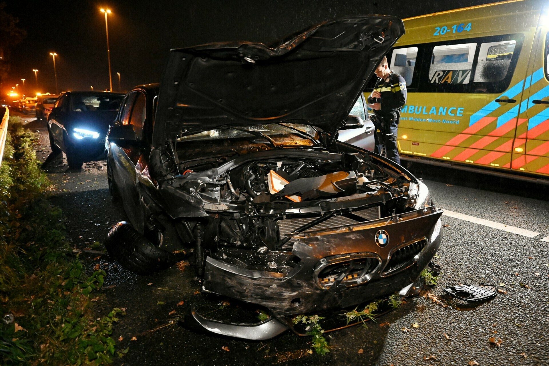 Twee auto’s botste tegen elkaar waarna er een flinke ravage ontstond. De weg lag over honderd meter verspreid flink onder de brokstukken. Hulpdiensten rukte massaal uit. Vijf ambulances, diverse politiewagens, de brandweer en een traumahelikopter kwamen ter plaatse. De traumahelikopter landen op de snelweg.