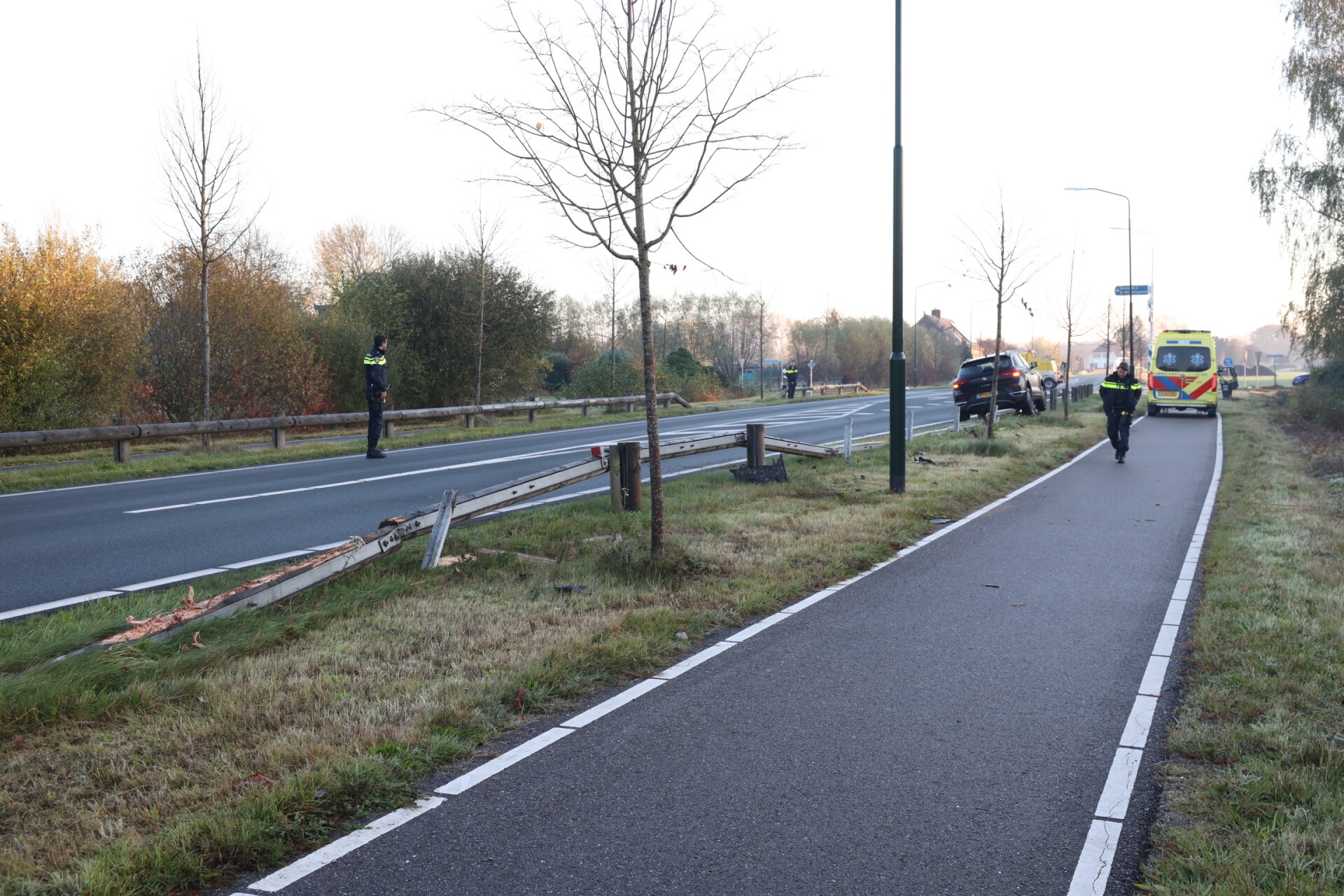Een automobilist raakte door onbekende oorzaak van de weg, ramde een bord en belandde uiteindelijk vele tientallen meters verderop op de vangrail. De automobilist is met onbekende verwondingen per ambulance naar het ziekenhuis gebracht.