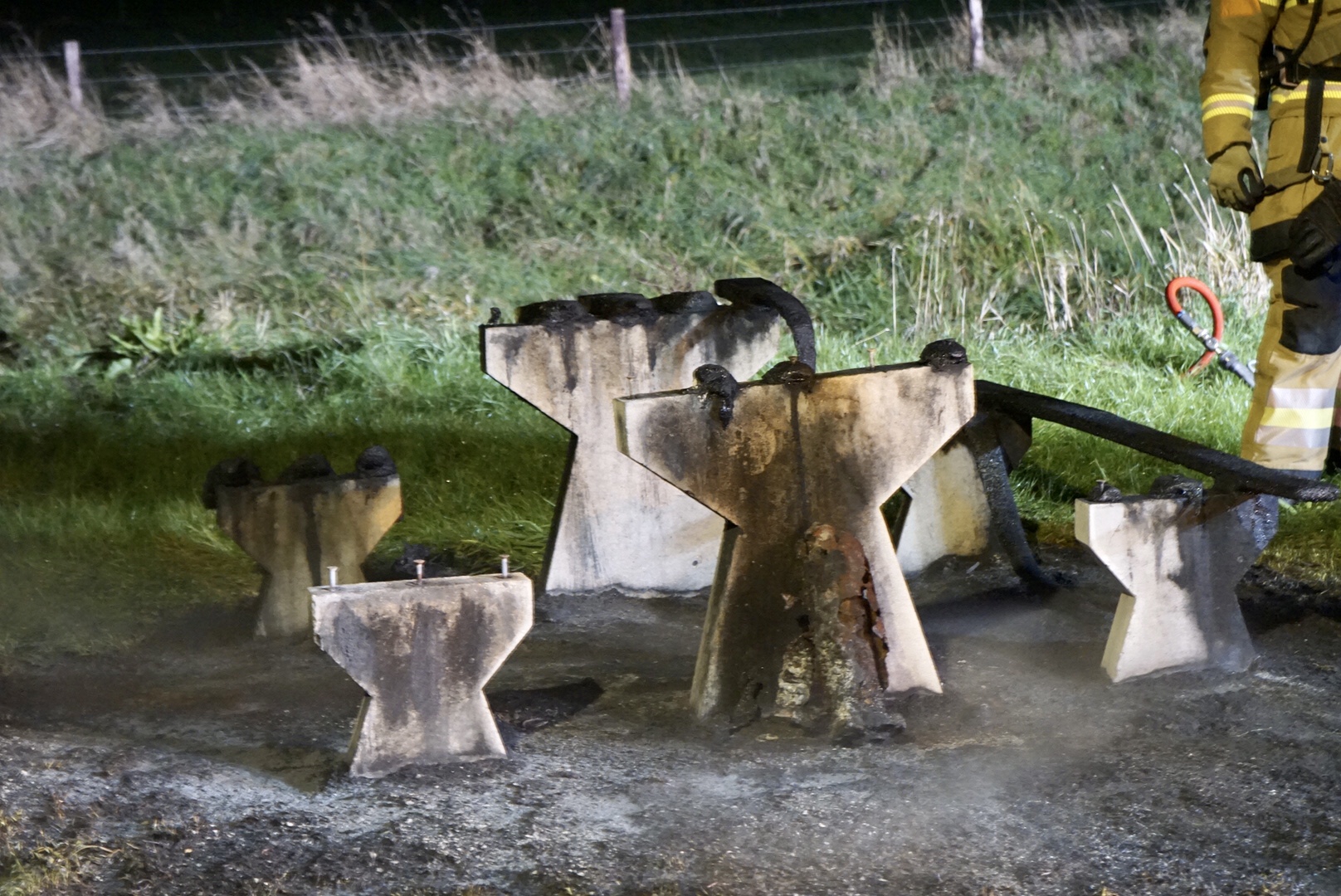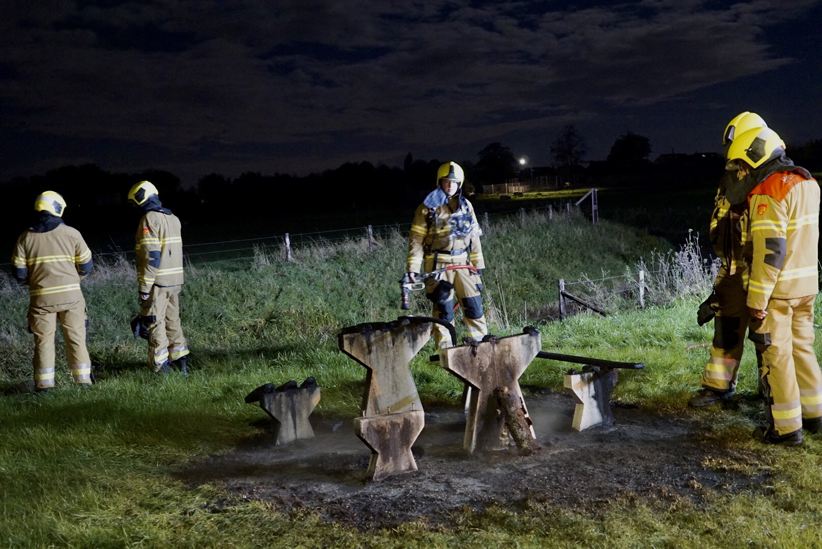 Brandweer blust brandende picknick tafel