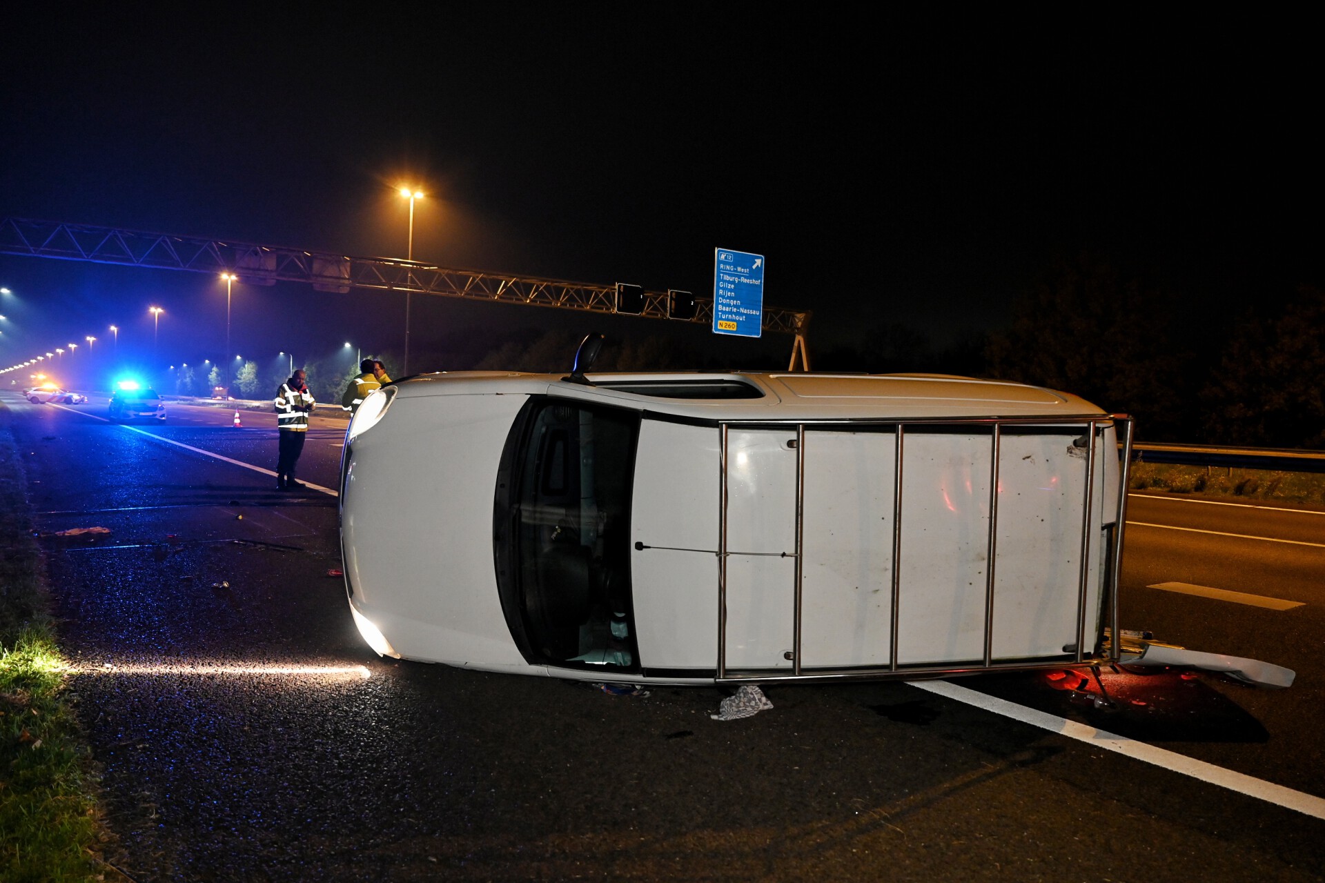 Busje belandt op zijn kant op A58, bestuurster met hond rent weg