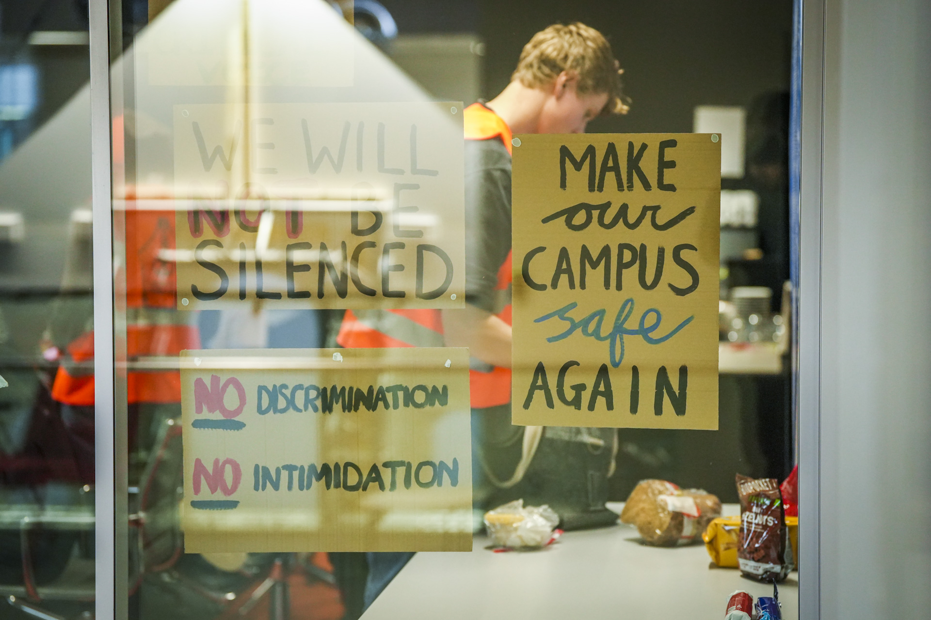 Hoe lang de demonstranten de vergaderruimte bezet houden, is niet bekend.