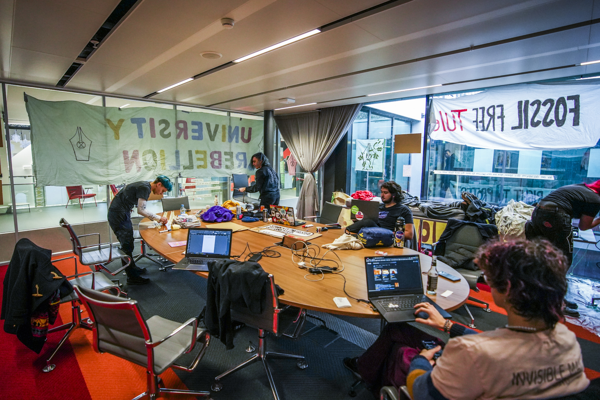 Hoe lang de demonstranten de vergaderruimte bezet houden, is niet bekend.