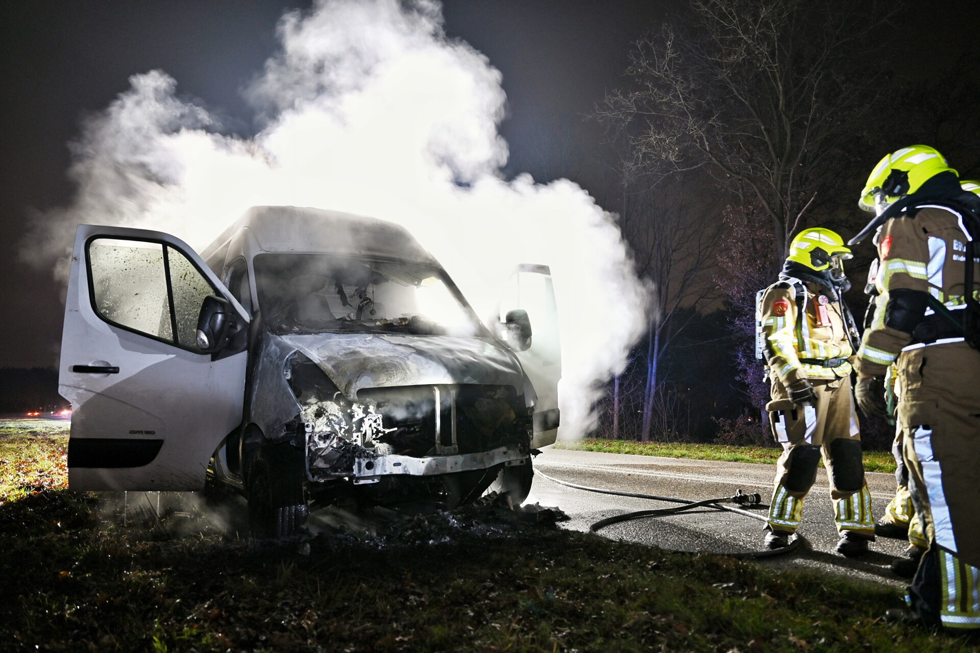 Bestelbus vliegt in brand tijdens het rijden