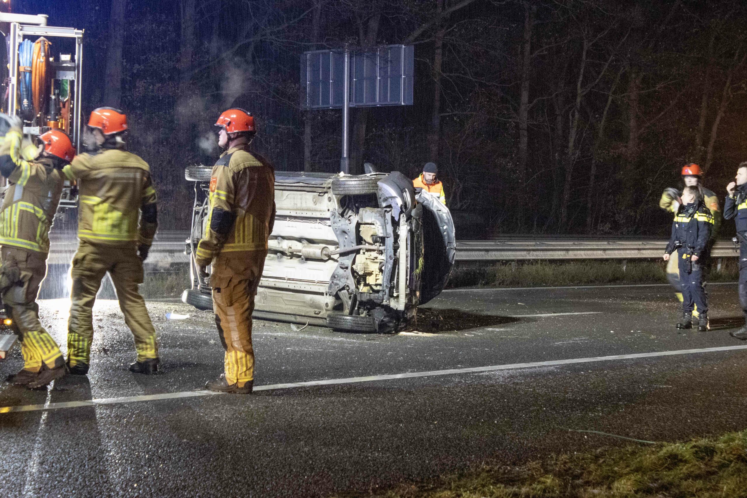 Een personenauto is op zijn kant terecht gekomen na een ongeval op de A58 tussen Bergen op Zoom en Roosendaal. De twee inzittenden zijn na het ongeval bekneld komen te zitten en moesten door de brandweer uit hun voertuig worden gehaald. De A58 richting Roosendaal is volledig afgesloten.