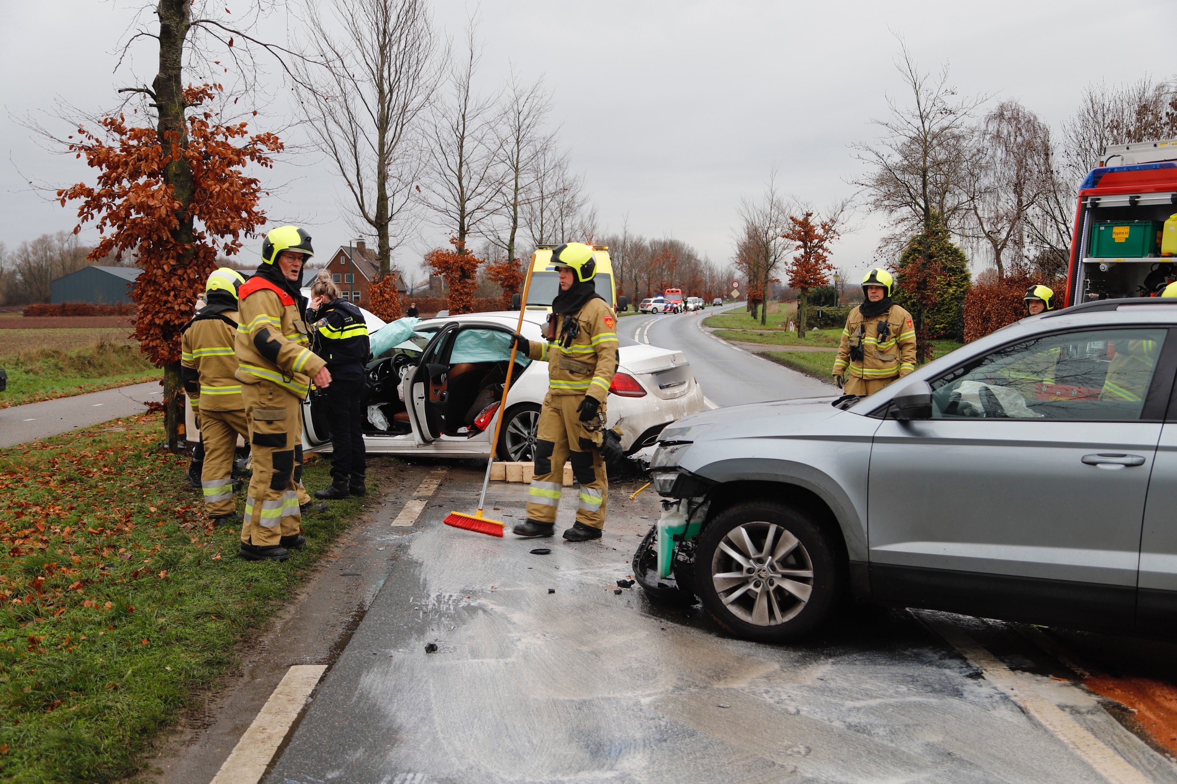 Het ongeval vond plaats bij een bedrijf langs de weg, waarbij een van de automobilisten van het bedrijf afreed toen het misging. De andere auto kon een aanrijding niet meer vermijden en klapte op de andere auto waarna ze tot stilstand kwam tegen een boom.