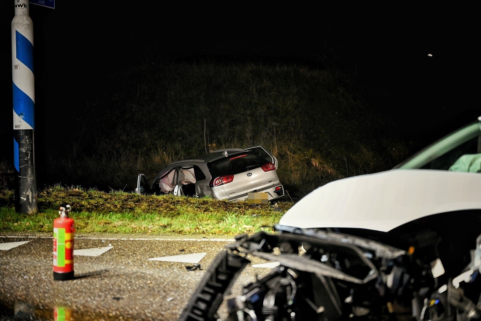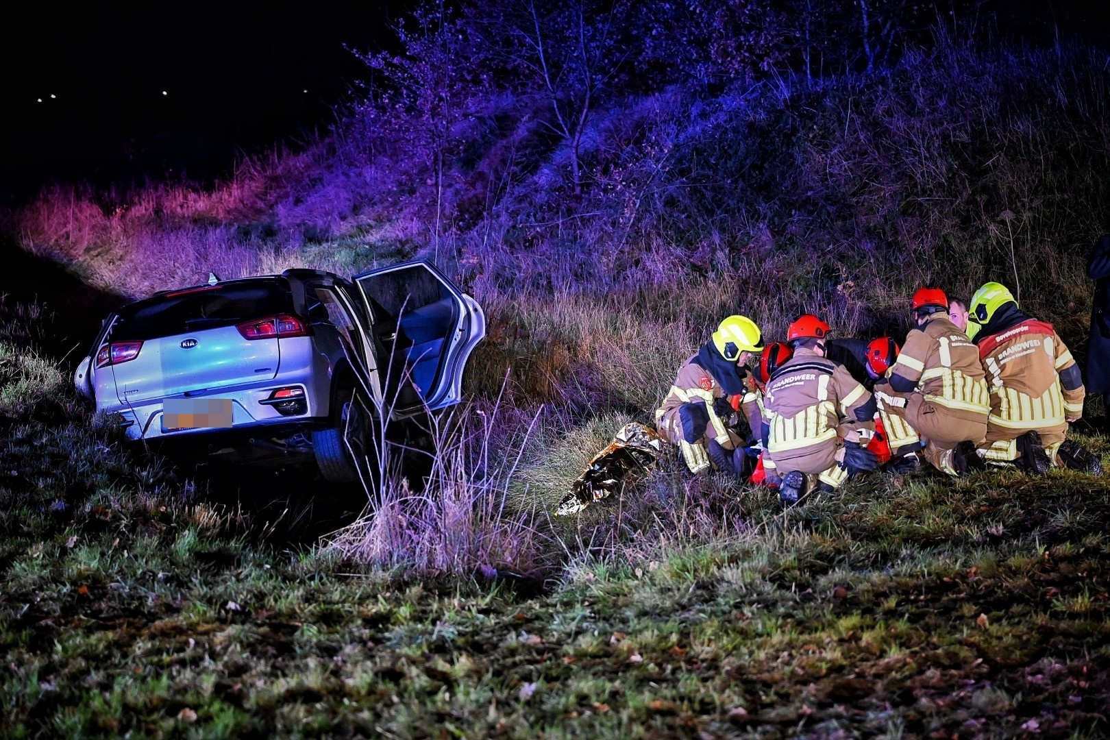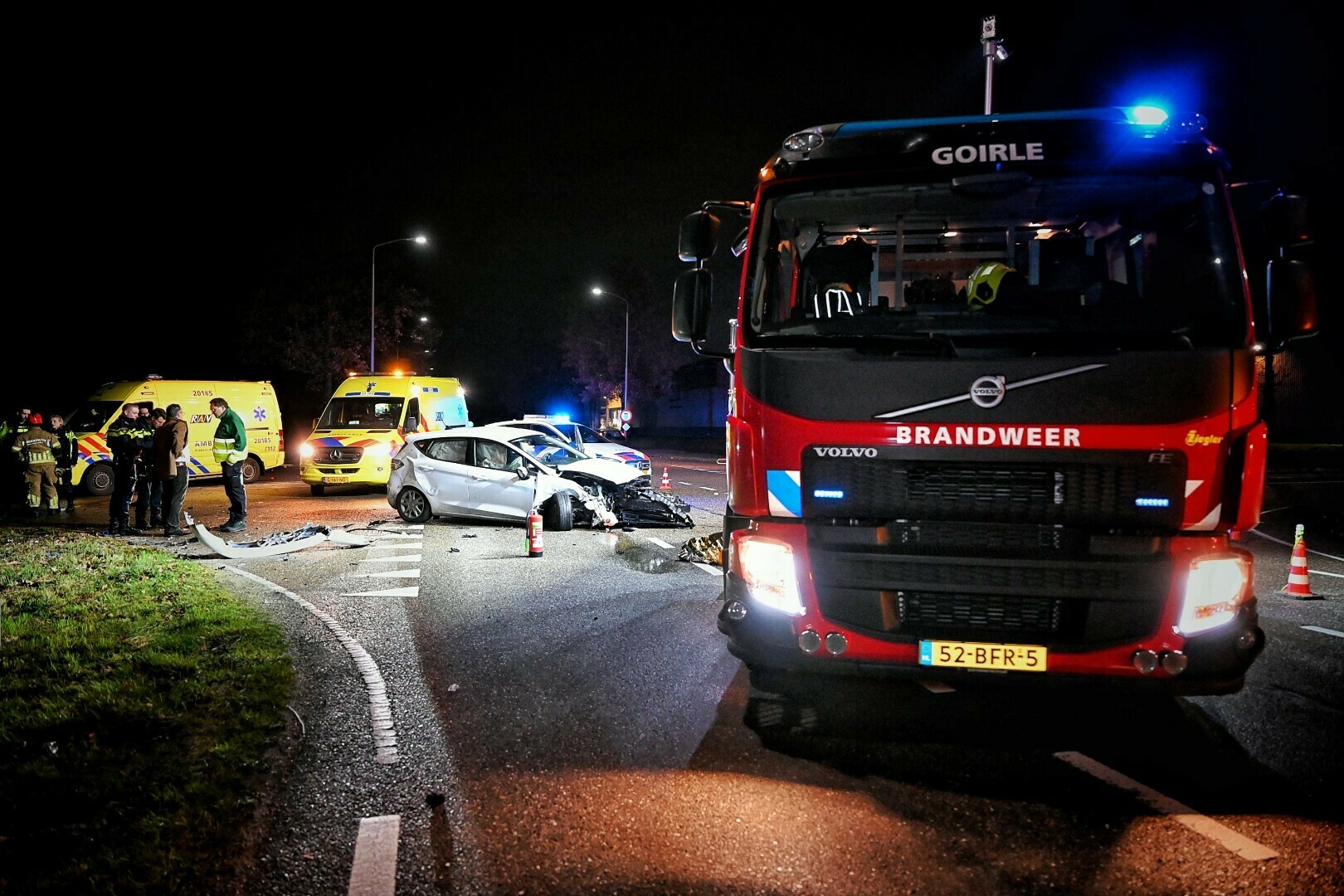 Een van de auto’s belandde na de botsing in een sloot naast de weg. Brandweerlieden moesten de inzittenden uit de auto bevrijden.