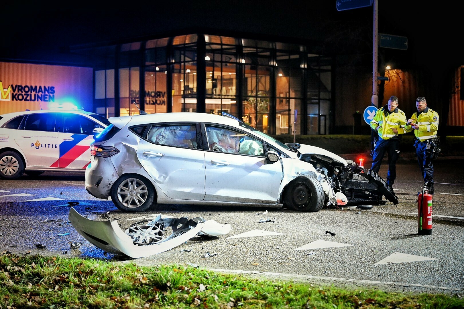 De weg was bedekt met brokstukken na het ongeluk. De politie heeft verkeersspecialisten ingezet om de toedracht van het ongeluk te onderzoeken.