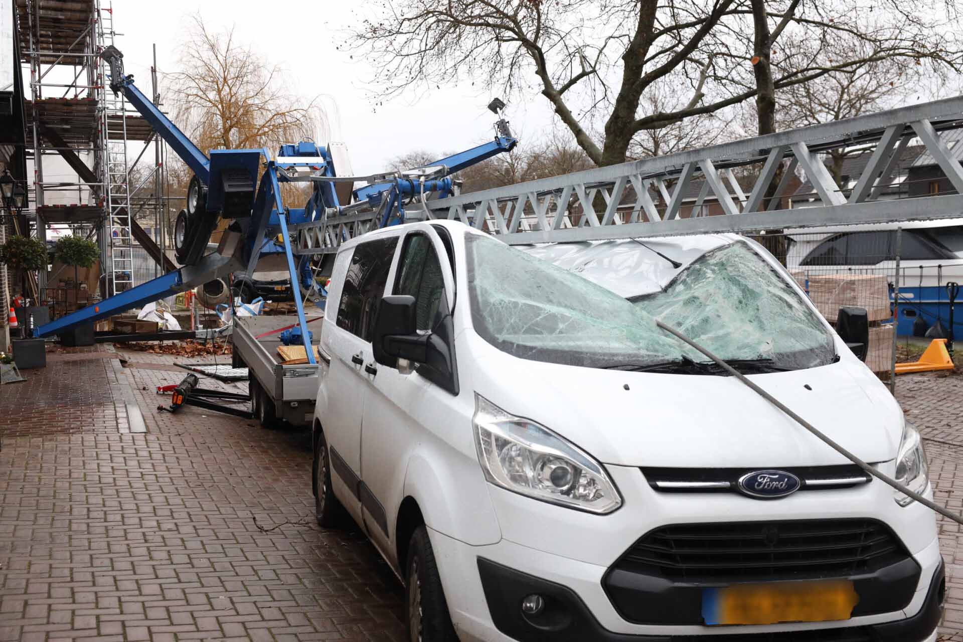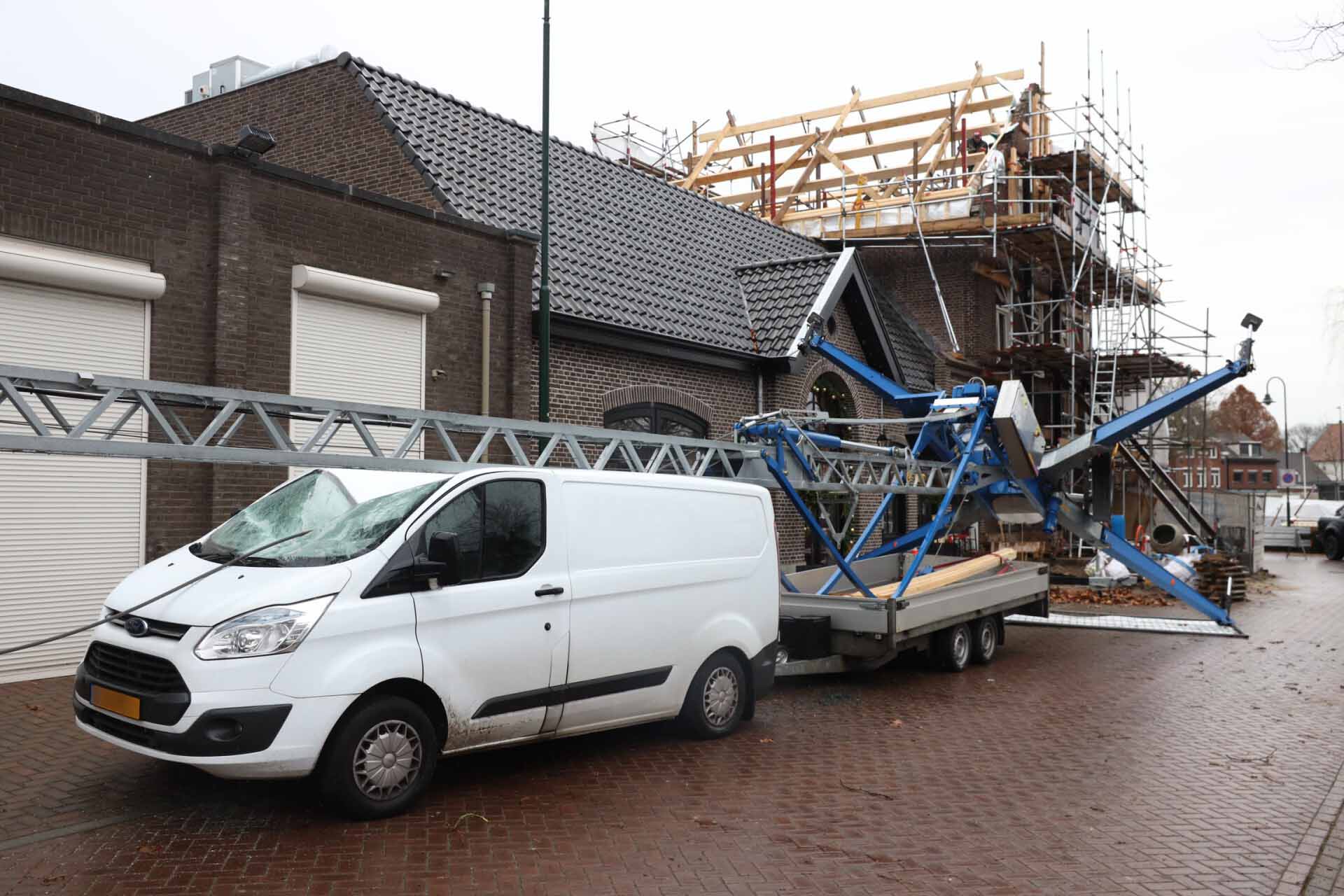 De hijskraan viel vermoedelijk om bij werkzaamheden die werden uitgevoerd. Hierbij belandde hij op een bestelbus die forse schade heeft opgelopen. Niemand raakte gewond.