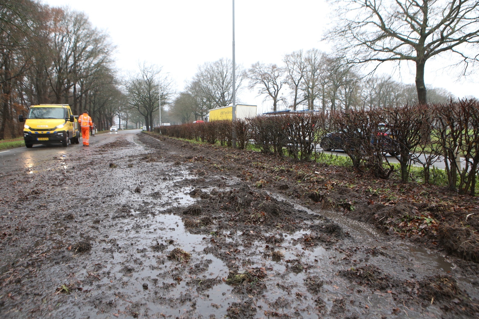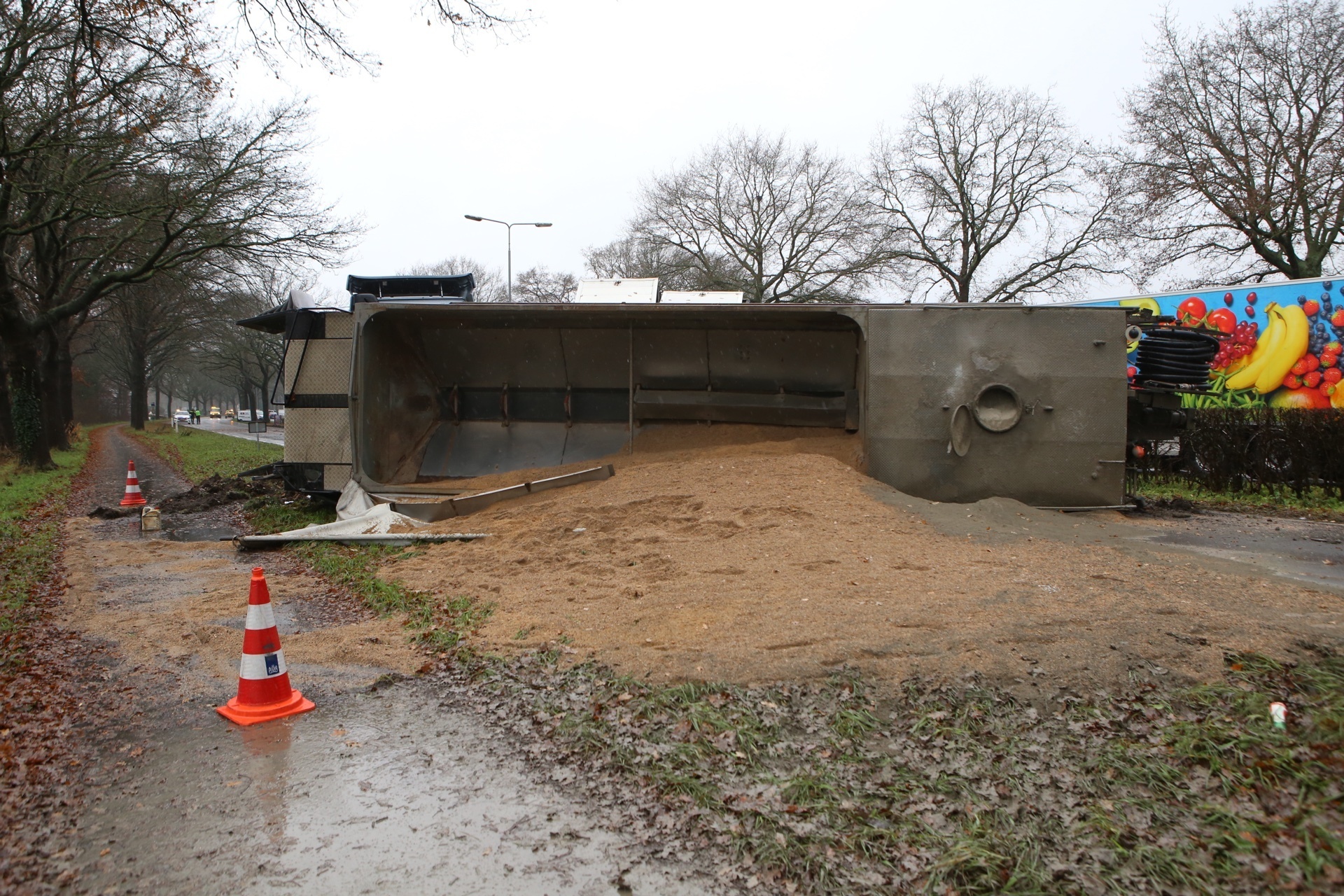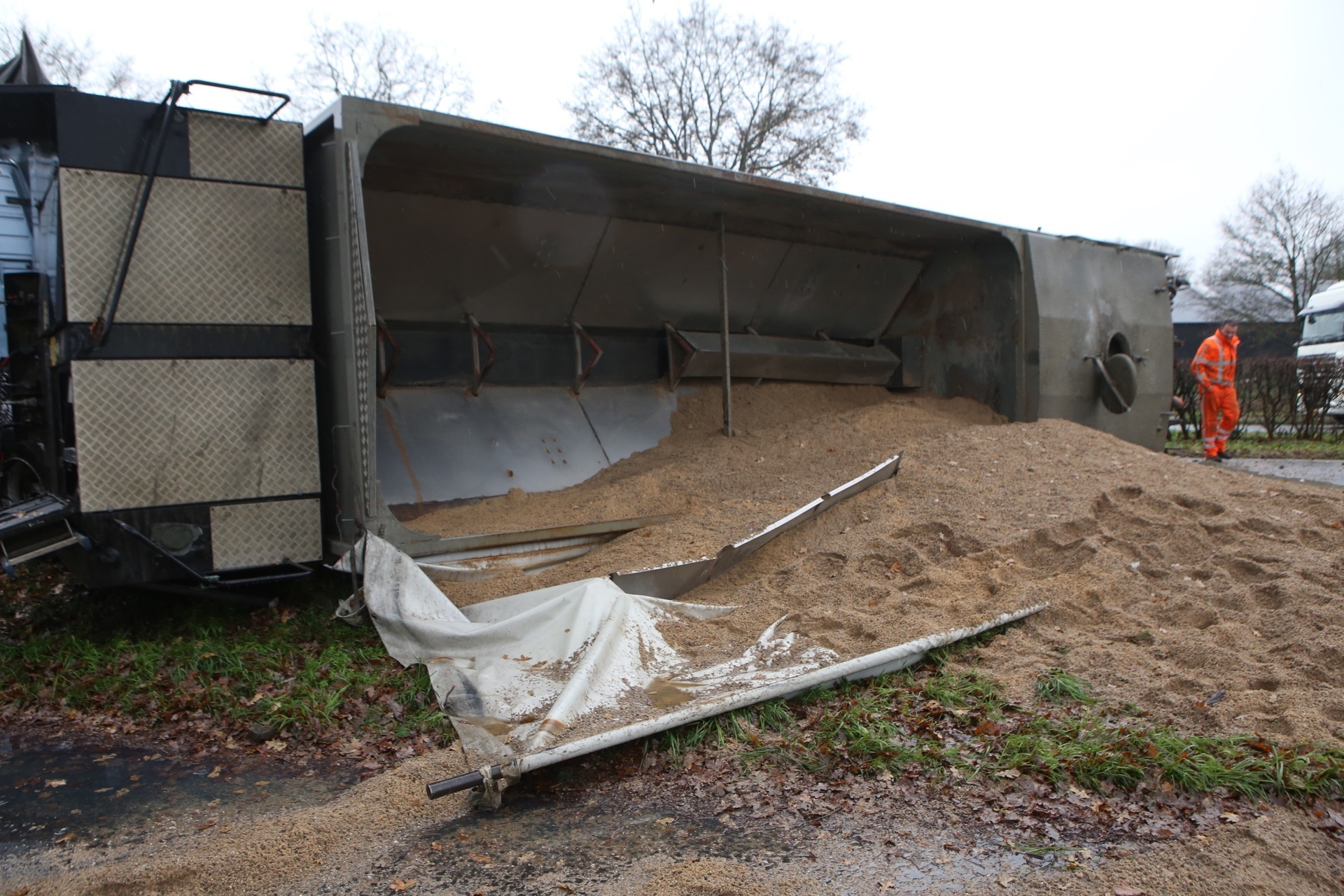 Uit de tank van de omgevallen vrachtwagen lekt diesel, dus het zal enige tijd duren voordat de weg weer vrijgemaakt kan worden.