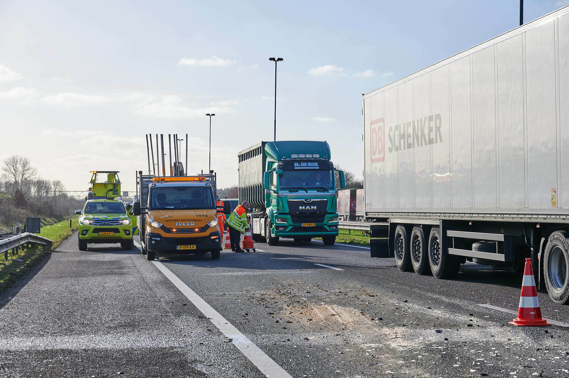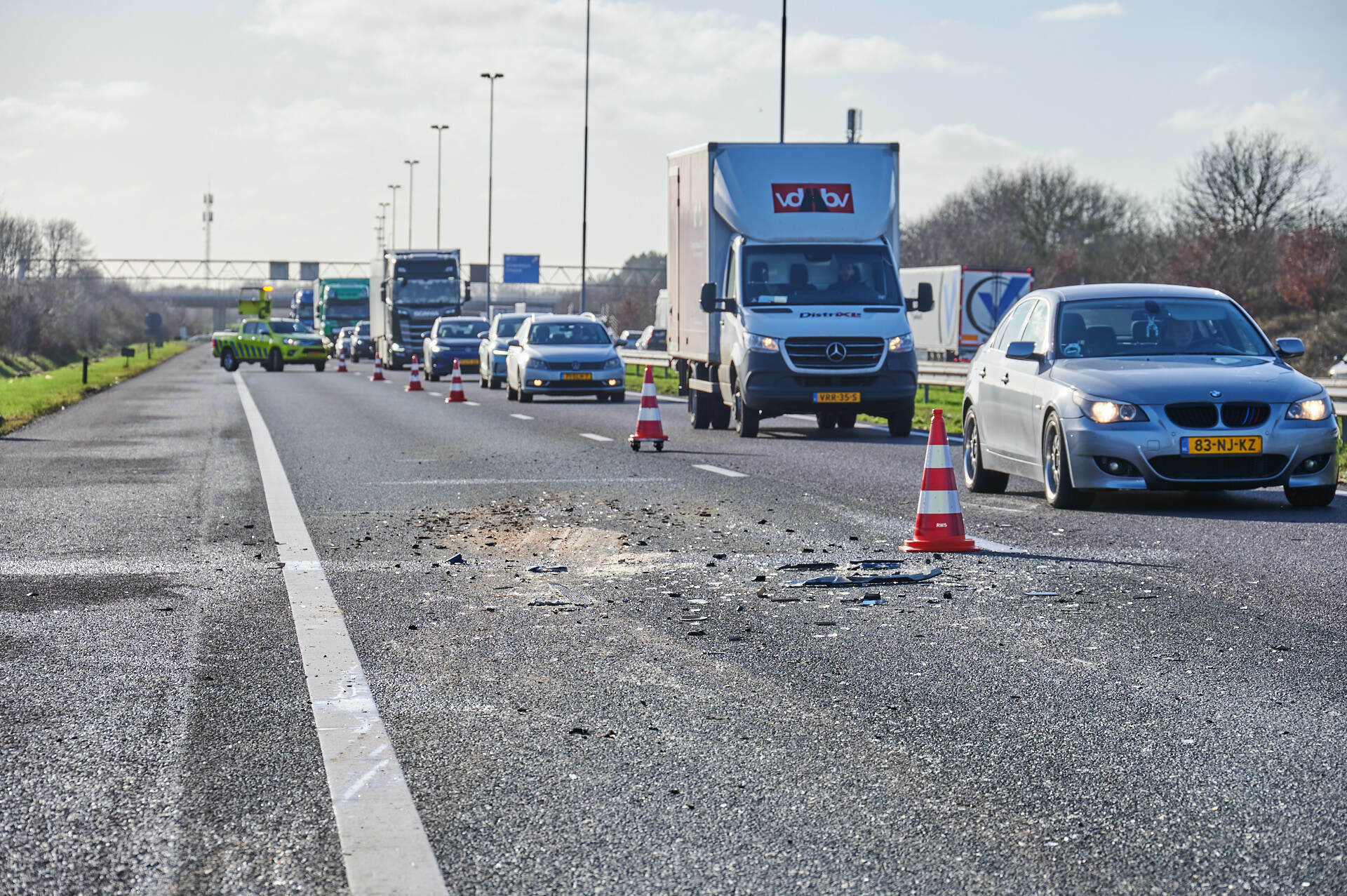 Hoe het ongeluk heeft kunnen gebeuren is nog niet bekend. Door de aanrijding ligt er veel rommel op de snelweg en daardoor is er een rijstrook afgesloten.