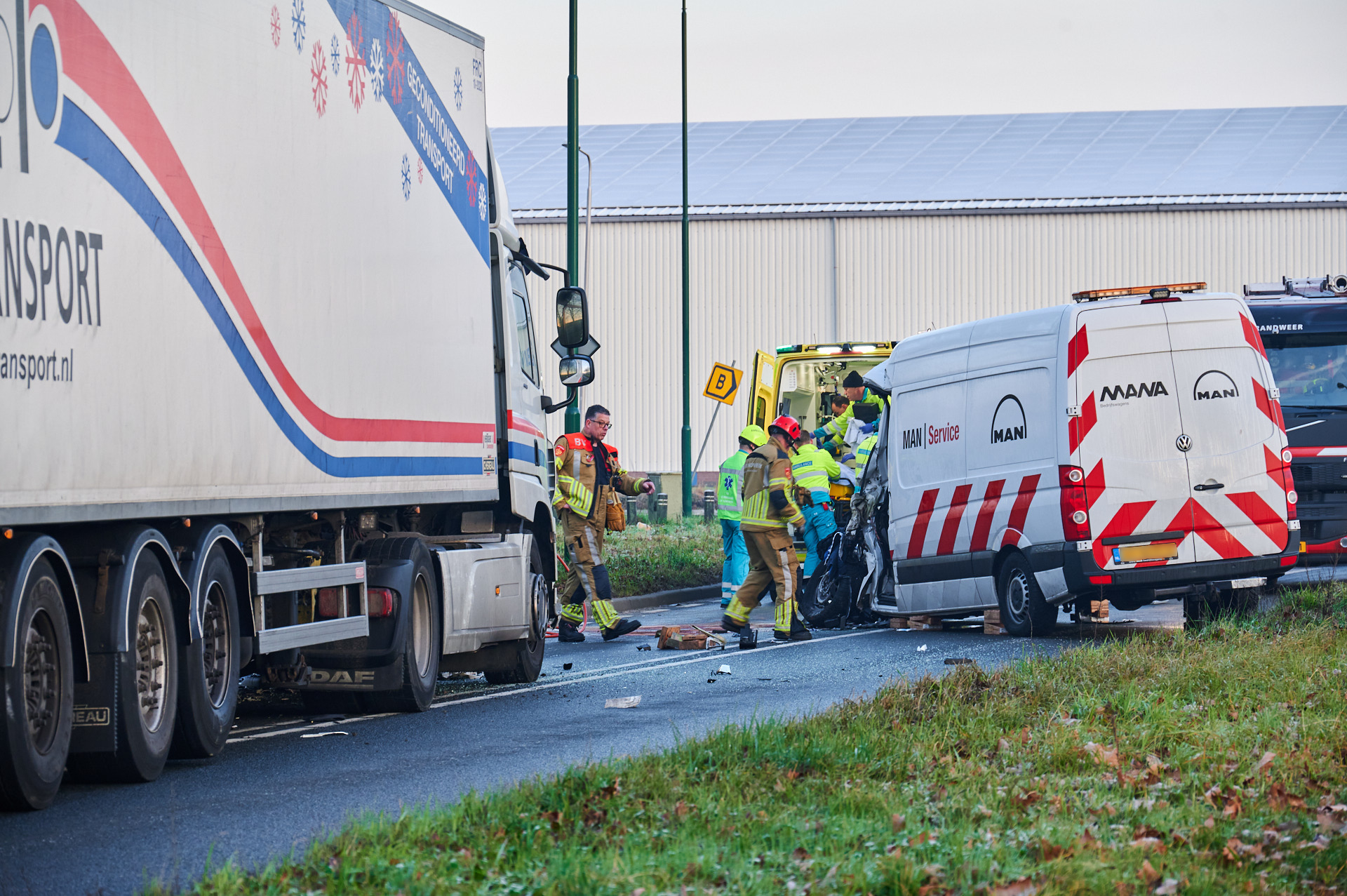 Bestelbus en vrachtwagen botsen: zeker één persoon gewond