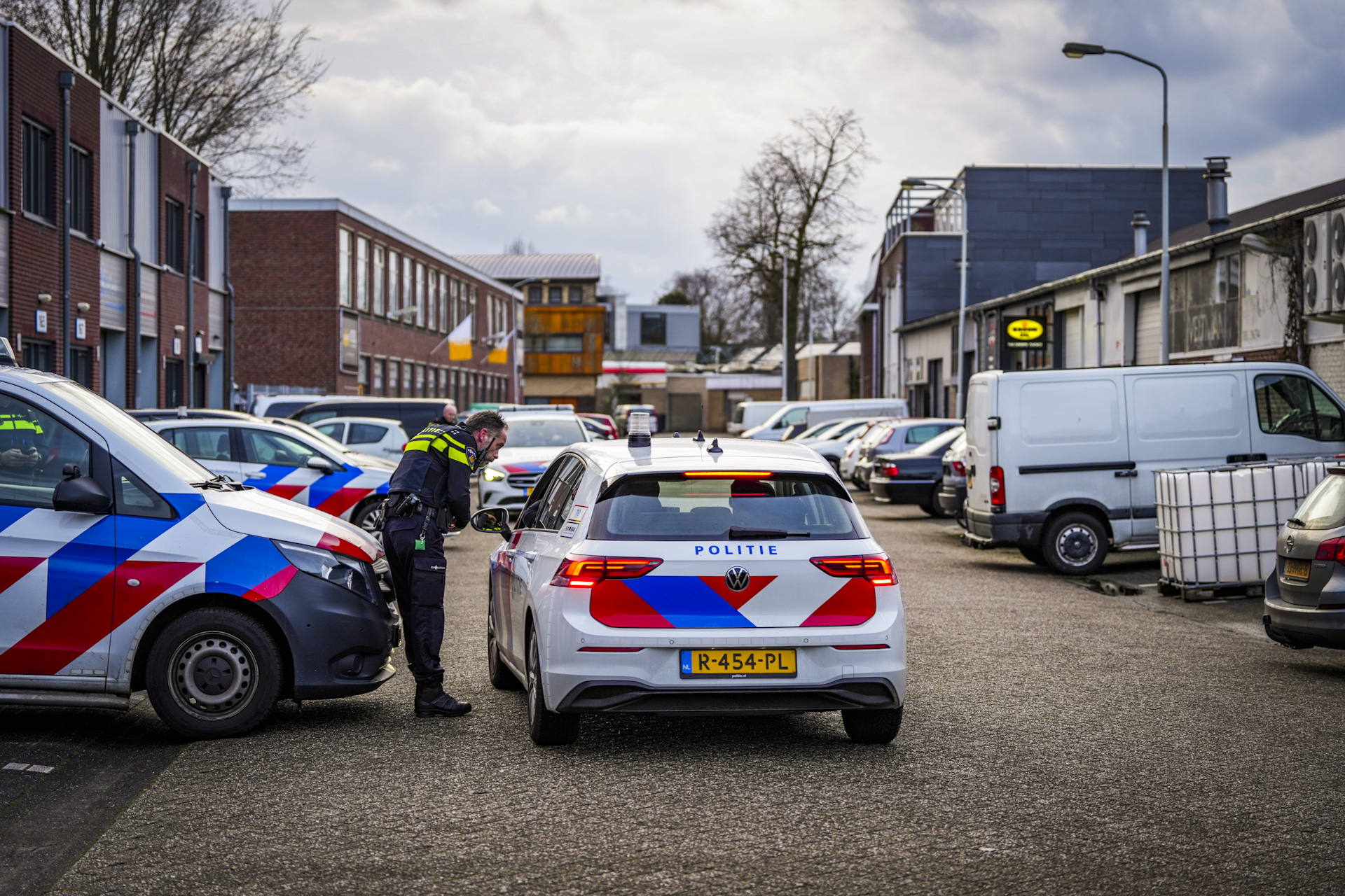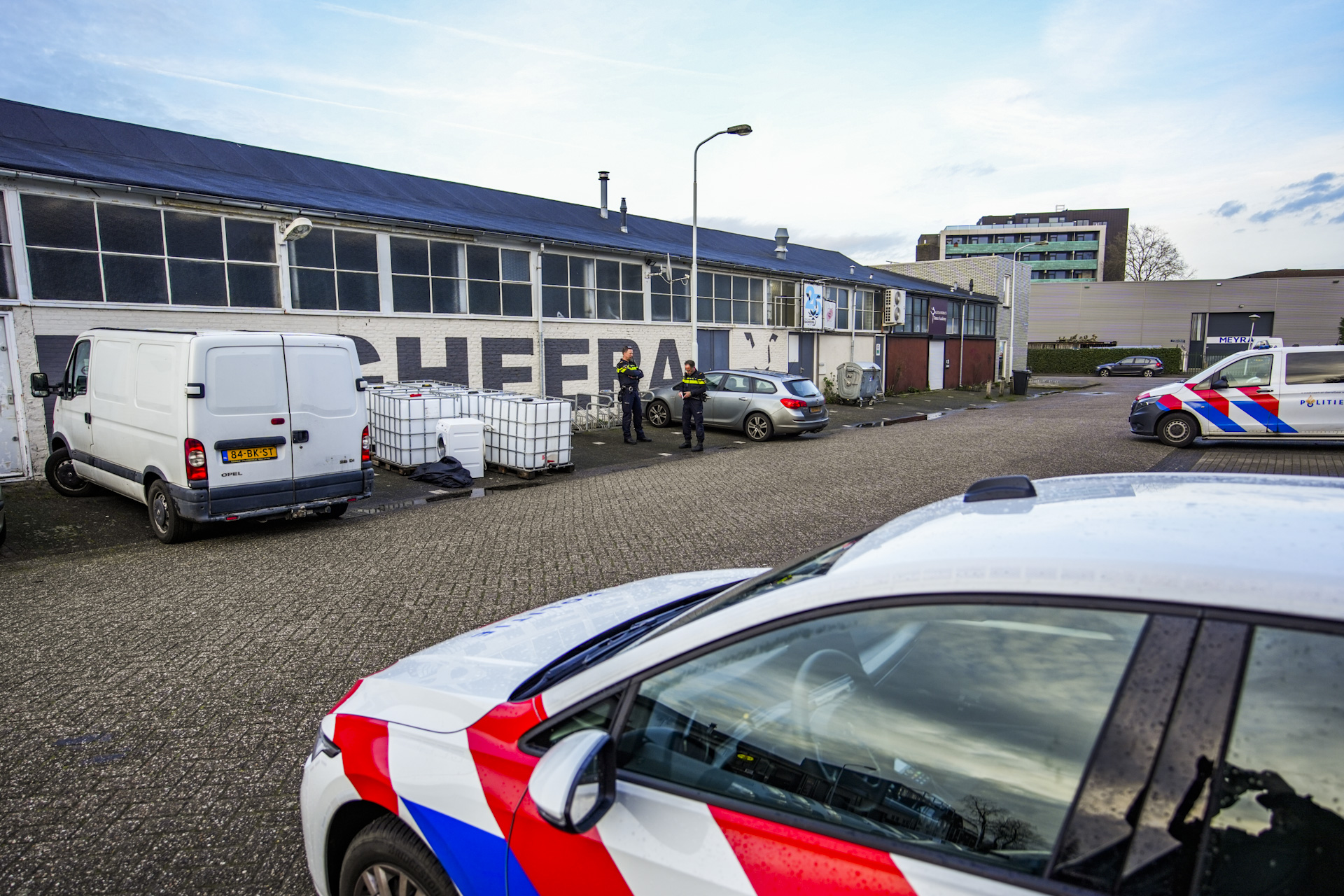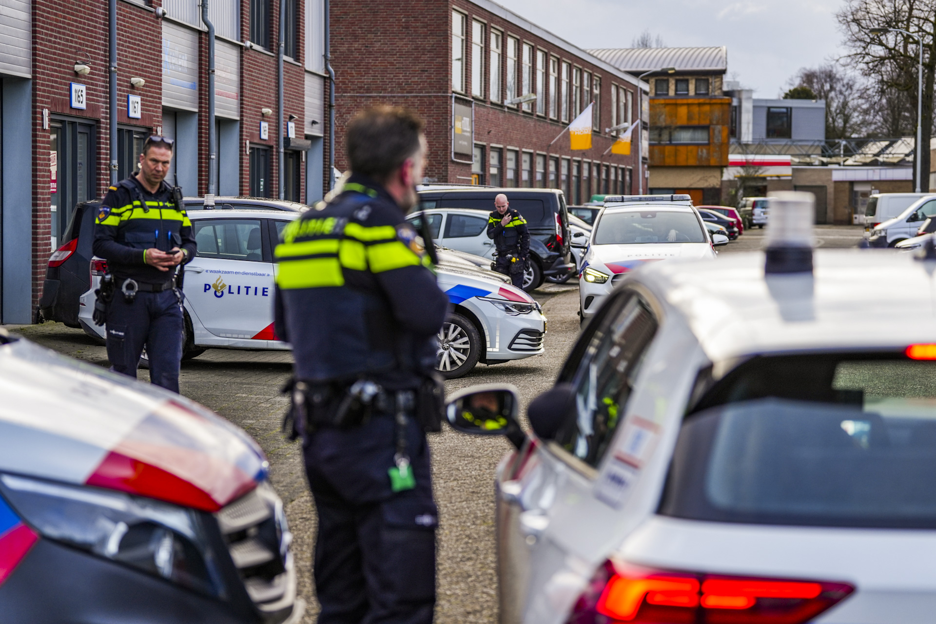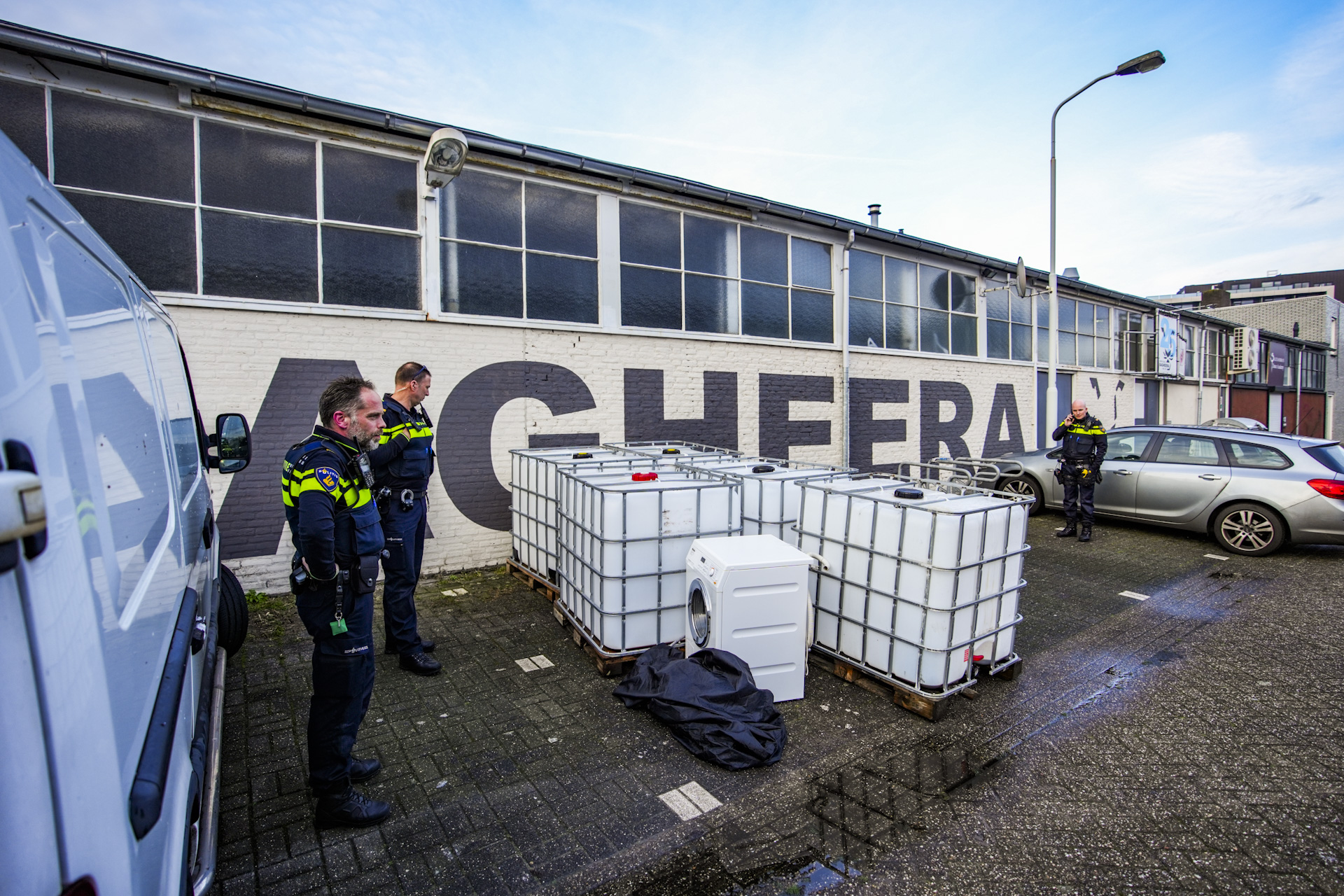 Er staan vijf vaten van 1000 liter op een parkeerplaats. Een adviseur gevaarlijke stoffen van de brandweer is ter plaatse gekomen om metingen te verrichten. De vaten zijn zo goed als leeg, op een bodempje na. De politie onderzoekt of het om drugsafval gaat, maar kan daar nog niets over zeggen.
