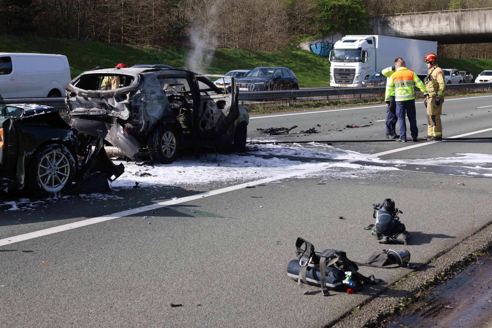 De ravage was groot, de snelweg richting Veghel werd volledig afgesloten. De brandweer doofde de vlammen en stelde de andere voertuigen veilig.
