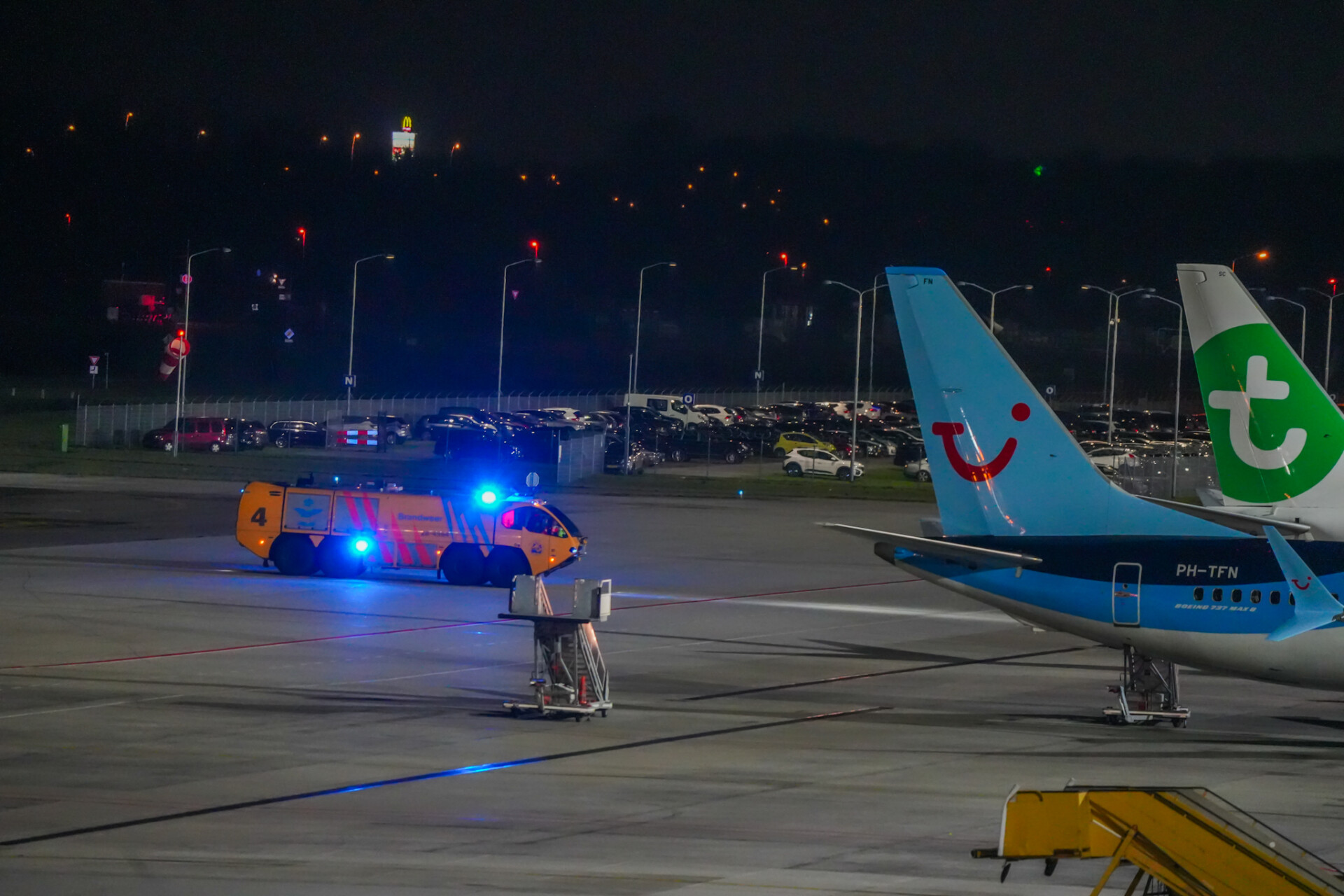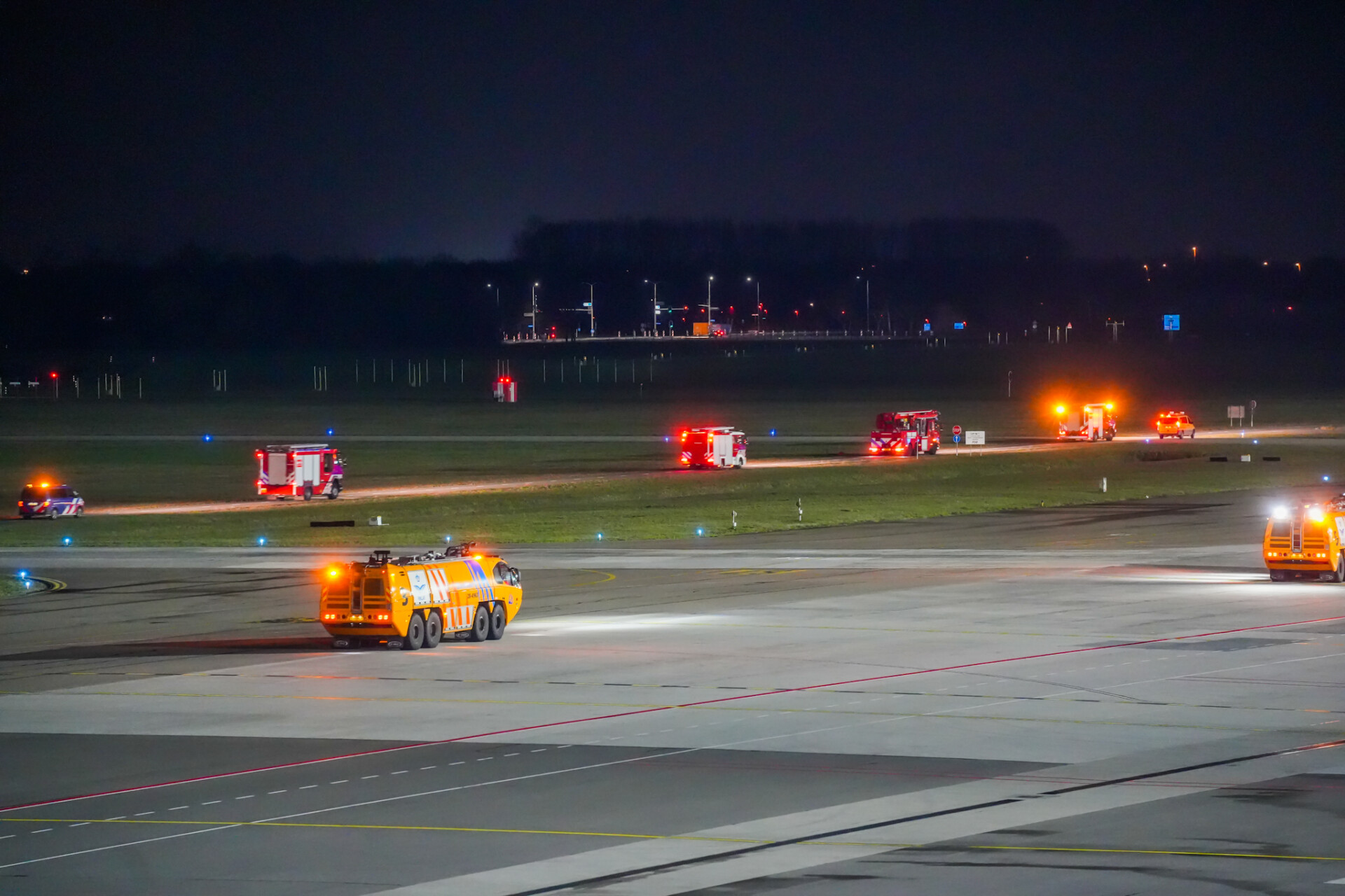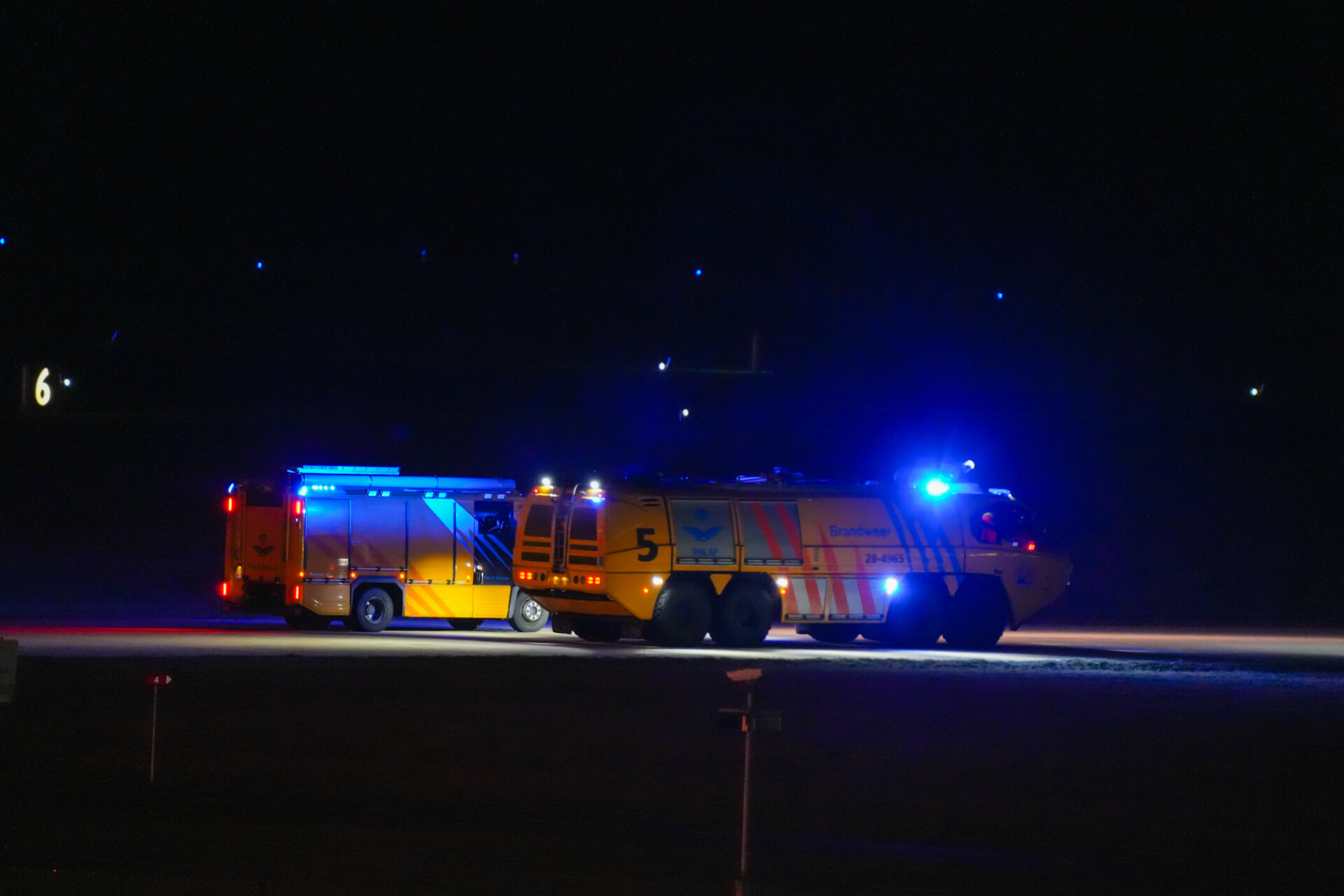 De hulpdiensten waren uit voorzorg met meerdere voertuigen op het vliegveld aanwezig.