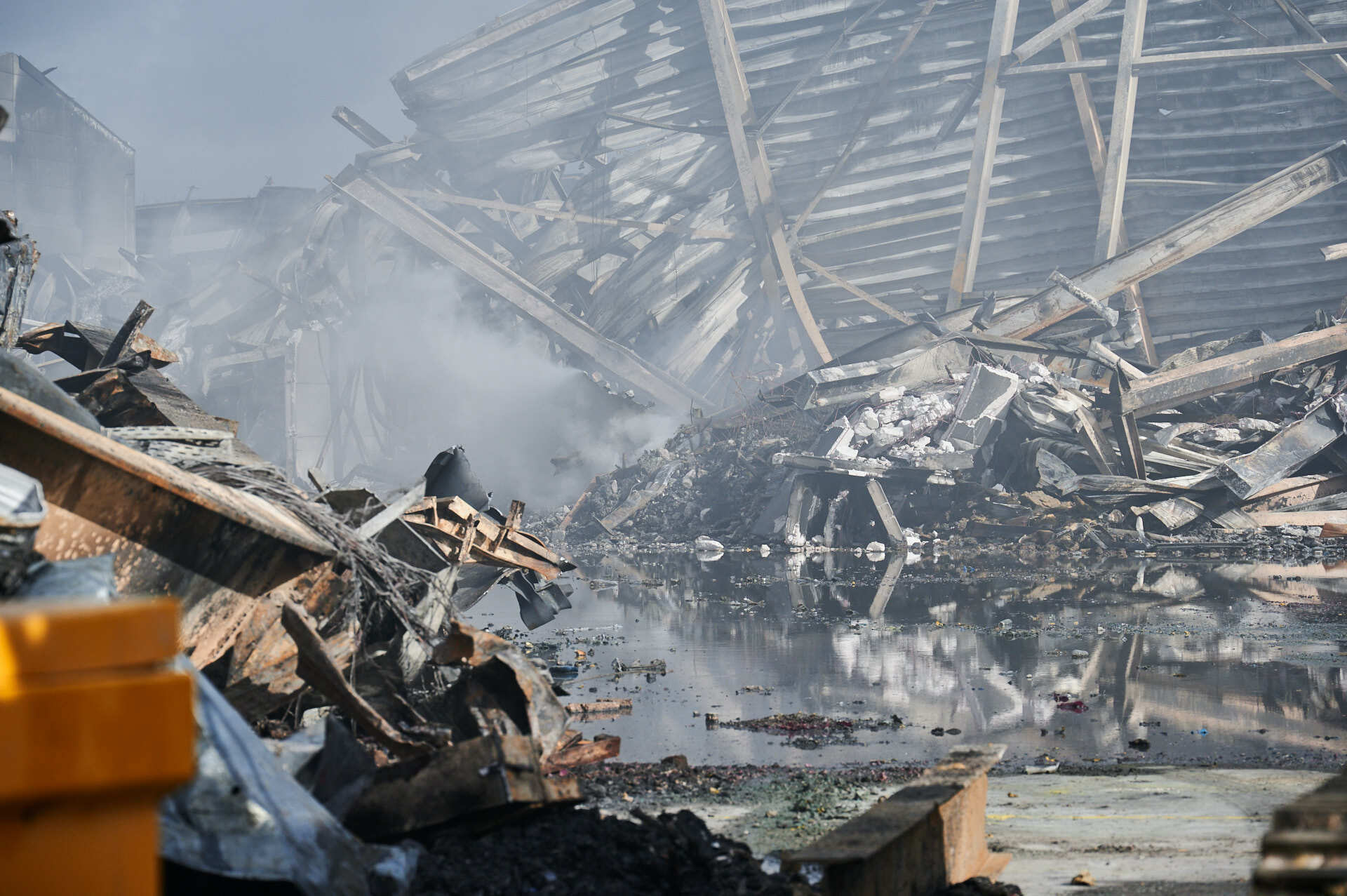 Dinsdagochtend is de sloop van het pand begonnen. Hierbij zijn ook nog drie wagens van de brandweer aanwezig om de smeulende resten van de brand te blussen.