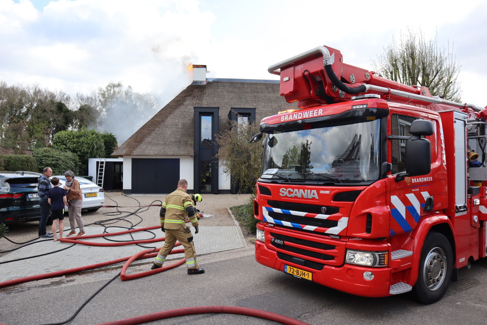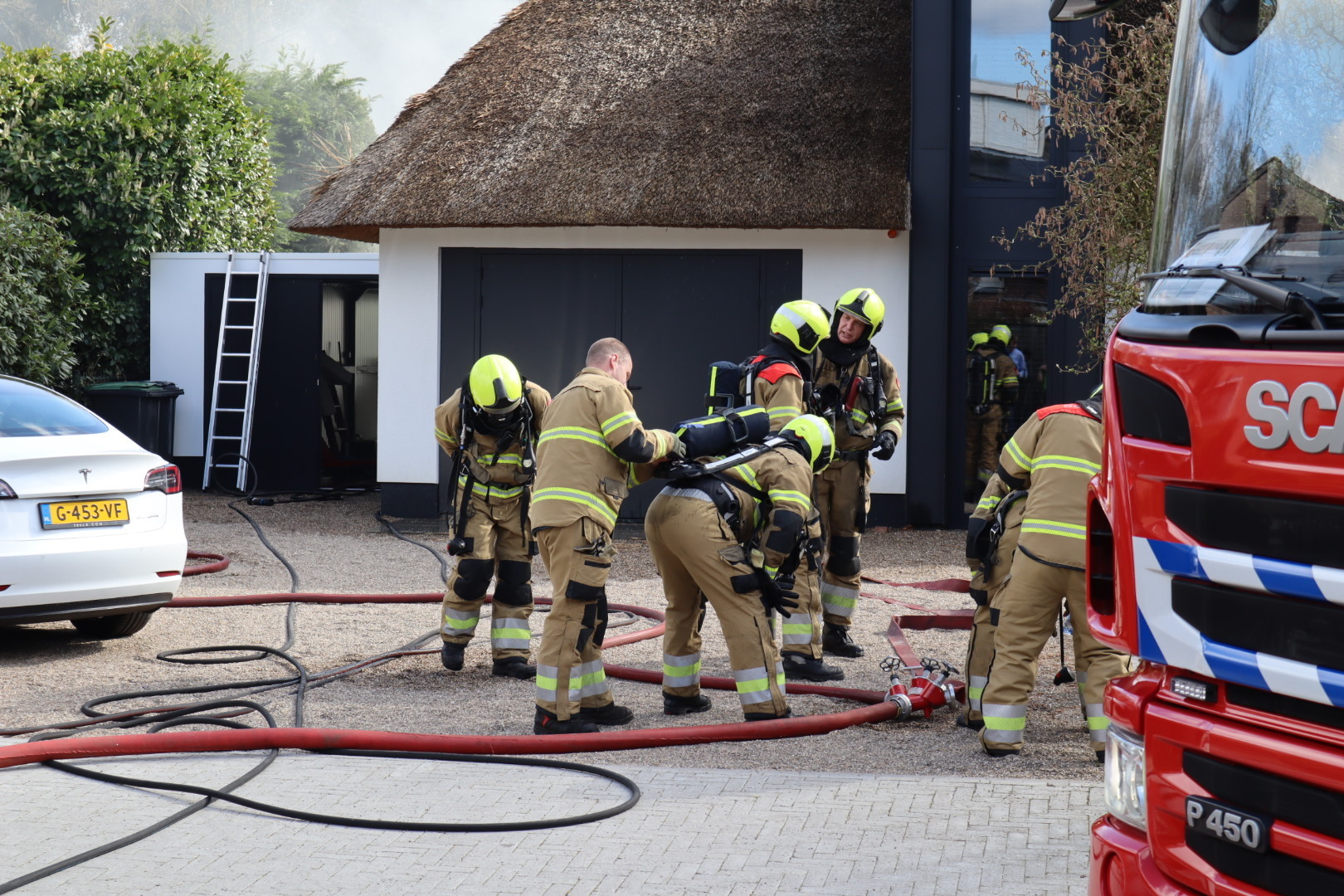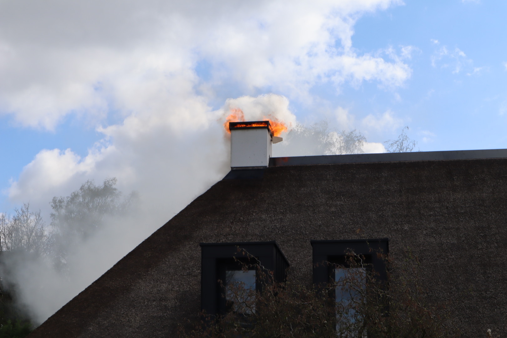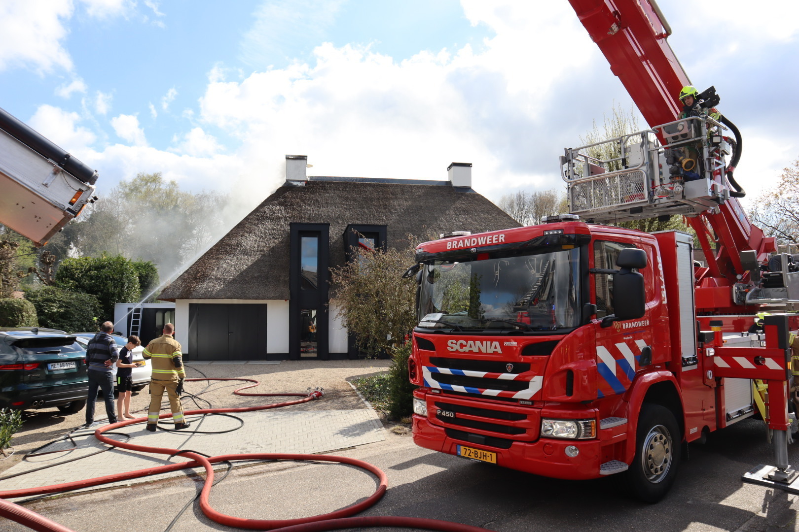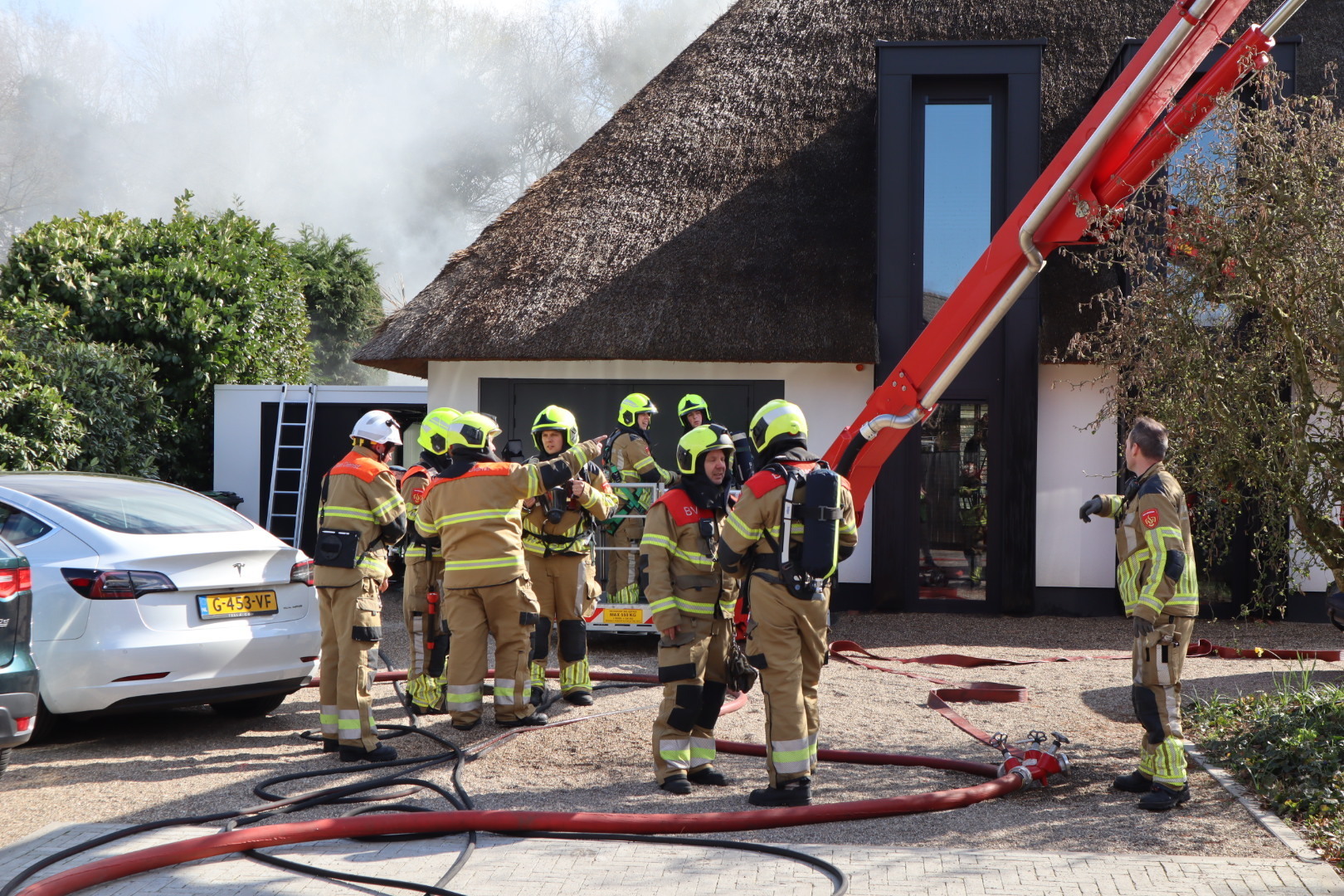 Het vuur ontstond rond 16.00 uur en verspreidde zich snel. De brandweer was snel ter plaatse en schaalde al snel op naar een grote brand. Een team van de brandweer, dat gespecialiseerd is in het blussen van branden in rieten daken, werd opgeroepen en arriveerde met meerdere tankautospuiten en een hoogwerker.