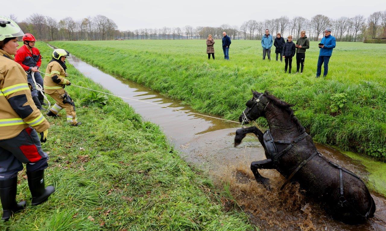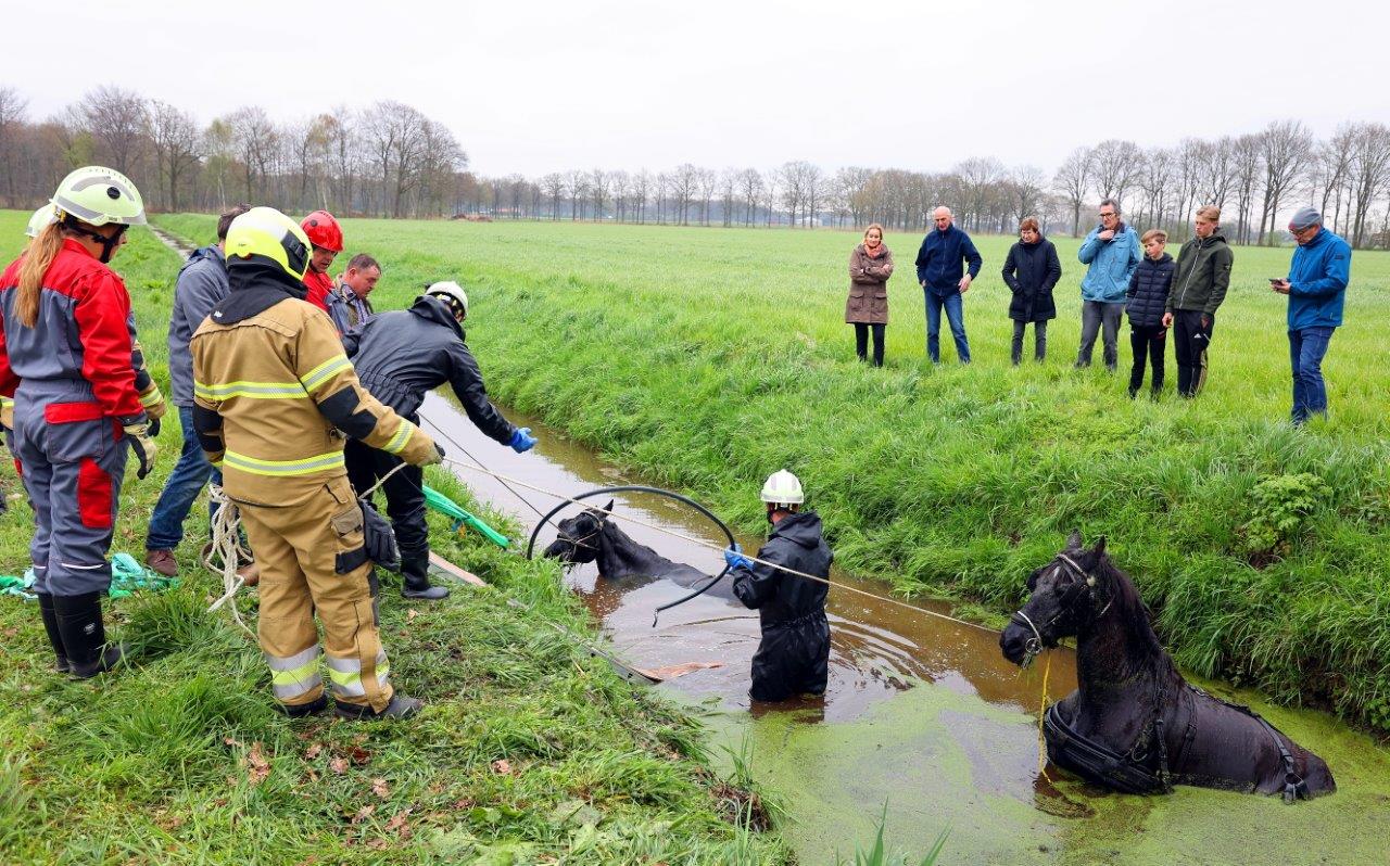 De brandweer heeft met behulp van een graafmachine de paarden uit het water gehaald, waarna de dieren met een vrachtwagen naar een stal zijn gebracht.