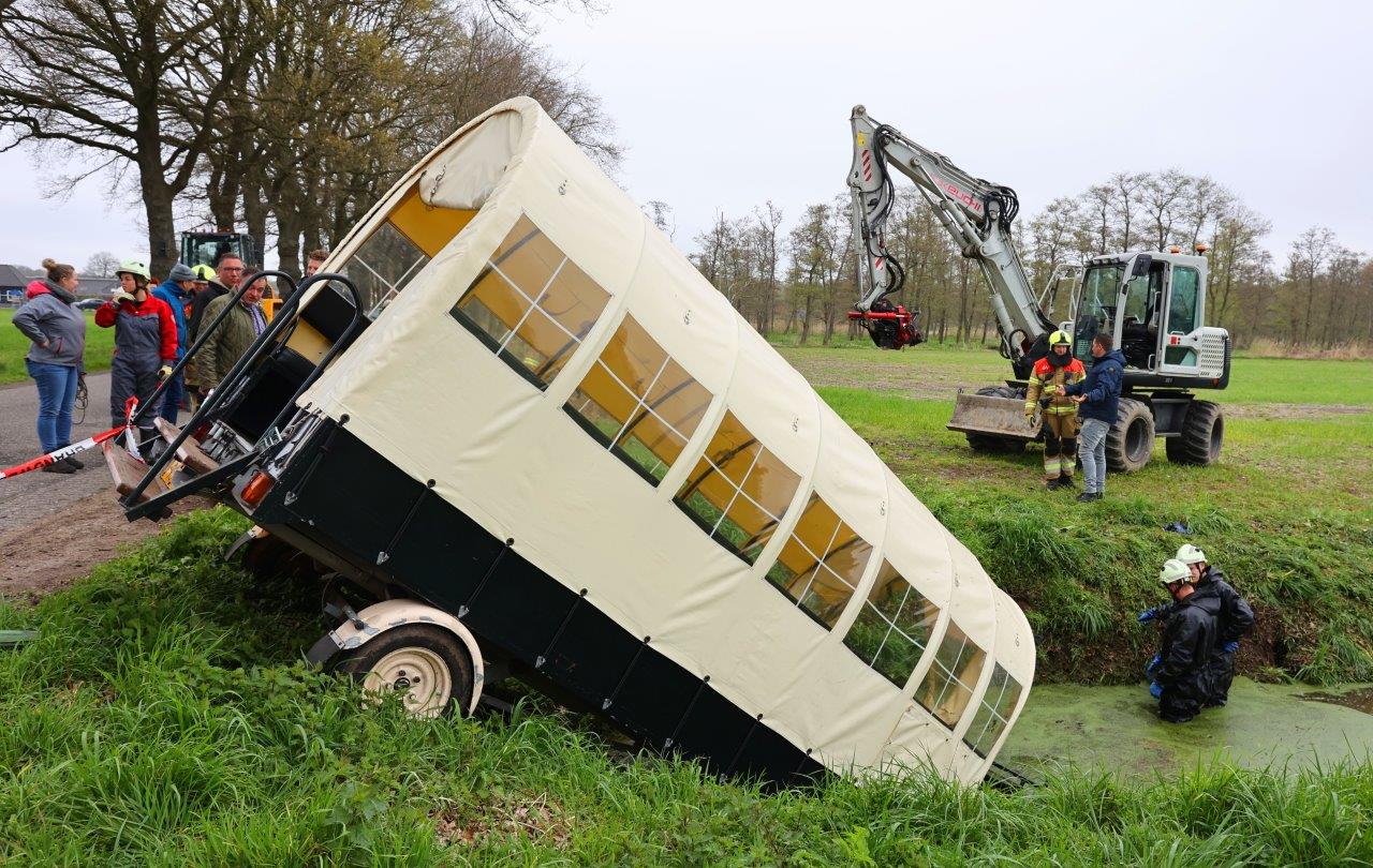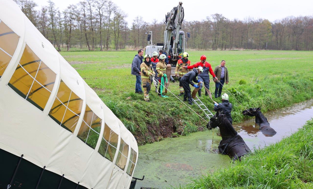 Het gebeurde rond 12:55 uur. De paarden schrokken vermoedelijk ergens van, waarna ze in het water terecht kwamen. Ook de huifkar die de paarden trokken kwam in de sloot terecht. De man die op de bok zat van de huifkar bleef ongedeerd.