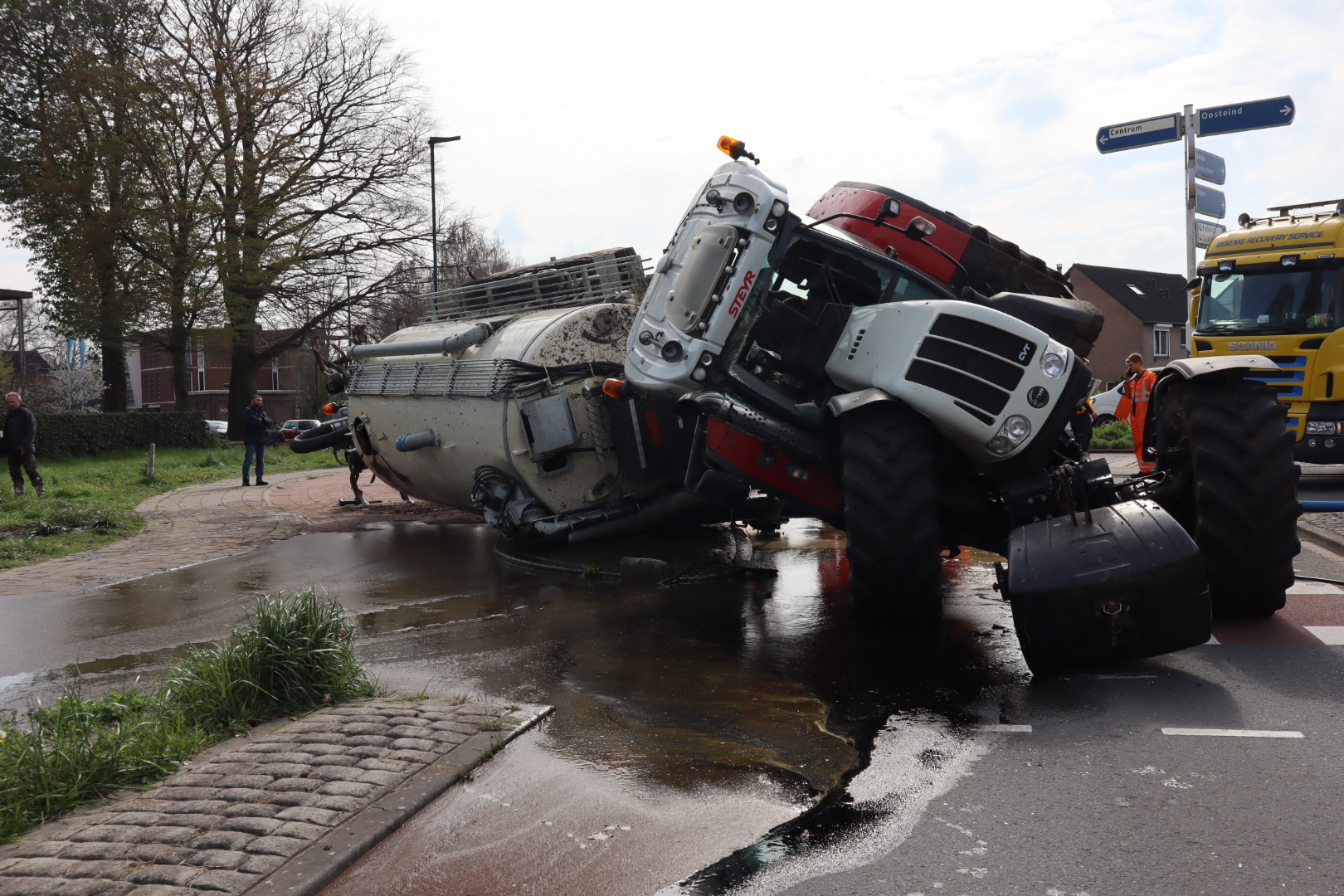 DONGEN – Op de rotonde bij de Lage Ham in Dongen is maandagmiddag een tractor met een grote giertank gekanteld.