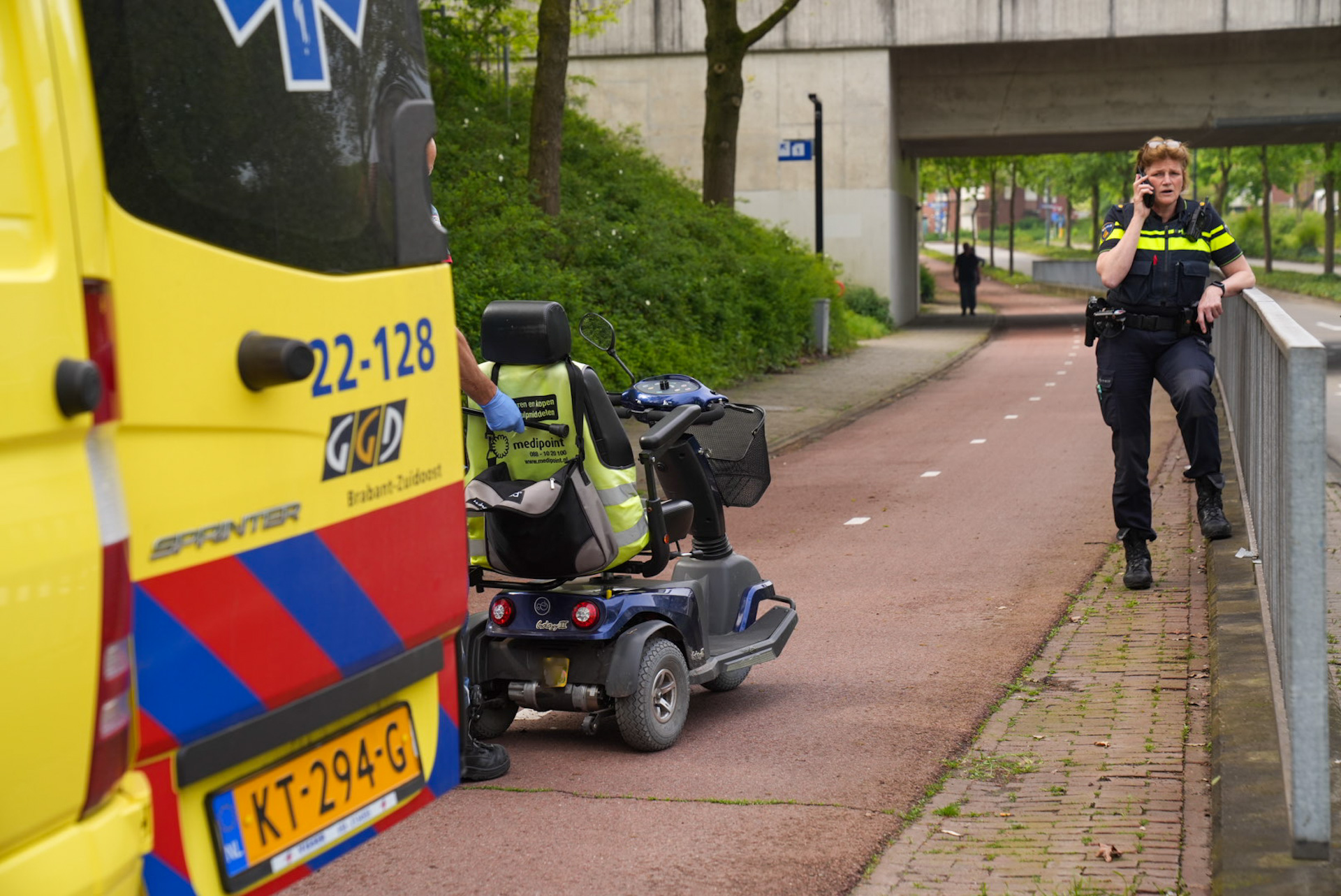 De vrouw viel met haar scootmobiel om toen ze een bocht wilde maken op het fietspad. Een omstander die het zag gebeuren verleende direct eerste hulp en belde de hulpdiensten.