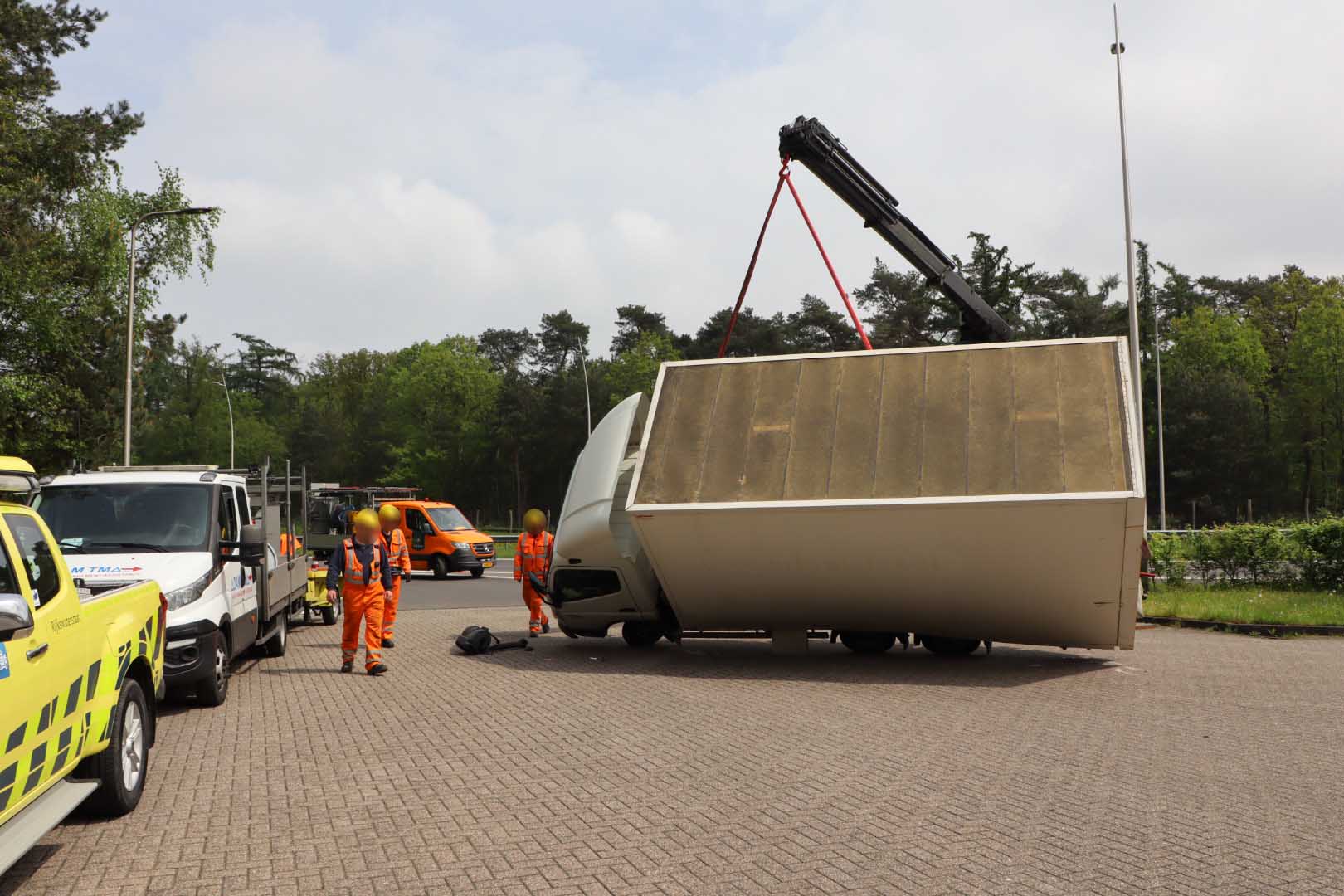 Vrachtwagentje komt op de zijkant terecht, bestuurder vermoedelijk onder invloed