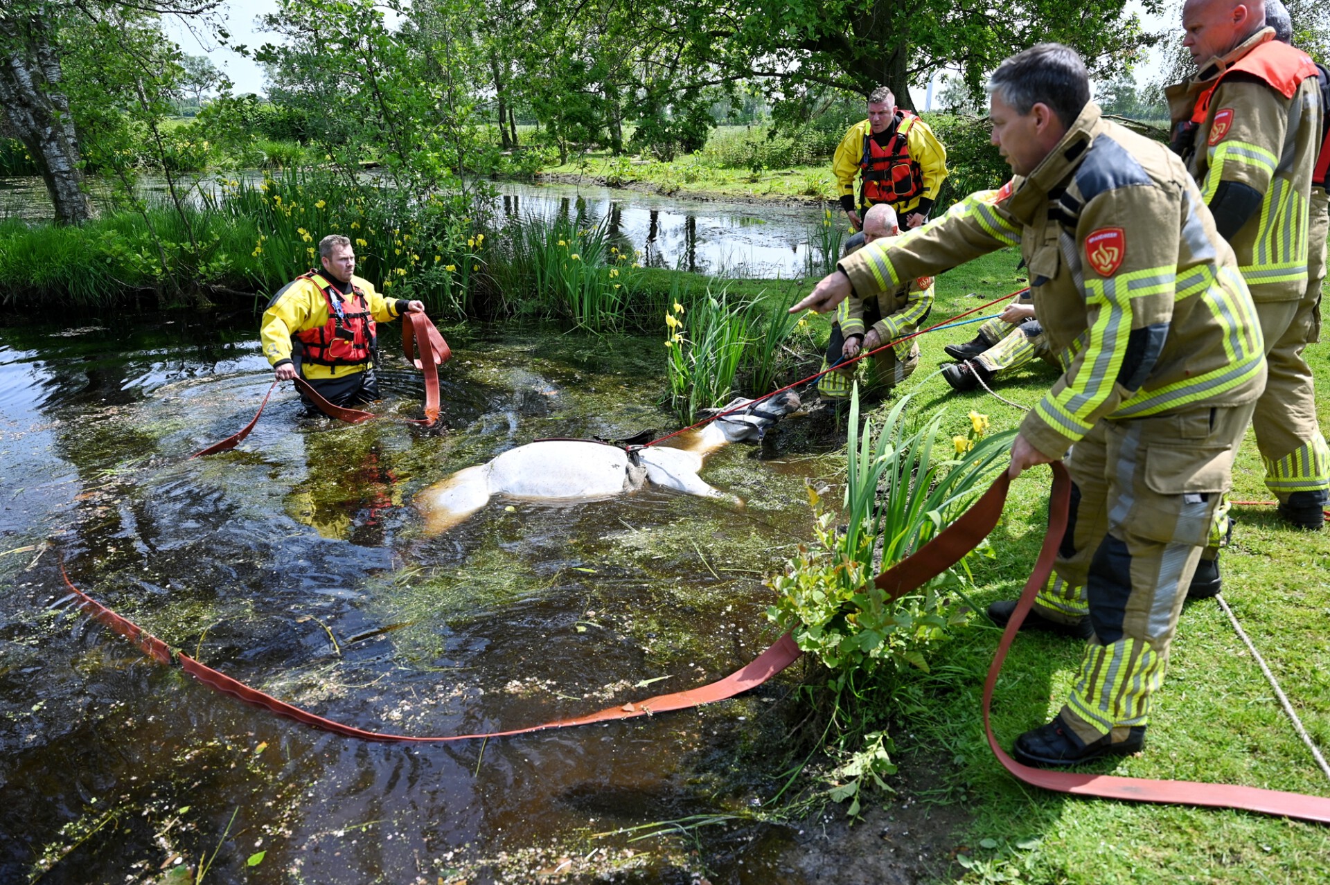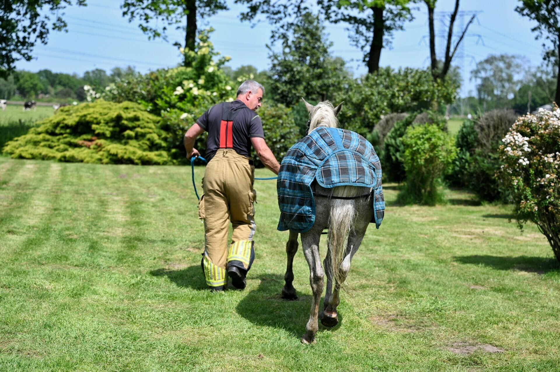 Met behulp van stevige brandweerslangen en touwen wist de brandweer het paard uit de vijver te halen. Het dier raakte niet gewond, maar was wel geschrokken. Om het paard op te warmen, werd er een deken om hem heen geslagen.