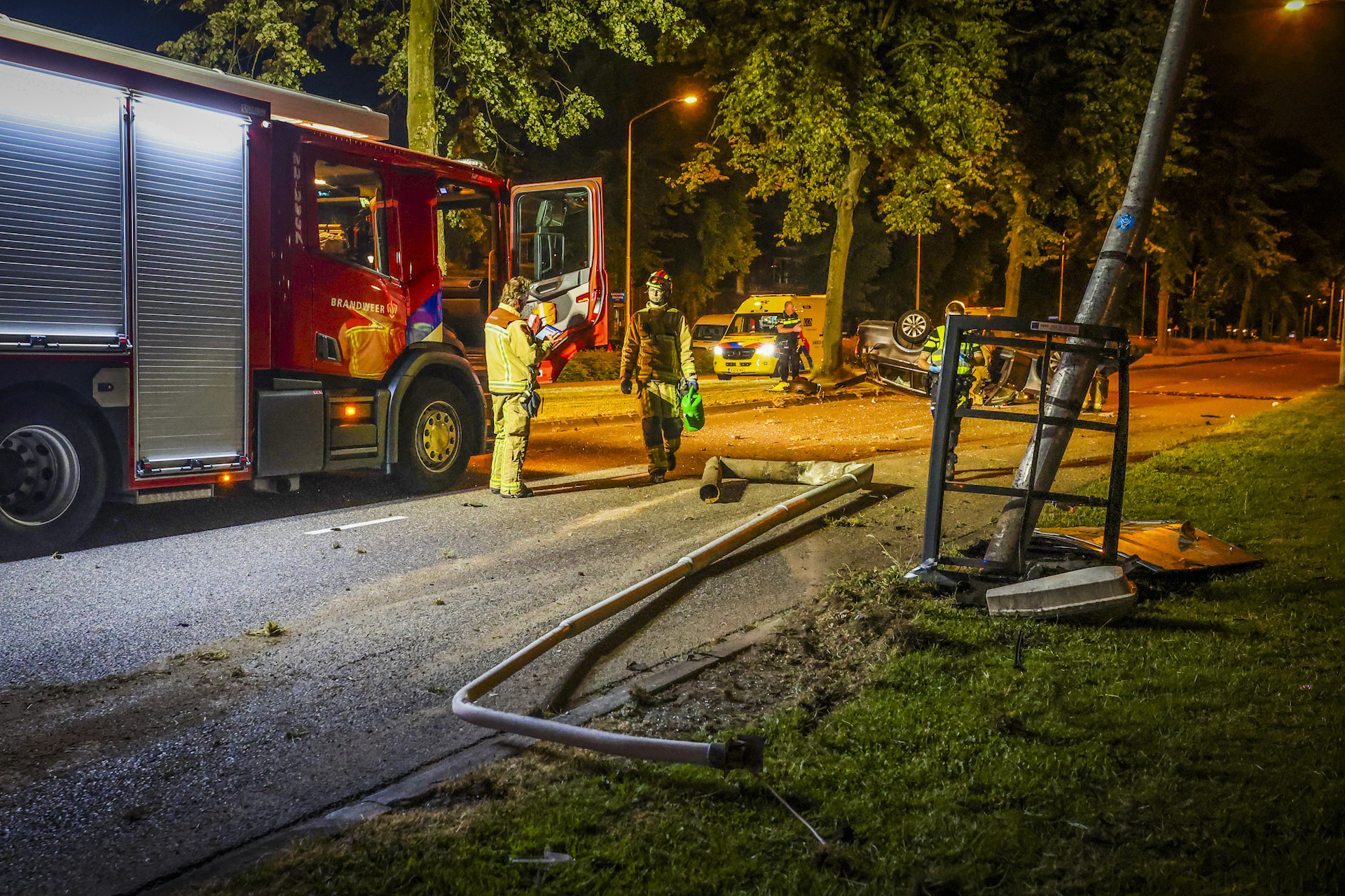 Automobilist ramt lantarenpalen en vliegt over de kop