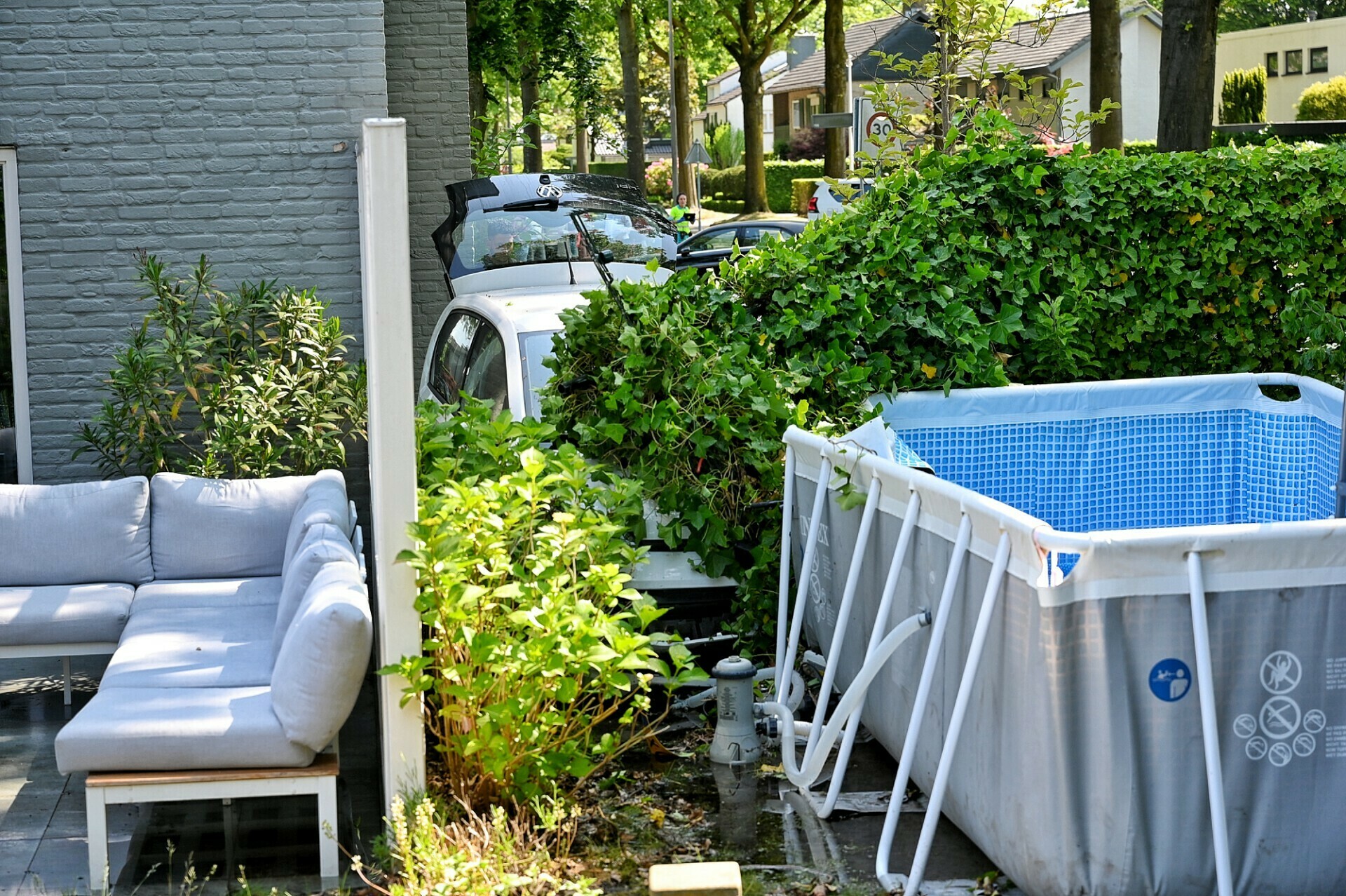 Omstreeks 10:45 uur werden de hulpdiensten opgeroepen voor het ongeval. Vermoedelijk door een voorrangsfout botste er twee auto’s tegen elkaar. Een van de auto’s reed meters verder door een heg van een woning, reed een boom uit de grond en botsten tegen de gevel van de woning. Door de klap kwam de auto ook half in de achtertuin terecht waar een zwembad opgesteld stond. Het zwembad raakte lek waarna het water wegstroomde. De vrouw in de auto is met onbekend letsel afgevoerd naar het ziekenhuis. De brandweer heeft de auto gestabiliseerd.