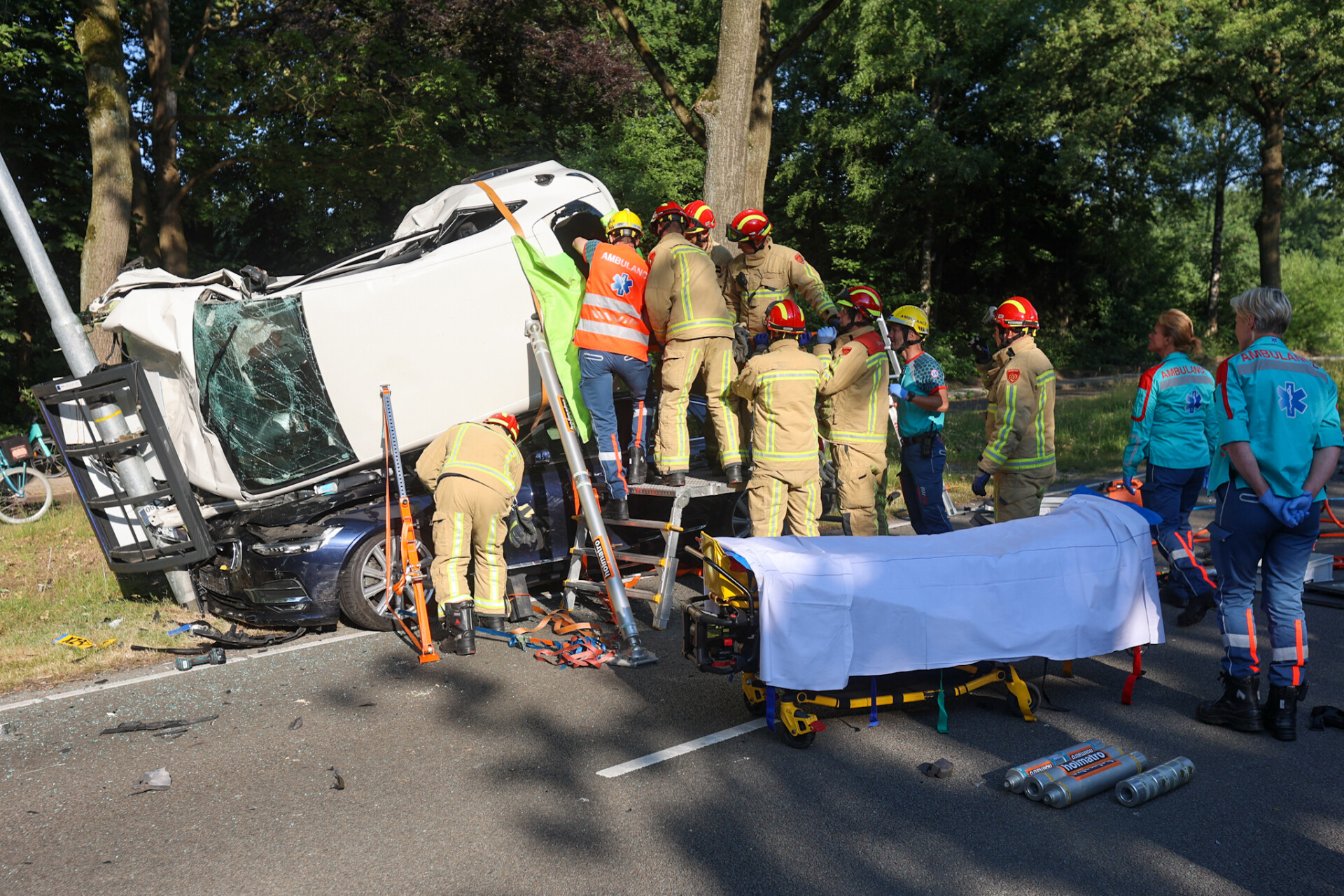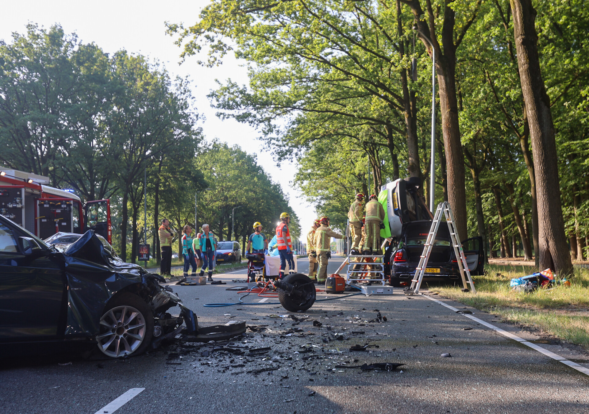 Twee van de auto’s zijn tegen een lantaarnpaal tot stilstand gekomen, terwijl een andere auto bovenop een van de beschadigde voertuigen terechtkwam. De brandweer moest uiteindelijk een van de bestuurders bevrijden.