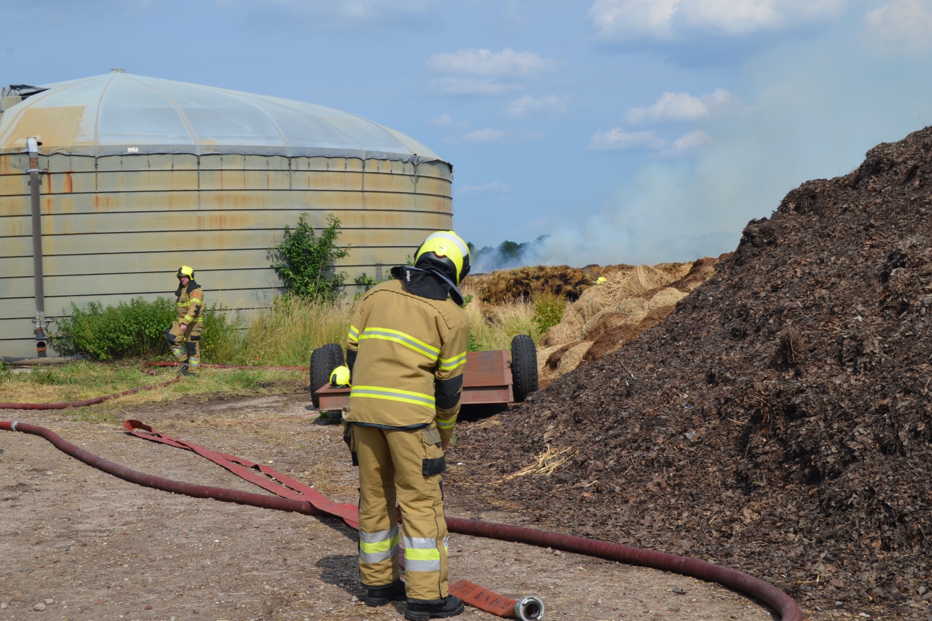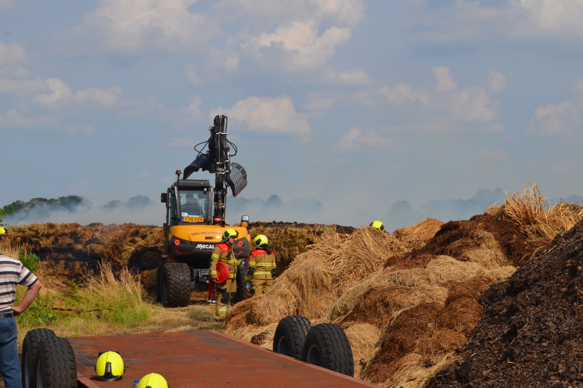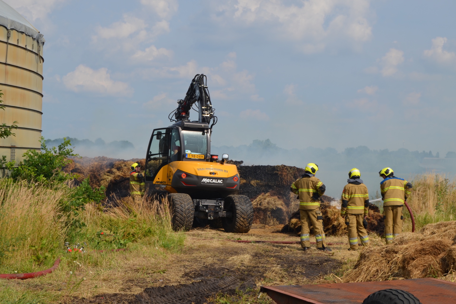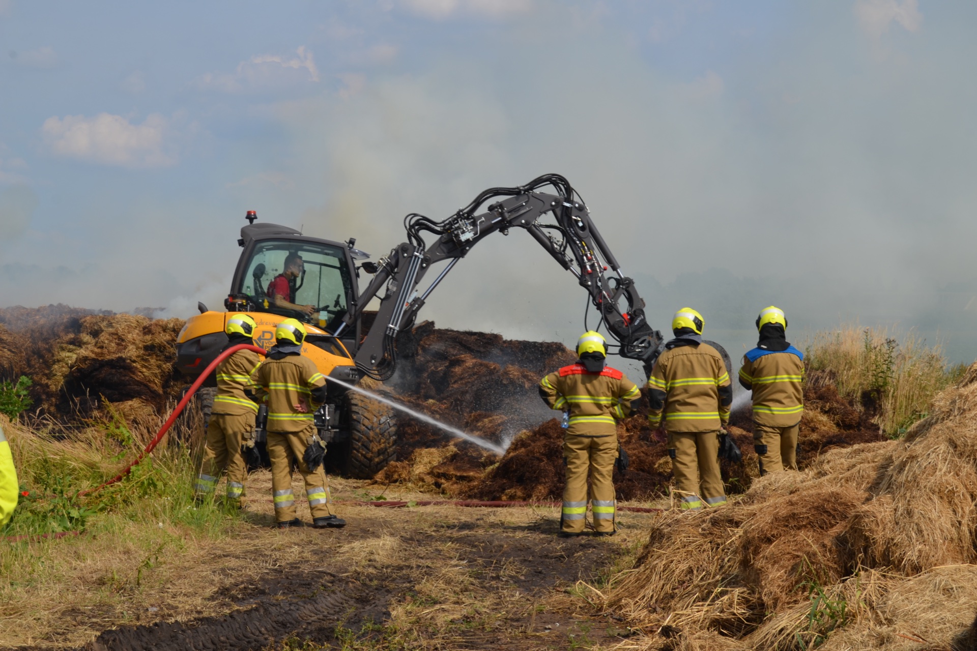 De brandweer heeft opgeschaald naar middelbrand en heeft extra blusvoertuigen, waterwagens en een kraan ingezet om het hooi uit elkaar te trekken. Vervolgens worden de hooirollen geblust door de brandweerlieden.