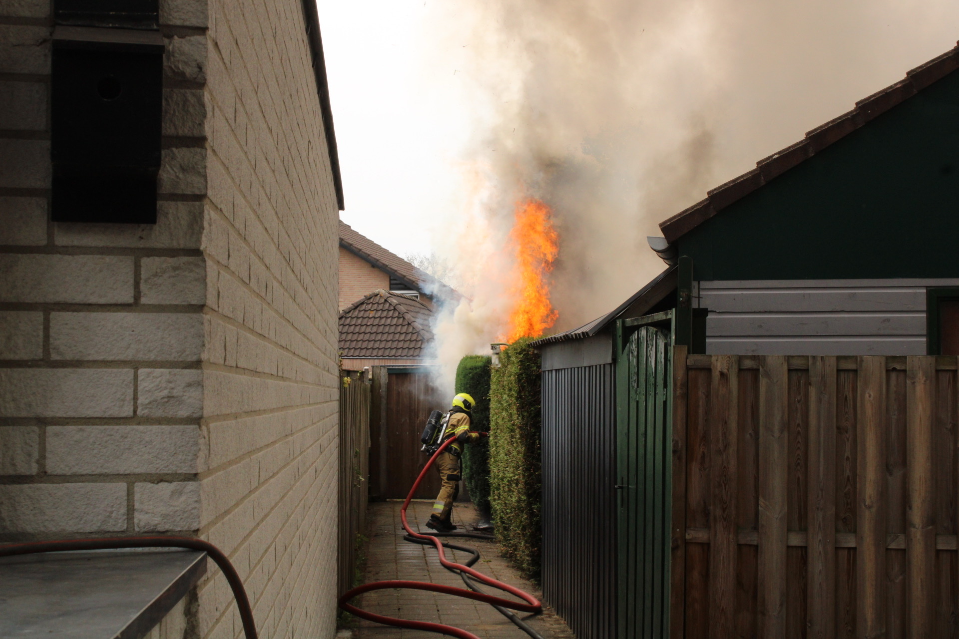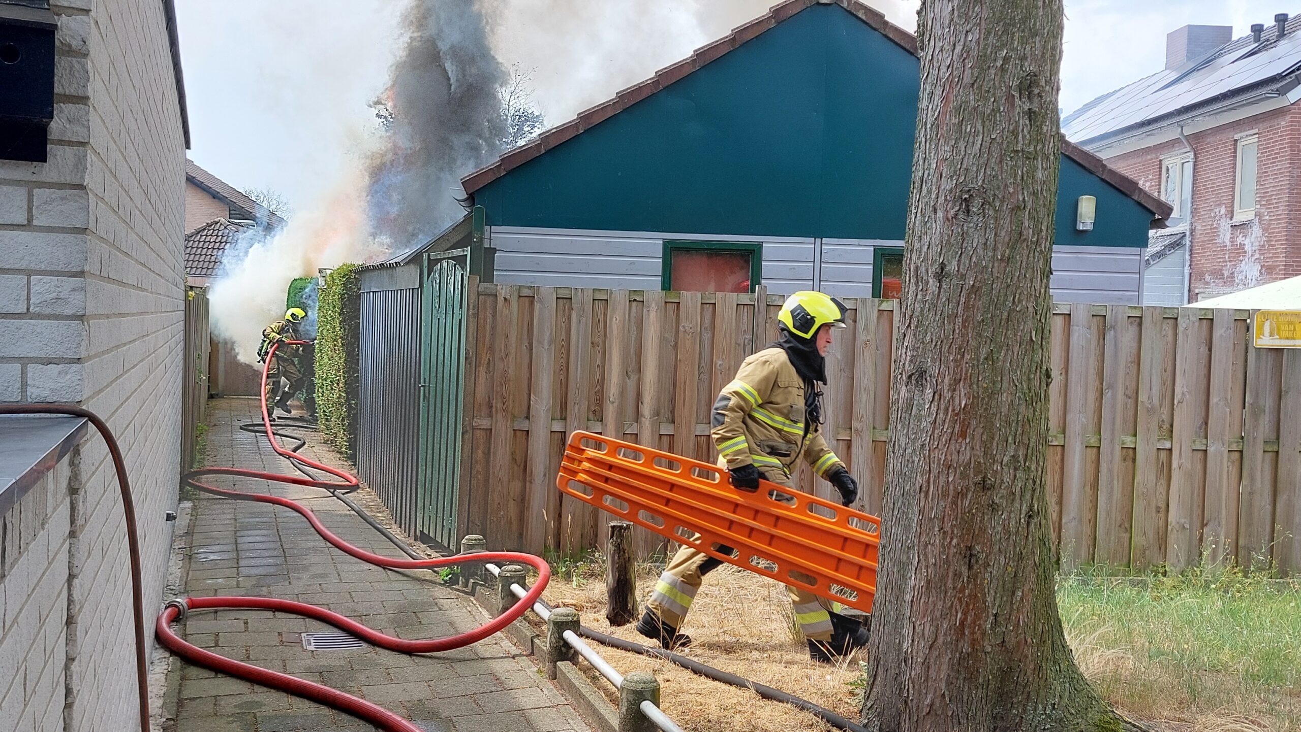 Rond 13.30 uur brak het vuur uit in een heg en een schuur. Een buurman heeft vermoedelijk rook ingeademd en is daarom overgebracht naar het ziekenhuis.
