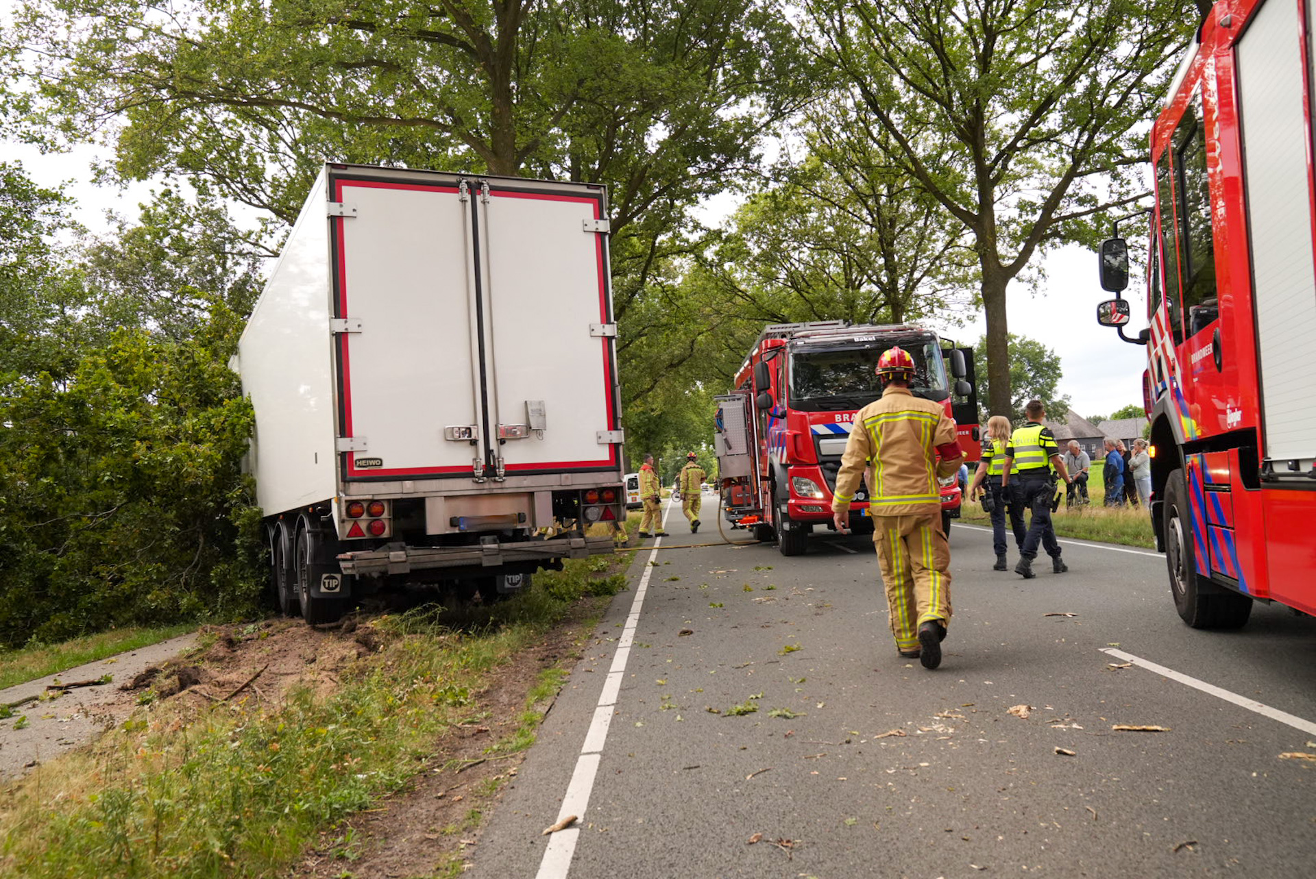 Een vrachtwagen is om onbekende redenen van de weg geraakt en tegen een boom tot stilstand gekomen. Als gevolg hiervan is de boom volledig uit de grond gekomen en onder de vrachtwagen beland. De chauffeur zat vast in zijn cabine en werd bevrijd door brandweer- en ambulancepersoneel.