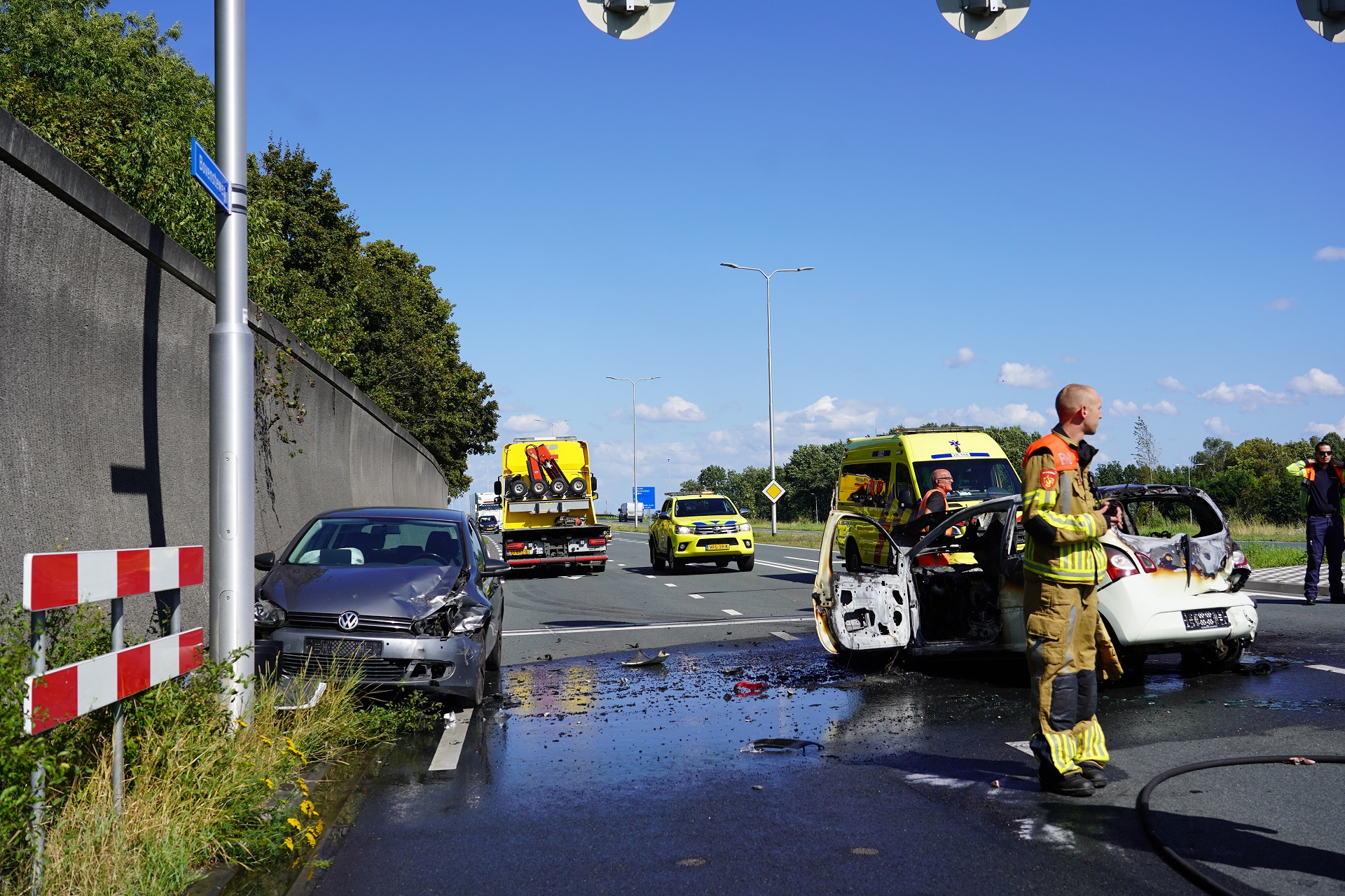 Auto vliegt in brand na botsing, bestuurder net op tijd eruit