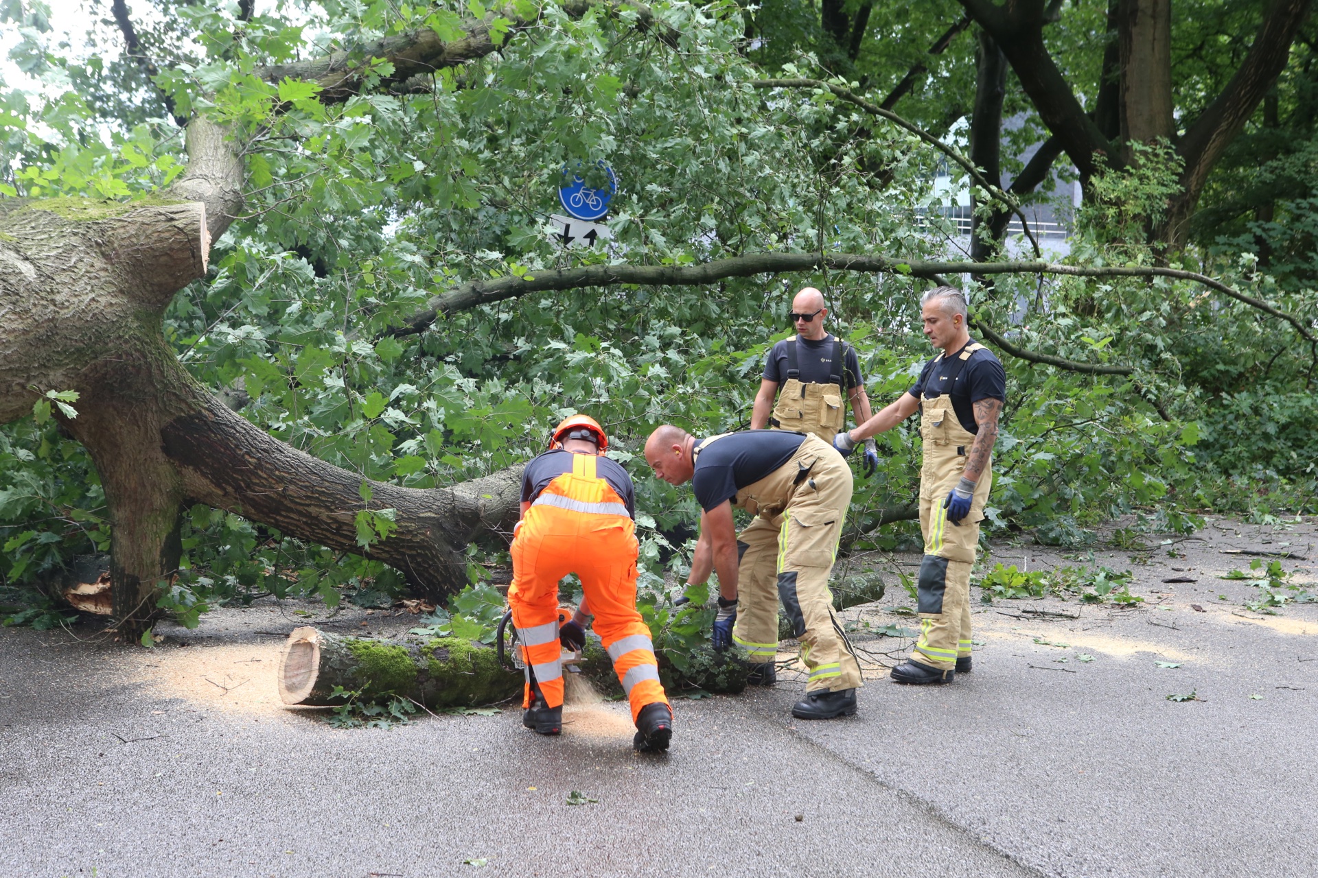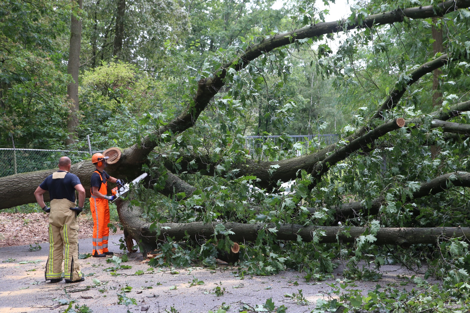 De brandweer zaagde de boom in stukken, die stukken worden door anderen in de berm gelegd. Tijdens de werkzaamheden kregen de brandweerlieden een flinke bui op hun dak.