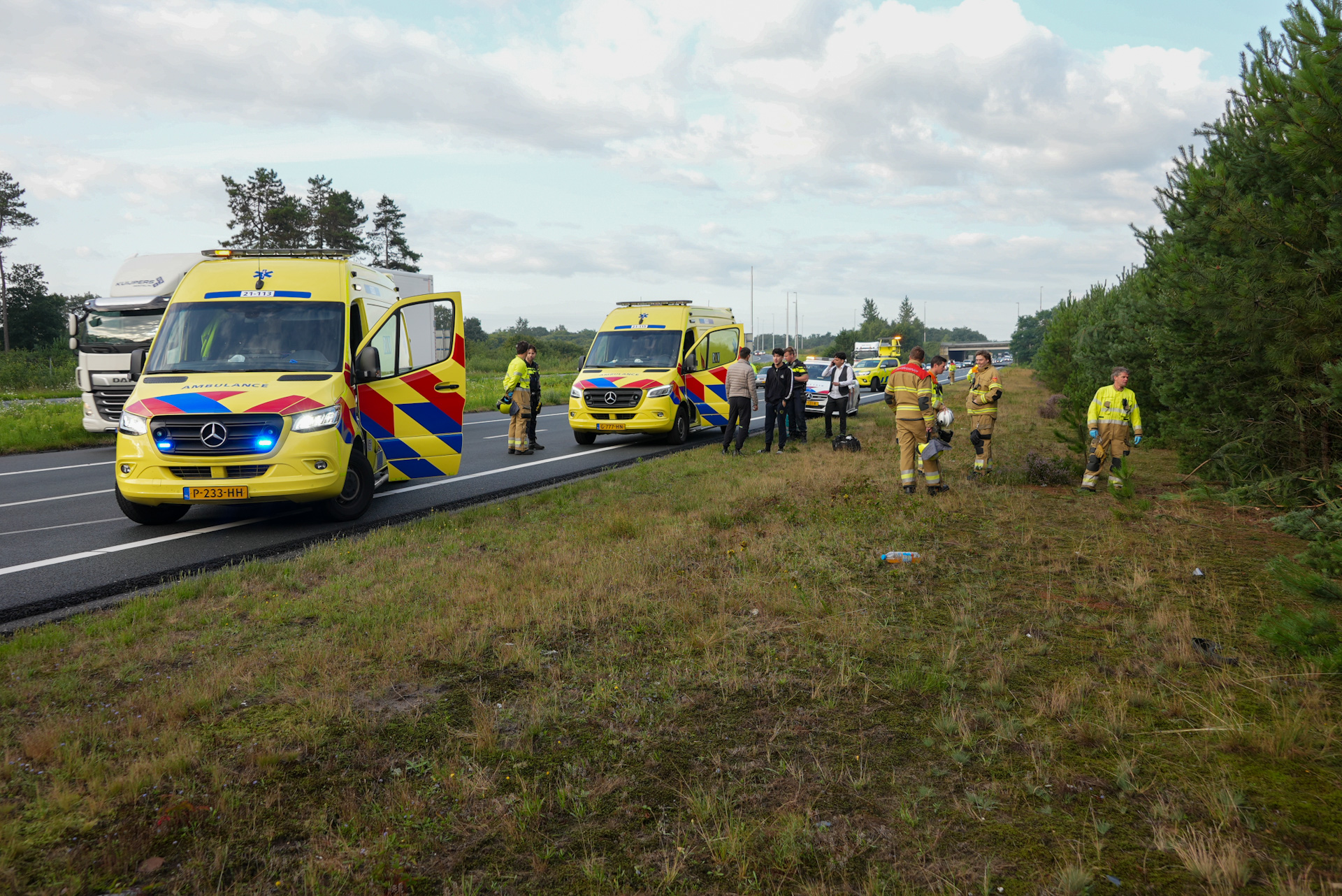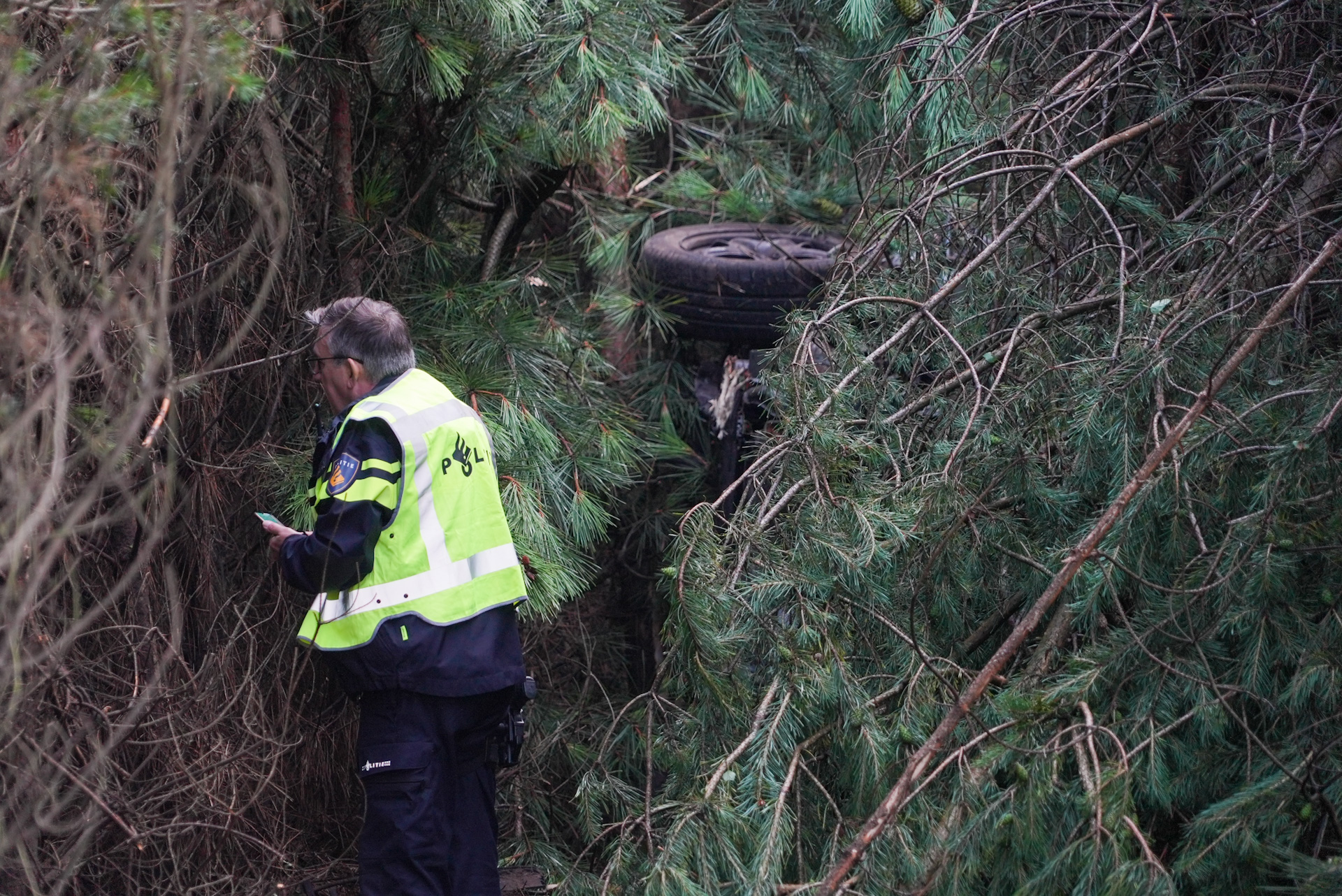 De aanrijding vond plaats tussen de auto en de voorligger, waarbij de schade aan de eerste auto betrekkelijk gering leek. Desondanks raakte de jonge bestuurder vervolgens de controle over het voertuig kwijt. De auto verliet de weg, doorkruiste een sloot en kwam zo’n twintig meter verderop in het bos op zijn zijkant terecht. Tijdens de koers werden enkele bomen geraakt en braken af, zoals te zien is op de foto’s waar het wrak grotendeels tussen de takken verscholen ligt.