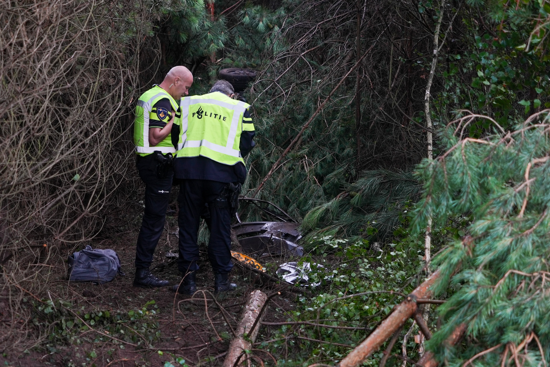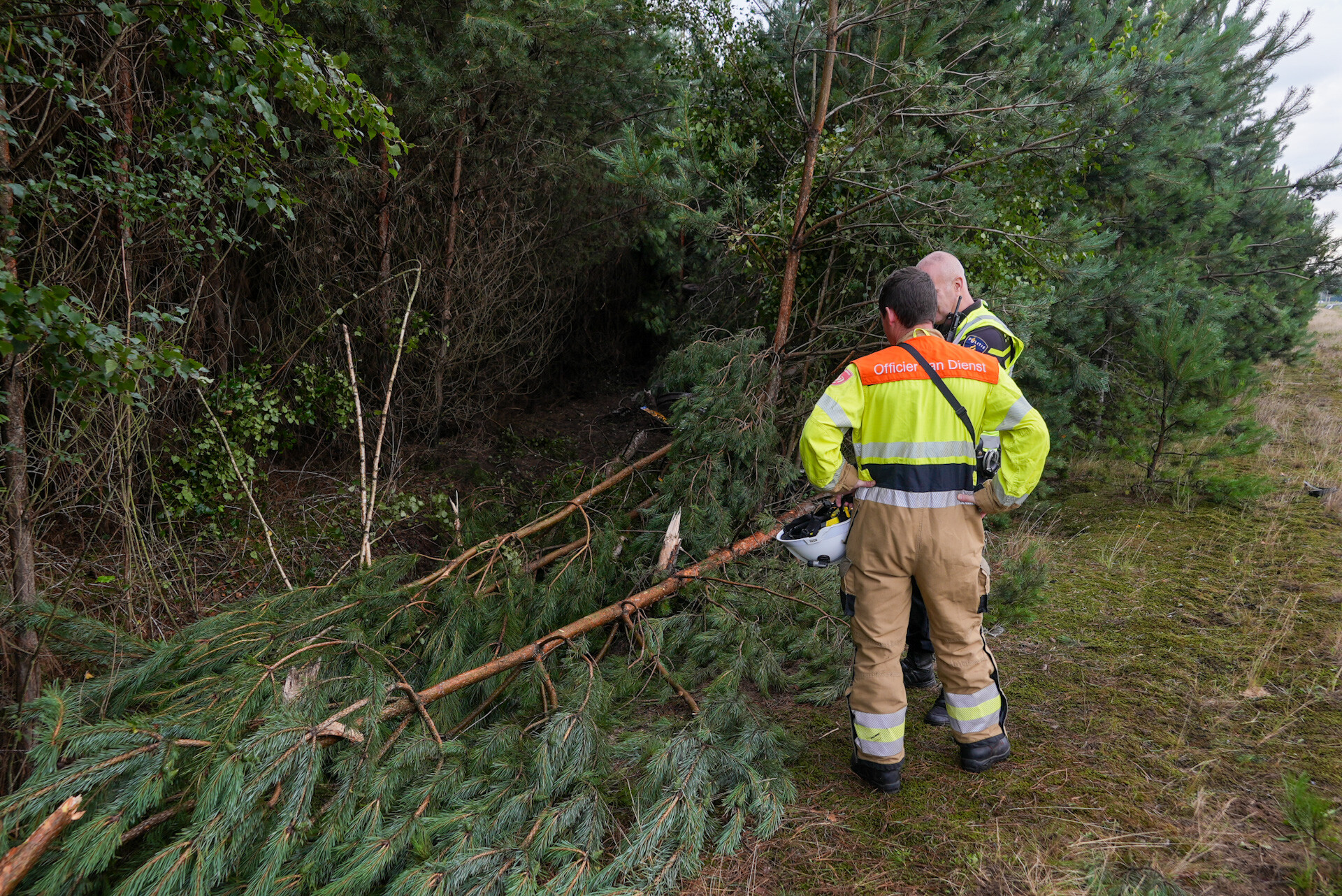 Ter voorzorg werden de mannen wel door een ambulance meegenomen, maar naar verwachting zullen ze snel weer naar huis mogen. De brandweer heeft de gebroken bomen in stukken gezaagd om het wrak te kunnen verwijderen.